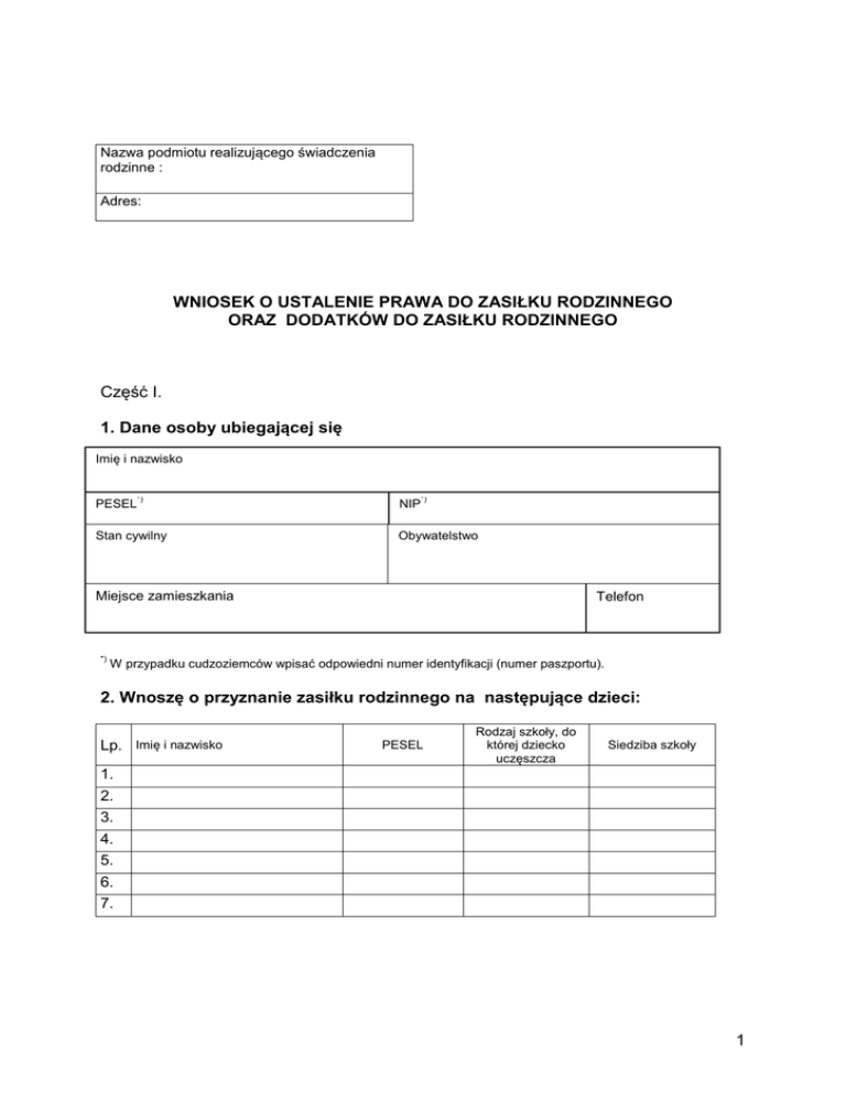 Załączniki do rozporządzenia Ministra Pracy i Polityki Społecznej z dnia 27 marca 2006 r. (poz. ) Załącznik nr 1 WZÓR Nazwa podmiotu realizującego świadczenia rodzinne : Adres: WNIOSEK O USTALENIE PRAWA DO ZASIŁKU RODZINNEGO ORAZ DODATKÓW DO ZASIŁKU RODZINNEGO Część I. 1. Dane osoby ubiegającej się Imię i nazwisko 1.Dane wnioskodawcy PESEL *) Stan cywilny NIP *) Obywatelstwo Miejsce zamieszkania *) Telefon W przypadku cudzoziemców wpisać odpowiedni numer identyfikacji (numer paszportu). 2. Wnoszę o przyznanie zasiłku rodzinnego na następujące dzieci: Lp. Imię i nazwisko PESEL Rodzaj szkoły, do której dziecko uczęszcza Siedziba szkoły 1. 2. 3. 4. 5. 6. 7. 1 oraz dodatków do zasiłku rodzinnego z tytułu: (zakreślić odpowiedni kwadrat i wpisać dane dzieci) urodzenia dziecka ..............................................................., ..................................................................... (imię i nazwisko dziecka) (imię i nazwisko dziecka) opieki nad dzieckiem w okresie korzystania z urlopu wychowawczego (należy wypełnić część II) ..............................................................., ..................................................................... (imię i nazwisko dziecka) (imię i nazwisko dziecka) samotnego wychowywania dziecka (dodatek przysługuje na dwoje dzieci); (należy wypełnić część III) na: ..............................................................., ..................................................................... (imię i nazwisko dziecka) (imię i nazwisko dziecka) wychowywania dziecka w rodzinie wielodzietnej (dodatek przysługuje na trzecie i każde kolejne dziecko uprawnione do zasiłku rodzinnego) na: ..............................................................., ..................................................................... (imię i nazwisko dziecka) (imię i nazwisko dziecka) ..............................................................., ..................................................................... (imię i nazwisko dziecka) (imię i nazwisko dziecka) kształcenia i rehabilitacji dziecka niepełnosprawnego ..............................................................., ..................................................................... (imię i nazwisko dziecka) (imię i nazwisko dziecka) rozpoczęcia roku szkolnego przez: ..............................................................., ..................................................................... (imię i nazwisko dziecka) (imię i nazwisko dziecka) ..............................................................., ..................................................................... (imię i nazwisko dziecka) (imię i nazwisko dziecka) podjęcia przez dziecko nauki w szkole poza miejscem zamieszkania ( na częściowe pokrycie wydatków związanych z zamieszkaniem w miejscowości, w której znajduje się siedziba szkoły ) ..............................................................., ..................................................................... (imię i nazwisko dziecka) (imię i nazwisko dziecka) 2 podjęcia przez dziecko nauki w szkole poza miejscem zamieszkania ( na pokrycie wydatków związanych z zapewnieniem dziecku możliwości dojazdu z miejsca zamieszkania do miejscowości, w której znajduje się siedziba szkoły ) ..............................................................., ..................................................................... (imię i nazwisko dziecka) (imię i nazwisko dziecka) samotnego wychowywania dziecka i utraty prawa do zasiłku dla bezrobotnych na skutek upływu ustawowego okresu jego pobierania (należy wypełnić część IV) na: ..............................................................., ..................................................................... (imię i nazwisko dziecka) (imię i nazwisko dziecka) 3. Dane członków rodziny (w tym dzieci do ukończenia 25 lat, a także dziecka, które ukończyło 25 rok życia legitymującego się orzeczeniem o znacznym stopniu niepełnosprawności, jeżeli w związku z tą niepełnosprawnością rodzinie przysługuje świadczenie pielęgnacyjne). Do składu rodziny nie wlicza się dziecka pozostającego pod opieką opiekuna prawnego. W skład rodziny wchodzą: 1 ............................................................................................................... ( imię i nazwisko stopień pokrewieństwa PESEL* ) 2 ............................................................................................................... ( imię i nazwisko stopień pokrewieństwa PESEL* ) 3 ............................................................................................................... ( imię i nazwisko stopień pokrewieństwa PESEL* ) 4 ............................................................................................................... ( imię i nazwisko stopień pokrewieństwa PESEL* ) 5 ............................................................................................................... ( imię i nazwisko *) stopień pokrewieństwa PESEL* ) W przypadku cudzoziemców wpisać odpowiedni numer identyfikacji (numer paszportu). 4. Inne dane 4.1 Łączna kwota alimentów świadczonych na rzecz innych osób wyniosła w roku .................*) ............... zł.....gr. 4.2 Łączna kwota opłat poniesionych z tytułu przebywania członka rodziny w instytucji zapewniającej całodobowe utrzymanie w roku .................*) wyniosła ............zł.....gr. 4.3 Dochód utracony z roku .................*) wyniósł ............... zł.....gr miesięcznie. 4.4 Dochód uzyskany w roku .................wyniósł ............... zł.....gr miesięcznie. ) * Wpisać rok, z którego dochód stanowi podstawę ustalenia dochodu rodziny. 3 Część II. Oświadczenie dotyczące ustalenia prawa do dodatku do zasiłku rodzinnego z tytułu opieki nad dzieckiem w okresie korzystania z 