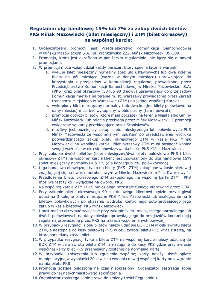 Regulamin ulgi handlowej 15% lub 7% za zakup dwóch biletów PKS Mińsk Mazowiecki (bilet miesięczny) i ZTM (bilet okresowy) na wspólnej karcie: 1. Organizatorem promocji jest Przedsiębiorstwo Komunikacji Samochodowej w Mińsku Mazowieckim S.A., ul. Warszawska 222, Mińsk Mazowiecki 05-300. 2. Promocja, która jest określona w poniższym regulaminie, nie łączy się z innymi promocjami. 3. W promocji może wziąć udział każdy pasażer, który spełnia łącznie warunki: a. wykupi bilet miesięczny normalny (bez ulg ustawowych) lub dwa kolejne bilety na pół miesiąca (ważne w danym miesiącu) uprawniające do korzystania z przejazdów w komunikacji regularnej prowadzonej przez Przedsiębiorstwo Komunikacji Samochodowej w Mińsku Mazowieckim S.A. (PKS) oraz bilet okresowy (30 lub 90 dniowy) uprawniający do przejazdów komunikacją miejską na terenie m. st. Warszawy prowadzonej przez Zarząd transportu Miejskiego w Warszawie (ZTM) na jednej wspólnej Karcie; b. wykupiony bilet miesięczny normalny (lub dwa kolejne bilety połówkowe na dany miesiąc) musi być wykupiony w obie strony (tam i powrót); c. promocja dotyczy biletów, które mają początek na terenie Miasta albo Gminy Mińsk Mazowiecki lub relacja przebiega przez Mińsk Mazowiecki. Z promocji wyłączone są kursy przebiegające przez Stanisławów; d. możliwy jest późniejszy zakup biletu miesięcznego lub połówkowych PKS Mińsk Mazowiecki ze wspomnianym upustem po przedstawieniu wydruku potwierdzającego zakup biletu okresowego ZTM w kasie PKS Mińsk Mazowiecki na wspólnej karcie. Bilet okresowy ZTM musi posiadać koniec swojej ważności w okresie obowiązywania biletu PKS Mińsk Mazowiecki. 4. Przy zakupie dwóch biletów (bilet miesięczny/dwa bilety połówkowe PKS i bilet okresowy ZTM) na wspólnej karcie klient jest upoważniony do ulgi handlowej 15% (bilet miesięczny normalny) lub 7% (dla każdego biletu połówkowego). 5. Ulga handlowa obowiązuje tylko na bilety (PKS i ZTM) zakupione w kasie biletowej znajdującej się na dworcu autobusowym w Mińsku Mazowieckim Plac Dworcowy 1. 6. Przedłużenie biletu okresowego ZTM zakupionego na wspólną kartę ZTM i PKS możliwe jest tylko i wyłącznie na dworcu PKS. 7. Na wspólnej karcie ZTM i PKS nie działają pozostałe funkcje oferowane przez ZTM. 8. Przy zakupie biletu okresowego 90-cio dniowego klientowi będzie przysługiwał upust na 3 kolejne bilety miesięczne PKS Mińsk Mazowiecki lub analogicznie na 6 biletów połówkowych po okazaniu wydruku kontrolnego potwierdzającego jego zakup w kasie biletowej PKS Mińsk Mazowiecki 9. Upust można otrzymać wyłącznie przy zakupie biletu miesięcznego normalnego lub dwóch połówkowych na dany miesiąc uprawniającego do przejazdów komunikacją regularną prowadzoną przez PKS na trasach wspomnianych powyżej. 10. W przypadku rezygnacji z obu biletów należy udać się BOK ZTM w celu zwrotu biletu ZTM, a następnie do kasy biletowej PKS w celu zwrotu biletu PKS wraz z Kartą, na którą sprzedany został bilet. 11. W przypadku rezygnacji tylko z biletu ZTM na wspólnej karcie należy udać się do BOK ZTM w celu zwrotu biletu ZTM, a następnie do kasy PKS gdzie przy zwrocie wspólnej karty bilet PKS przeniesiony zostanie na normalną Kartę. 12. W przypadku zniszczenia lub zgubienia wspólnej karty należy uiścić opłatę manipulacyjną w wysokości 20 zł w celu wydania nowej wspólnej karty oraz wgranie na nią biletu PKS. 13. Promocja zostaje ogłoszona na czas nieokreślony. Organizator zastrzega sobie prawo do jej natychmiastowego zakończenia. 14. Organizator zastrzega sobie prawo do zmiany treści Regulaminu.
