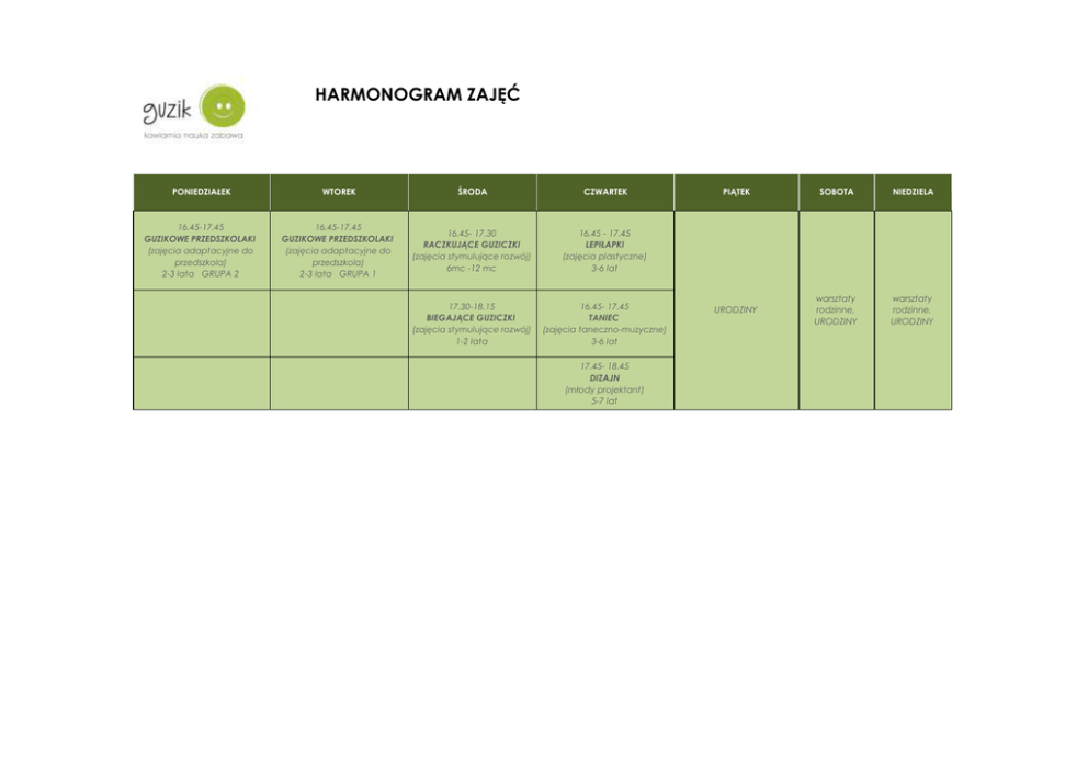 HARMONOGRAM ZAJĘĆ PONIEDZIAŁEK WTOREK ŚRODA CZWARTEK 16.45-17.45 GUZIKOWE PRZEDSZKOLAKI (zajęcia adaptacyjne do przedszkola) 2-3 lata GRUPA 2 16.45-17.45 GUZIKOWE PRZEDSZKOLAKI (zajęcia adaptacyjne do przedszkola) 2-3 lata GRUPA 1 16.45- 17.30 RACZKUJĄCE GUZICZKI (zajęcia stymulujące rozwój) 6mc -12 mc 16.45 - 17.45 LEPIŁAPKI (zajęcia plastyczne) 3-6 lat 17.30-18.15 BIEGAJĄCE GUZICZKI (zajęcia stymulujące rozwój) 1-2 lata 16.45- 17.45 TANIEC (zajęcia taneczno-muzyczne) 3-6 lat 17.45- 18.45 DIZAJN (młody projektant) 5-7 lat PIĄTEK SOBOTA NIEDZIELA URODZINY warsztaty rodzinne, URODZINY warsztaty rodzinne, URODZINY