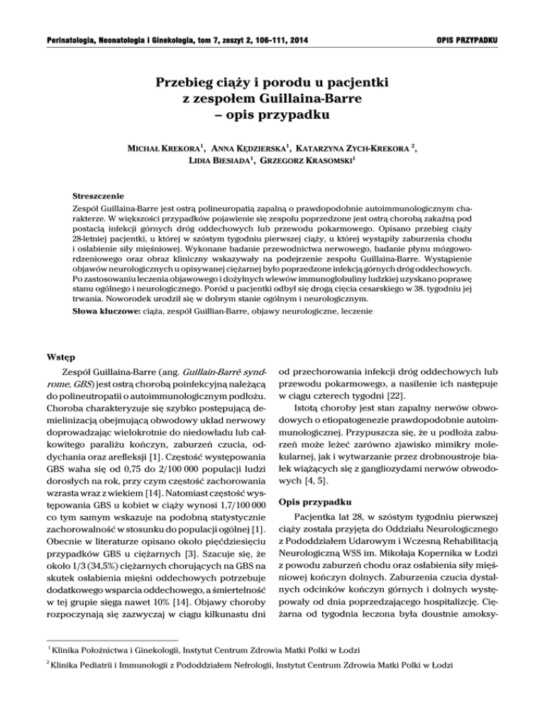 Perinatologia, Neonatologia i Ginekologia, tom 7, zeszyt 2, 106-111, 2014 OPIS PRZYPADKU Przebieg ciąży i porodu u pacjentki z zespołem Guillaina-Barre – opis przypadku MICHAŁ KREKORA1, ANNA KĘDZIERSKA1, KATARZYNA ZYCH-KREKORA 2, LIDIA BIESIADA1, GRZEGORZ KRASOMSKI1 Streszczenie Zespół Guillaina-Barre jest ostrą polineuropatią zapalną o prawdopodobnie autoimmunologicznym charakterze. W większości przypadków pojawienie się zespołu poprzedzone jest ostrą chorobą zakaźną pod postacią infekcji górnych dróg oddechowych lub przewodu pokarmowego. Opisano przebieg ciąży 28-letniej pacjentki, u której w szóstym tygodniu pierwszej ciąży, u której wystąpiły zaburzenia chodu i osłabienie siły mięśniowej. Wykonane badanie przewodnictwa nerwowego, badanie płynu mózgowordzeniowego oraz obraz kliniczny wskazywały na podejrzenie zespołu Guillaina-Barre. Wystąpienie objawów neurologicznych u opisywanej ciężarnej było poprzedzone infekcją górnych dróg oddechowych. Po zastosowaniu leczenia objawowego i dożylnych wlewów immunoglobuliny ludzkiej uzyskano poprawę stanu ogólnego i neurologicznego. Poród u pacjentki odbył się drogą cięcia cesarskiego w 38. tygodniu jej trwania. Noworodek urodził się w dobrym stanie ogólnym i neurologicznym. Słowa kluczowe: ciąża, zespół Guillian-Barre, objawy neurologiczne, leczenie Wstęp Zespół Guillaina-Barre (ang. Guillain-Barrě syndrome, GBS) jest ostrą chorobą poinfekcyjną należącą do polineutropatii o autoimmunologicznym podłożu. Choroba charakteryzuje się szybko postępującą demielinizacją obejmującą obwodowy układ nerwowy doprowadzając wielokrotnie do niedowładu lub całkowitego paraliżu kończyn, zaburzeń czucia, oddychania oraz arefleksji [1]. Częstość występowania GBS waha się od 0,75 do 2/100 000 populacji ludzi dorosłych na rok, przy czym częstość zachorowania wzrasta wraz z wiekiem [14]. Natomiast częstość występowania GBS u kobiet w ciąży wynosi 1,7/100 000 co tym samym wskazuje na podobną statystycznie zachorowalność w stosunku do populacji ogólnej [1]. Obecnie w literaturze opisano około pięćdziesięciu przypadków GBS u ciężarnych [3]. Szacuje się, że około 1/3 (34,5%) ciężarnych chorujących na GBS na skutek osłabienia mięśni oddechowych potrzebuje dodatkowego wsparcia oddechowego, a śmiertelność w tej grupie sięga nawet 10% [14]. Objawy choroby rozpoczynają się zazwyczaj w ciągu kilkunastu dni od przechorowania infekcji dróg oddechowych lub przewodu pokarmowego, a nasilenie ich następuje w ciągu czterech tygodni [22]. Istotą choroby jest stan zapalny nerwów obwodowych o etiopatogenezie prawdopodobnie autoimmunologicznej. Przypuszcza się, że u podłoża zaburzeń może leżeć zarówno zjawisko mimikry molekularnej, jak i wytwarzanie przez drobnoustroje białek wiążących się z gangliozydami nerwów obwodowych [4, 5]. Opis przypadku Pacjentka lat 28, w szóstym tygodniu pierwszej ciąży została przyjęta do Oddziału Neurologicznego z Pododdziałem Udarowym i Wczesną Rehabilitacją Neurologiczną WSS im. Mikołaja Kopernika w Łodzi z powodu zaburzeń chodu oraz osłabienia siły mięśniowej kończyn dolnych. Zaburzenia czucia dystalnych odcinków kończyn górnych i dolnych występowały od dnia poprzedzającego hospitalizcję. Ciężarna od tygodnia leczona była doustnie amoksy- 1 Klinika Położnictwa i Ginekologii, Instytut Centrum Zdrowia Matki Polki w Łodzi 2 Klinika Pediatrii i Immunologii z Pododdziałem Nefrologii, Instytut Centrum Zdrowia Matki Polki w Łodzi Przebieg ciąży i porodu u pacjentki z zespołem Guillaina-Barre – opis przypadku cyliną z powodu infekcji górnych dróg oddechowych. Ponadto pacjentka otrzymywała przed dwoma laty antybiotyki z powodu ukąszenia przez kleszcza i wystąpienia rumienia średnicy około 7 mm. W chwili przyjęcia chora była przytomna, w pełnym kontakcie logiczno-słownym. W badaniu neurologicznym stwierdzono obustronne zaburzenia czucia powierzchownego w dystalnych odcinkach kończyn, brak odruchów w kończynach dolnych, niedowład proksymalny kończyn dolnych oraz niedowład dystalny kończyn górnych wraz z ataksją. Po dwunastu godzinach od przyjęcia do oddziału u pacjentki wystąpiła nasilająca się duszność, drętwienie wargi dolnej, a następnie trudności w połykaniu pokarmów. Ze względu na podejrzenie ostrej zapalnej poliradikuloneropatii demielinizacyjnej – zespołu GuillainaBarre wykonano punkcję lędźwiową, uzyskując bezbarwny przejrzysty płyn mózgowo-rdzeniowy, w którym stwierdzono: zwiększoną cytozę – 17 komórek/μl (norma: do 5 komórek/μl), białko 380 mg/l (norma: 150-450 mg/l), odczyn Pandy’ego ujemny, odczyn Appelta ujemny, glukoza 69,0 mg/dl (norma: 45,0-75,0 mg/dl). Z uwagi na objawy nasilającej się duszności, drętwienie wargi dolnej, niedowład kończyn dolnych oraz narastające zagrożenie życia zdecydowano po uzyskaniu zgody chorej o włączeniu dożylnego leczenia immunoglobuliną ludzką (IVIG) w dawce 0,4 g/kg, to jest 25 g/dobę przez pięć dni. Ponadto wdrożono profilaktykę przeciwzakrzepową i antybiotykoterapię. W drugiej dobie hospitalizacji wykonano badanie przewodnictwa nerwowego, w którym stwierdzono aksonalno-demielinizacyjne uszkodzenie włókien ruchowych i czuciowych obu nerwów pośrodkowych oraz uszkodzenie włókien czuciowych prawego nerwu łydkowego o charakterze demielinizacyjnym. Nie uzyskano odpowiedzi elektrofizjologicznej oraz klinicznej podczas stymulacji obu nerwów piszczelowych i strzałkowych. Podczas stymulacji obu nerwów strzałkowych badanie przewodnictwa wykazało aksonalno-demielinizacyjne uszkodzenie włókien ruchowych obu nerwów strzałkowych. Badanie elektromiograficzne wykazało cechy polineuropatii ruchowo-czuciowej o charakterze aksonalno-demielinizacyjnym. W trakcie badania neurologicznego w drugiej dobie hospitalizacji stwierdzono obecność dodatniego objawu s