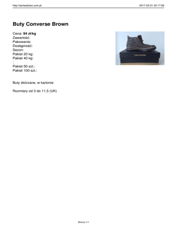 http://taniaodziez.com.pl 2017-03-01 22:17:06 Buty Converse Brown Cena: 94 zł/kg Zawartość: Pakowanie: Dostępność: Sezon: Pakiet 20 kg: Pakiet 40 kg: : Pakiet 50 szt.: Pakiet 100 szt.: Buty skórzane, w kartonie Rozmiary od 3 do 11,5 (UK) Strona 1/1