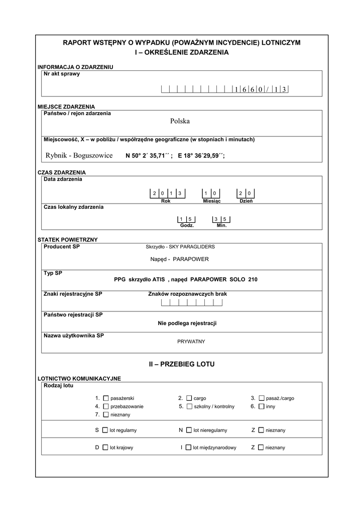 RAPORT WSTĘPNY O WYPADKU (POWAŻNYM INCYDENCIE) LOTNICZYM I – OKREŚLENIE ZDARZENIA INFORMACJA O ZDARZENIU Nr akt sprawy 1 6 6 0 / 1 3 MIEJSCE ZDARZENIA Państwo / rejon zdarzenia Polska Miejscowość, X – w pobliżu / współrzędne geograficzne (w stopniach i minutach) N 50° 2´ 35,71´´ ; E 18° 36´29,59´´; Rybnik - Boguszowice CZAS ZDARZENIA Data zdarzenia 2 0 1 3 1 Rok 0 Miesiąc 2 0 Dzień Czas lokalny zdarzenia 1 5 Godz. STATEK POWIETRZNY Producent SP 3 5 Min. Skrzydło - SKY PARAGLIDERS Napęd - PARAPOWER Typ SP PPG skrzydło ATIS , napęd PARAPOWER SOLO 210 Tekst brak otwarty Znaków rozpoznawczych Znaki rejestracyjne SP Państwo rejestracji SP Nie podlega rejestracji Nazwa użytkownika SP PRYWATNY II – PRZEBIEG LOTU LOTNICTWO KOMUNIKACYJNE Rodzaj lotu 1. pasażerski 2. cargo 3. pasaż./cargo 4. 7. przebazowanie 5. szkolny / kontrolny 6. inny S lot regularny N lot nieregularny Z nieznany D lot krajowy lot międzynarodowy Z nieznany nieznany I LOTNICTWO OGÓLNEGO PRZEZNACZENIA Rodzaj lotu Szkolny lub treningowy 10. z instruktorem 1Y. inny 11. samodzielny Niehandlowy 20. w celach własnych 23. specjalny 2Z. nieznany 21. 24. służbowy 22. nad otwartym morzem 2Y. rządowy inny Handlowy 30. lot agro 33. lot reklamowy 36. transport drewna 31. 34. 37. lot gaśniczy 32. z ładunkiem podwiesz. I 35. nad otwartym morzem 3Y lot obserwacyjny lot sanitarny inny Loty różne 40. lot badawczy 43. lot poszukiwawczy 4Y. inny 41. 44. 4Z. nielegalny pokazowy / sportowy nieznany 42. 45. przebazowanie akwizyc./ pokaz. spółka sprzedaż / wynajem 3. Y. przeds. Państw. inny 12. kontrolny Rodzaj użytkownika aeroklub / szkoła lotn. użytk. Prywatny nieznany 1. 4. Z. 2. 5. TRASA LOTU Ostatni punkt odlotu R Y B N I K - B O G U S Z O W I C E Nazwa miejscowości w pisowni lokalnej – litery łacińskie Czy: taki sam jak nazwa miejscowości, w której zaistniało zdarzenie S Planowany punkt docelowy Nazwa miejscowości w pisowni lokalnej – litery łacińskie Czy: S taki sam jak nazwa miejscowości, w której zaistniało zdarzenie Długotrwałość lotu 0 0 3 5 DO DNIA RAPORTU WSTĘPNEGO NIE USTALONO zdarzenie zaistniało na ziemi III – OBRAŻENIA CIAŁA Załoga Śmiertelne Poważne Nieznaczne 1 Pasażerowie Osoby postronne Uwaga: Dane wiadome w dniu pisania raportu 2 Nie było Nieznane IV – USZKODZENIA Uszkodzenia statku powietrznego D zniszczony S poważnie uszkodzony M nieznacznie uszkodzony N nie było Z nie ustalono V – INFORMACJA METEOROLOGICZNA Ogólna sytuacja meteorologiczna 1 VMC 2 IMC Z nie ustalono Warunki oświetlenia 1 świt 2 oświetlenie dzienne 3 zmierzch 4 noc księżycowa 5 noc ciemna Z nie ustalono KOLEJNOŚĆ WYSTĘPOWANIA WYDARZEŃ KOLEJNOŚĆ ZDARZEŃ: ETAP LOTU: -Start PPG z łąki koło Rybnika - Boguszowice. -Odlot w kierunku lotniska Gotartowice. -Przelot z kursem wschodnim w rejonie cmentarza komunalnego w Rybniku, mocne kołysanie PPG. -Zakręt w kierunku południowym pod wiatr. -Zwiększenie obrotów silnika, wznoszenie, odlot w kierunku Boguszowic. -Dolot do miejsca startu z kierunku północnego. -Podejście do lądowania. -Wejście PPG w spiralne opadanie. -Upadek pilota na ziemię . -Akcja ratownicza, transport śmigłowcem LPR do szpitala. -Zgon pilota w szpitalu. Podejście do lądowania 3 CZĘŚĆ OPISOWA: Około godziny 15:00 pilot PPG wystartował z łąki przy ul. Rajskiej w Rybniku, po zakręcie w lewo odleciał w kierunku lotniska Gotartowice. Około godziny 15:25 na wysokości około 50m przeleciał nad parkingiem cmentarza komunalnego w Rybniku. Według świadka” bardzo nim huśtało, a po zakręcie pod wiatr stanął w miejscu”. Po zakręcie pilot zwiększył obroty i zaczął się wznosić. Skrzydło się ustabilizowało. Około godziny15:35 PPG znalazło się w rejonie garaży przy ul. Rajskiej. Pilot prawdopodobnie rozpoczął podejście do lądowania. Na wysokości około 7 – 10 m PPG gwałtownie przechyliło się w prawo i w spiralnym opadaniu uderzyło o ziemię. Według zeznania świadka, pilot był przytomny. Pogotowie pojawiło się po około 5 min i podjęło akcję ratunkową . Po około 10 min przyleciał śmigłowiec LPR i zabrał poszkodowanego pilota do szpitala. Jednak na skutek odniesionych obrażeń pilot zmarł w szpitalu. W dniu wypadku był porywisty wiatr o znacznej prędkości. WYDANE ZALECENIA PROFILAKTYCZNE Nie wydano PROPONOWANE ZALECENIA PROFILAKTYCZNE Nie wydano PIECZĄTKA I PODPIS KIERUJĄCEGO ZESPOŁEM BADAWCZYM podpis na oryginale Katowice 18.11.2013 4
