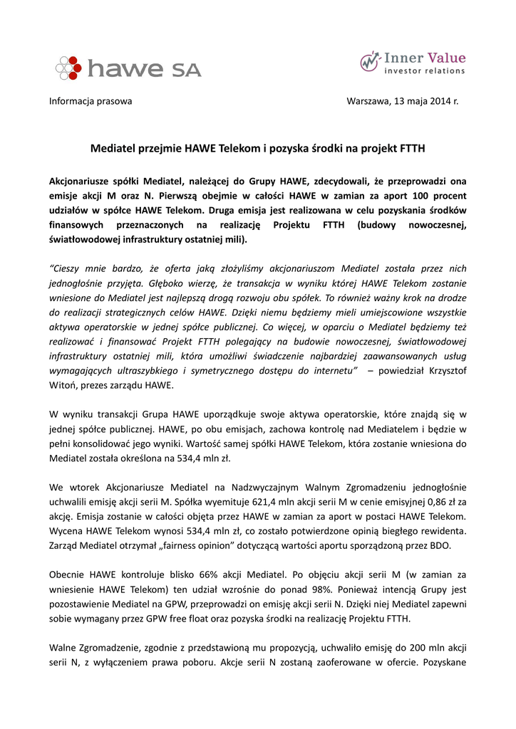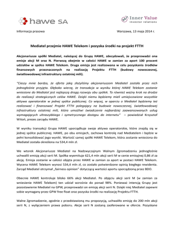 Informacja prasowa Warszawa, 13 maja 2014 r. Mediatel przejmie HAWE Telekom i pozyska środki na projekt FTTH Akcjonariusze spółki Mediatel, należącej do Grupy HAWE, zdecydowali, że przeprowadzi ona emisje akcji M oraz N. Pierwszą obejmie w całości HAWE w zamian za aport 100 procent udziałów w spółce HAWE Telekom. Druga emisja jest realizowana w celu pozyskania środków finansowych przeznaczonych na realizację Projektu FTTH (budowy nowoczesnej, światłowodowej infrastruktury ostatniej mili). “Cieszy mnie bardzo, że oferta jaką złożyliśmy akcjonariuszom Mediatel została przez nich jednogłośnie przyjęta. Głęboko wierzę, że transakcja w wyniku której HAWE Telekom zostanie wniesione do Mediatel jest najlepszą drogą rozwoju obu spółek. To również ważny krok na drodze do realizacji strategicznych celów HAWE. Dzięki niemu będziemy mieli umiejscowione wszystkie aktywa operatorskie w jednej spółce publicznej. Co więcej, w oparciu o Mediatel będziemy też realizować i finansować Projekt FTTH polegający na budowie nowoczesnej, światłowodowej infrastruktury ostatniej mili, która umożliwi świadczenie najbardziej zaawansowanych usług wymagających ultraszybkiego i symetrycznego dostępu do internetu” – powiedział Krzysztof Witoń, prezes zarządu HAWE. W wyniku transakcji Grupa HAWE uporządkuje swoje aktywa operatorskie, które znajdą się w jednej spółce publicznej. HAWE, po obu emisjach, zachowa kontrolę nad Mediatelem i będzie w pełni konsolidować jego wyniki. Wartość samej spółki HAWE Telekom, która zostanie wniesiona do Mediatel została określona na 534,4 mln zł. We wtorek Akcjonariusze Mediatel na Nadzwyczajnym Walnym Zgromadzeniu jednogłośnie uchwalili emisję akcji serii M. Spółka wyemituje 621,4 mln akcji serii M w cenie emisyjnej 0,86 zł za akcję. Emisja zostanie w całości objęta przez HAWE w zamian za aport w postaci HAWE Telekom. Wycena HAWE Telekom wynosi 534,4 mln zł, co zostało potwierdzone opinią biegłego rewidenta. Zarząd Mediatel otrzymał „fairness opinion” dotyczącą wartości aportu sporządzoną przez BDO. Obecnie HAWE kontroluje blisko 66% akcji Mediatel. Po objęciu akcji serii M (w zamian za wniesienie HAWE Telekom) ten udział wzrośnie do ponad 98%. Ponieważ intencją Grupy jest pozostawienie Mediatel na GPW, przeprowadzi on emisję akcji serii N. Dzięki niej Mediatel zapewni sobie wymagany przez GPW free float oraz pozyska środki na realizację Projektu FTTH. Walne Zgromadzenie, zgodnie z przedstawioną mu propozycją, uchwaliło emisję do 200 mln akcji serii N, z wyłączeniem prawa poboru. Akcje serii N zostaną zaoferowane w ofercie. Pozyskane środki mają zostać przeznaczone na realizację projektu FTTH. Projekt FTTH, który będzie realizowany przez HAWE Telekom i Mediatel, zakłada budowę światłowodowej sieci dostępowej (FTTH – Fiber To The Home). Sieć dostępowa zbudowana w tej technologii zapewni podłączonym gospodarstwom domowym najszybszy możliwy dostęp do symetrycznego internetu o bardzo dużej przepustowości oraz szeregu, nowatorskich, innowacyjnych usług, które wymagają dużego transferu danych jak np. telewizja interaktywna, HD, 3D, 4K, 8K, streaming video, muzyki, usługi w chmurze itp. W czerwcu 2013 r. HAWE przedstawiło strategię, zakładającą m.in. że Spółka zostanie największym w Polsce otwartym operatorem infrastruktury światłowodowej. Od tego czasu Spółka zrealizowała wiele zapowiedzi zawartych w tym dokumencie. Podpisano m.in. umowy dotyczące partnerstwa z Huawei oraz Alcatel-Lucent, zrestrukturyzowano zadłużenie, sfinalizowano przejęcie Mediatel a przede wszystkim pozyskano partnera dla projektu FTTH – Polskie Inwestycje Rozwojowe. O GRUPIE: Grupa Kapitałowa HAWE świadczy kompleksowe usługi operatorskie na bazie posiadanej infrastruktury światłowodowej oraz usługi projektowe i budowlane dla branży telekomunikacyjnej, elektroenergetycznej i samorządów terytorialnych. Ponadto, poprzez dedykowaną spółkę ORSS realizuje projekt budowy, a następnie eksploatacji i zarządzania siecią szerokopasmową o długości ponad 2.200 km w województwie warmińsko-mazurskim oraz sieci w województwie podkarpackim o długości ponad 2.000 km. Wartość tych projektów realizowanych w latach 2013-2015 wyniesie 627 mln zł. W skład Grupy Kapitałowej HAWE wchodzą: HAWE S.A. – spółka publiczna i dominująca Grupy HAWE, Grupa Mediatel, HAWE Telekom oraz HAWE Budownictwo, a także Otwarte Regionalne Sieci Szerokopasmowe oraz Otwarte Mazowieckie Sieci Szerokopasmowe. HAWE S.A. jest spółką publiczną, której akcje od 2007 r. notowane są na Giełdzie Papierów Wartościowych w Warszawie. Od 21 marca 2008 r. akcje Spółki wchodziły w skład indeksu sWIG80, a od 16 marca 2012 r. w mWIG40. Głównymi obszarami działalności HAWE S.A. jest zarządzanie aktywami spółek zależnych, pozyskiwanie kapitału i finansowania oraz wsparcie w opracowywaniu strategicznych kierunków rozwoju Grupy. HAWE Telekom jest jedynym w Polsce „operatorem dla operatorów” świadczącym swoje usługi w oparciu o własną Ogólnopolską Sieć Światłowodową o długości 3,5 tys. km. Usługi te obejmują sprzedaż i dzierżawę rurociągu teletechnicznego i włókien światłowodowych, dzierżawę usług transmisji danych, dostępu do sieci Internet, kolokacji oraz usług nadzoru i serwisu sieci. Jest to pierwsza tak kompleksowa oferta na rynku. Wśród klientów spółki znajdują się wszyscy operatorzy Polscy i wielu zagranicznych. Mediatel jest spółką telekomunikacyjną notowaną na głównym rynku Giełdy Papierów Wartościowych w Warszawie. Spółka powstała w 2008 roku w efekcie połączenia kilku spółek o ugruntowanej pozycji rynkowej, posiadających komplementarne oferty. Obecnie, w ramach Grupy HAWE, koncentruje się na świadczeniu usług dla innych operatorów w tym usług telekomunikacyjnych na rynku hurtowym. Dodatkowy