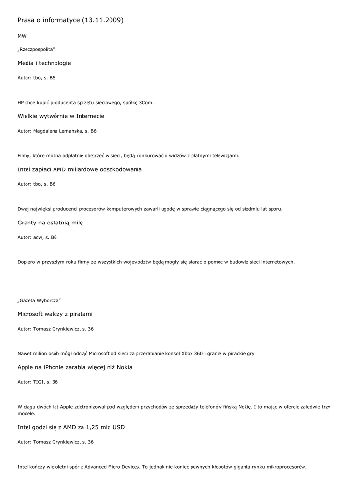 Prasa o informatyce (13.11.2009) MW „Rzeczpospolita” Media i technologie Autor: tbo, s. B5 HP chce kupić producenta sprzętu sieciowego, spółkę 3Com. Wielkie wytwórnie w Internecie Autor: Magdalena Lemańska, s. B6 Filmy, które można odpłatnie obejrzeć w sieci, będą konkurować o widzów z płatnymi telewizjami. Intel zapłaci AMD miliardowe odszkodowania Autor: tbo, s. B6 Dwaj najwięksi producenci procesorów komputerowych zawarli ugodę w sprawie ciągnącego się od siedmiu lat sporu. Granty na ostatnią milę Autor: acw, s. B6 Dopiero w przyszłym roku firmy ze wszystkich województw będą mogły się starać o pomoc w budowie sieci internetowych. „Gazeta Wyborcza” Microsoft walczy z piratami Autor: Tomasz Grynkiewicz, s. 36 Nawet milion osób mógł odciąć Microsoft od sieci za przerabianie konsol Xbox 360 i granie w pirackie gry Apple na iPhonie zarabia więcej niż Nokia Autor: TIGI, s. 36 W ciągu dwóch lat Apple zdetronizował pod względem przychodów ze sprzedaży telefonów fińską Nokię. I to mając w ofercie zaledwie trzy modele. Intel godzi się z AMD za 1,25 mld USD Autor: Tomasz Grynkiewicz, s. 36 Intel kończy wieloletni spór z Advanced Micro Devices. To jednak nie koniec pewnych kłopotów giganta rynku mikroprocesorów. „Dziennik. Gazeta Prawna” W Polsce powstaje coraz mniej łączy internetowych Autor: Tomasz Świderek, s. C5 W III kwartale 2009 r. na całym świecie przybyło 16,3 mln szybkich łączy internetowych . W Polsce w tym czasie ich liczba zwiększyła się najwyżej o 90 tys. „Puls Biznesu” Intel wróży lepsze czasy Autor: Katarzyna Latek, s. 4 Intel liczy, że firmy które zamroziły wydatki na informatykę, w przyszłym roku ruszą na zakupy. Wzrost przychodów spółki w III kwartale był najwyższy od 30 lat, a sprzedaż procesorów w sztukach także biła rekordy. E- cło potrzebuje wsparcia Autor: Jacek Kowalczyk, s. 7 Resort finansów poszukuje firmy doradczej do pomocy przy wdrażaniu elektronicznej obsługi handlu międzynarodowego. „Parkiet” ARiMR nie poddaje się i składa apelację Autor: DWOL, s. 7 ARiMR wniosła apelację od wyroku Sądu Okręgowego w Łodzi dotyczącego zwrotu na rzecz Sygnity 7,5 mln zł kary za niewykonanie kontraktu. 13 listopada 2009 13:12