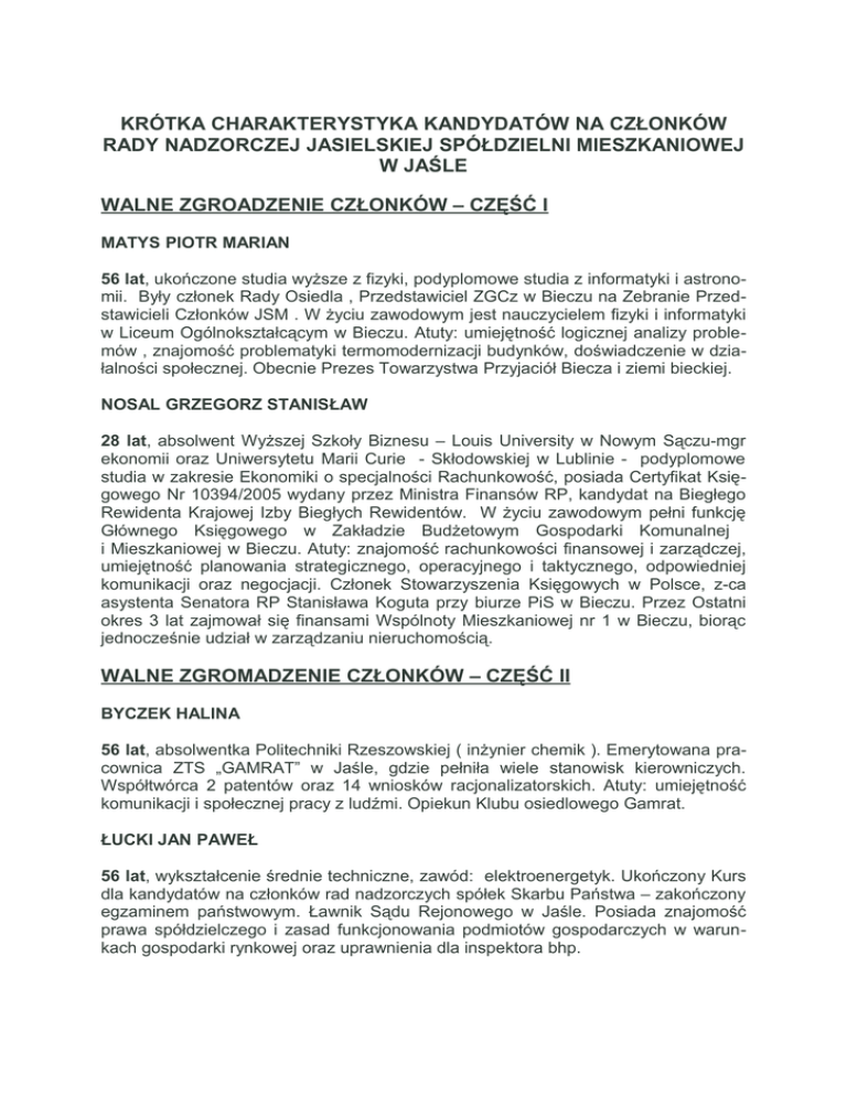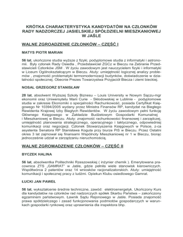 KRÓTKA CHARAKTERYSTYKA KANDYDATÓW NA CZŁONKÓW RADY NADZORCZEJ JASIELSKIEJ SPÓŁDZIELNI MIESZKANIOWEJ W JAŚLE WALNE ZGROADZENIE CZŁONKÓW – CZĘŚĆ I MATYS PIOTR MARIAN 56 lat, ukończone studia wyższe z fizyki, podyplomowe studia z informatyki i astronomii. Były członek Rady Osiedla , Przedstawiciel ZGCz w Bieczu na Zebranie Przedstawicieli Członków JSM . W życiu zawodowym jest nauczycielem fizyki i informatyki w Liceum Ogólnokształcącym w Bieczu. Atuty: umiejętność logicznej analizy problemów , znajomość problematyki termomodernizacji budynków, doświadczenie w działalności społecznej. Obecnie Prezes Towarzystwa Przyjaciół Biecza i ziemi bieckiej. NOSAL GRZEGORZ STANISŁAW 28 lat, absolwent Wyższej Szkoły Biznesu – Louis University w Nowym Sączu-mgr ekonomii oraz Uniwersytetu Marii Curie - Skłodowskiej w Lublinie - podyplomowe studia w zakresie Ekonomiki o specjalności Rachunkowość, posiada Certyfikat Księgowego Nr 10394/2005 wydany przez Ministra Finansów RP, kandydat na Biegłego Rewidenta Krajowej Izby Biegłych Rewidentów. W życiu zawodowym pełni funkcję Głównego Księgowego w Zakładzie Budżetowym Gospodarki Komunalnej i Mieszkaniowej w Bieczu. Atuty: znajomość rachunkowości finansowej i zarządczej, umiejętność planowania strategicznego, operacyjnego i taktycznego, odpowiedniej komunikacji oraz negocjacji. Członek Stowarzyszenia Księgowych w Polsce, z-ca asystenta Senatora RP Stanisława Koguta przy biurze PiS w Bieczu. Przez Ostatni okres 3 lat zajmował się finansami Wspólnoty Mieszkaniowej nr 1 w Bieczu, biorąc jednocześnie udział w zarządzaniu nieruchomością. WALNE ZGROMADZENIE CZŁONKÓW – CZĘŚĆ II BYCZEK HALINA 56 lat, absolwentka Politechniki Rzeszowskiej ( inżynier chemik ). Emerytowana pracownica ZTS „GAMRAT” w Jaśle, gdzie pełniła wiele stanowisk kierowniczych. Współtwórca 2 patentów oraz 14 wniosków racjonalizatorskich. Atuty: umiejętność komunikacji i społecznej pracy z ludźmi. Opiekun Klubu osiedlowego Gamrat. ŁUCKI JAN PAWEŁ 56 lat, wykształcenie średnie techniczne, zawód: elektroenergetyk. Ukończony Kurs dla kandydatów na członków rad nadzorczych spółek Skarbu Państwa – zakończony egzaminem państwowym. Ławnik Sądu Rejonowego w Jaśle. Posiada znajomość prawa spółdzielczego i zasad funkcjonowania podmiotów gospodarczych w warunkach gospodarki rynkowej oraz uprawnienia dla inspektora bhp. MYŚLIWIEC MAREK 46 lat, wykształcenie średnie. W życiu zawodowym pracownik ZTS „Gamrat” SA w Jaśle. Radny III Kadencji Rady Miejskiej w Jaśle. Pełnił funkcję: przez 6 lat członka Rady Nadzorczej Jasielskiej Spółdzielni Mieszkaniowej w Jaśle, Przewodniczącego NSZZ „ Solidarność” w OBR – ERG w Jaśle, członka Rady Naukowej w OBR – ERG w Jaśle, Prezesa Klubu Sportowego JKS „ Czarni” Jasło, z- cy Przewodniczącego Zarządu Osiedla GMRAT w Jaśle. Atuty: umiejętność komunikacji i organizacji pracy z dziećmi i młodzieżą, organizacji imprez sportowych. OLBROT MAREK 46 lat, mechanik samochodowy. W życiu zawodowym jest pracownikiem ZTS „ Gamrat” w Jaśle . Przez 2 kadencje Przewodniczący Zarządu Osiedla „Gamrat”, w latach 1994-2002 Przewodniczący Rady Osiedla „Gamrat”. Od 2007 r. członek Rady Nadzorczej Jasielskiej Spółdzielni Mieszkaniowej w Jaśle. PABIAN EDWARD 75 lat, wykształcenie średnie techniczne. Emeryt. Długoletni pracownik ZTS „GAMRAT” Jasło. W kresie od 1976r. do 1991 r. Z-ca Prezesa Spółdzielni Usługowo Technicznej w Jaśle. Posiada uprawnienia budowlane do projektowania, nadzoru i wykonawstwa instalacji i sieci sanitarnych. Uczestnik kursów i szkoleń o kierunku kierowania i zarządzania przedsiębiorstwami. PIEKARSKA ZOFIA 66 lat, technik. Emerytowany długoletni pracownik ZTS „GAMRAT” w Jaśle. Przewodnicząca Rady Osiedla Jasielskiej Spółdzielni Mieszkaniowej 2 kadencji. Od 2007 r. członek Rady Nadzorczej Jasielskiej Spółdzielni Mieszkaniowej w Jaśle. Atuty: umiejętność komunikacji, organizacji imprez kulturalno oświatowych, pasjonat pracy z dziećmi. WOŚ JAN 71 lat, wykształcenie średnie techniczne o specjalności technik chemik. Emeryt. Długoletni pracownik Przedstawicielstwa Wojskowego w Jaśle. Członek Rady Nadzorczej Jasielskiej Spółdzielni Mieszkaniowej w Jaśle. Członek Komisji Rewizyjnej Rady Nadzorczej Jasielskiej Spółdzielni Mieszkaniowej w Jaśle. Przewodniczący Rady Osiedla „ Śródmieście – II”, członek Prezydium Zarządu Stowarzyszenia Ogrodów Działkowych Region Bieszczadzki w Krośnie – od 2007 r. Z –ca Prezesa. Atuty: umiejętność organizowania pracy społecznej, komunikatywność. ŻARNOWSKI SZYMON 35 lat, absolwent Wyższej Szkoły Informatyki i Zarządzania w Rzeszowie o specjalności: finanse, ubezpieczenia i bankowość. Uczestnik wielu szkoleń specjalistycznych organizowanych przez: Międzynarodową Szkołę Bankowości i Finansów w Warszawie, Bankowy Ośrodek Doradztwa i Edukacji w Poznaniu, AchieveGlobal LearningSystem Polska Sp. z o.o w Warszawie, Bank Unii Gospodarczej S.A., Spółdzielczy Bank Rozwoju „ SCh”, Bank BPH S.A., Bank Pekao S.A. W życiu zawodowym obecnie pełni funkcje Dyrektora Oddziału Alior Bank S.A. Członek Rady Nadzorczej Jasielskiej Spółdzielni Mieszkaniowej w Jaśle - kadencji 2004 – 2008. Od 2006 r. Przewodniczący Rady Nadzorczej Jasielskiej Spółdzielni Mieszkaniowej w Jaśle. Atuty: umiejętność logicznej analizy problemów, komunikacji, kierowania zespołami ludzkimi, znajomość: finansów, ubezpieczeń i bankowości. WALNE ZGROADZENIE CZŁONKÓW – CZĘŚĆ III DĘBSKI STANISŁAW 52 lata, ukończone wyższe studia ma Politechnice Rzeszowskiej. Specjalność: Chemia i Technologia Chemiczna . W życiu zawodowym obecnie pełni funkcje kierownika Wydziału Produkcji Asfaltów Oddział w Jaśle – Spółka „Lotos Asfalt” Gdańsk. Od roku 2004 członek Rady Nadzorczej Jasielskiej Spółdz