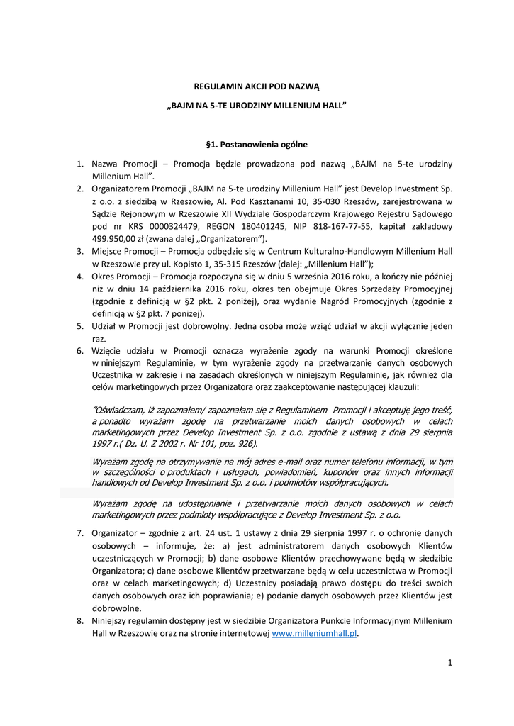 REGULAMIN AKCJI POD NAZWĄ „BAJM NA 5-TE URODZINY MILLENIUM HALL” §1. Postanowienia ogólne 1. Nazwa Promocji – Promocja będzie prowadzona pod nazwą „BAJM na 5-te urodziny Millenium Hall”. 2. Organizatorem Promocji „BAJM na 5-te urodziny Millenium Hall” jest Develop Investment Sp. z o.o. z siedzibą w Rzeszowie, Al. Pod Kasztanami 10, 35-030 Rzeszów, zarejestrowana w Sądzie Rejonowym w Rzeszowie XII Wydziale Gospodarczym Krajowego Rejestru Sądowego pod nr KRS 0000324479, REGON 180401245, NIP 818-167-77-55, kapitał zakładowy 499.950,00 zł (zwana dalej „Organizatorem”). 3. Miejsce Promocji – Promocja odbędzie się w Centrum Kulturalno-Handlowym Millenium Hall w Rzeszowie przy ul. Kopisto 1, 35-315 Rzeszów (dalej: „Millenium Hall”); 4. Okres Promocji – Promocja rozpoczyna się w dniu 5 września 2016 roku, a kończy nie później niż w dniu 14 października 2016 roku, okres ten obejmuje Okres Sprzedaży Promocyjnej (zgodnie z definicją w §2 pkt. 2 poniżej), oraz wydanie Nagród Promocyjnych (zgodnie z definicją w §2 pkt. 7 poniżej). 5. Udział w Promocji jest dobrowolny. Jedna osoba może wziąć udział w akcji wyłącznie jeden raz. 6. Wzięcie udziału w Promocji oznacza wyrażenie zgody na warunki Promocji określone w niniejszym Regulaminie, w tym wyrażenie zgody na przetwarzanie danych osobowych Uczestnika w zakresie i na zasadach określonych w niniejszym Regulaminie, jak również dla celów marketingowych przez Organizatora oraz zaakceptowanie następującej klauzuli: ”Oświadczam, iż zapoznałem/ zapoznałam się z Regulaminem Promocji i akceptuję jego treść, a ponadto wyrażam zgodę na przetwarzanie moich danych osobowych w celach marketingowych przez Develop Investment Sp. z o.o. zgodnie z ustawą z dnia 29 sierpnia 1997 r.( Dz. U. Z 2002 r. Nr 101, poz. 926). Wyrażam zgodę na otrzymywanie na mój adres e-mail oraz numer telefonu informacji, w tym w szczególności o produktach i usługach, powiadomień, kuponów oraz innych informacji handlowych od Develop Investment Sp. z o.o. i podmiotów współpracujących. Wyrażam zgodę na udostępnianie i przetwarzanie moich danych osobowych w celach marketingowych przez podmioty współpracujące z Develop Investment Sp. z o.o. 7. Organizator – zgodnie z art. 24 ust. 1 ustawy z dnia 29 sierpnia 1997 r. o ochronie danych osobowych – informuje, że: a) jest administratorem danych osobowych Klientów uczestniczących w Promocji; b) dane osobowe Klientów przechowywane będą w siedzibie Organizatora; c) dane osobowe Klientów przetwarzane będą w celu uczestnictwa w Promocji oraz w celach marketingowych; d) Uczestnicy posiadają prawo dostępu do treści swoich danych osobowych oraz ich poprawiania; e) podanie danych osobowych przez Klientów jest dobrowolne. 8. Niniejszy regulamin dostępny jest w siedzibie Organizatora Punkcie Informacyjnym Millenium Hall w Rzeszowie oraz na stronie internetowej www.milleniumhall.pl. 1 §2. Definicje 1. Promocja – publiczna konsumencka sprzedaż premiowana odbywająca się w Centrum Kulturalno-Handlowym Millenium Hall w Rzeszowie na zasadach określonych w niniejszym Regulaminie. 2. Okres Sprzedaży Promocyjnej – okres, w którym prowadzona jest sprzedaż w Millenium Hall związana z prowadzoną Promocją, trwający w od dnia 5 września 2016 roku, a kończący się nie później niż w dniu 14 października 2016 roku 3. Galeria – Centrum Kulturalno-Handlowe Millenium Hall w Rzeszowie przy Alei Kopisto 1, 35-315 Rzeszów. 4. Zakup Promocyjny – zakup dowolnych towarów lub usług udokumentowany jednym lub kilkoma – maksymalnie 10 paragonami, których suma wynosi co najmniej 2.000,00 (słownie: dwa tysiące złotych i 00/100) złotych brutto, dokonany w okresie sprzedaży promocyjnej. W promocji nie biorą udziału paragony fiskalne za zakup: kart podarunkowych, napojów alkoholowych, produktów tytoniowych, produktów leczniczych (wydawanych na receptę lub refundowanych przez NFZ), zakładów lotto, wszelkich gier liczbowych i losowych, wpłaty i wypłaty z bankomatów i wpłatomatów, potwierdzenia transakcji wykonanych w kantorze, banku oraz wszelkie inne dowody zakupów niebędące paragonami fiskalnymi. Paragony posiadające kwoty za zakup napojów alkoholowych, produktów tytoniowych i produktów leczniczych zostaną pomniejszone o łączną sumę produktów wyłączonych ze sprzedaży. Paragon musi udokumentować zakupy wykonane w dniu, w którym został on zgłoszony do udziału w Promocji. 5. Okres promocyjny – okres w trakcie którego wydawane będą zaproszenia na koncert zespołu BAJM za dokonanie zakupu promocyjnego. Zaproszenia będą wydawane w punkcie obsługi promocji od dnia 5 września 2016 roku do wyczerpania puli zaproszeń. . 6. Punkt Obsługi Promocji – Punkt Informacyjny zlokalizowany na parterze Galerii, w którym obsługiwani będą Uczestnicy Promocji zgodnie z niniejszym Regulaminem. 7. Nagroda Promocyjna – dwuosobowe zaproszenie na koncert zespołu BAJM, który odbędzie się w dniu 14 października 2016 roku w Klubie Lukr W Millenium Hall. Ilość zaproszeń jest ograniczona. 8. Uczestnik promocji – osoba lub osoby spełniające kryteria, o których mowa w pkt. 3 Regulaminu, które biorą udział w promocji. 9. Regulamin – niniejszy regulamin. §3. Uczestnicy 1. Uczestnikiem Promocji może być każda osoba fizyczna będąca konsumentem w rozumieniu art. 221 Kodeksu cywilnego. W Promocji samodzielnie mogą uczestniczyć tylko osoby pełnoletnie o pełnej zdolności do czynności prawnych. 2. W promocji nie mogą brać udziału: a) pracownicy, przedstawiciele Organizatora lub Centrum Kulturalno-Handlowego Millenium Hall w Rzeszowie; b) podmioty mające podpisane umowy i świadczące usługi w siedzibie Organizatora oraz inne podmioty bezpośrednio zaangażowane w przeprowadzenie Promocji; 2 c) osoby fizyczne prowadzące działalność gospodarczą, jeżeli chciałyby przystąpić do Promocji w rama