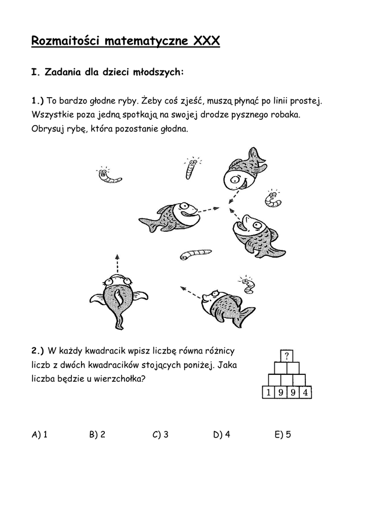 Rozmaitości matematyczne XXX I. Zadania dla dzieci młodszych: 1.) To bardzo głodne ryby. Żeby coś zjeść, muszą płynąć po linii prostej. Wszystkie poza jedną spotkają na swojej drodze pysznego robaka. Obrysuj rybę, która pozostanie głodna. 2.) W każdy kwadracik wpisz liczbę równa różnicy liczb z dwóch kwadracików stojących poniżej. Jaka liczba będzie u wierzchołka? A) 1 B) 2 C) 3 D) 4 E) 5 3.) Przedstawiona na rysunku obok konstrukcja, zbudowana z jednakowych sześcianików, waży 189 gramów. Ile waży jeden sześcianik? A) 29g B) 25g C) 21g D) 19g E) 17g 4.) Na jednej szalce wagi znajduje się sześć jednakowych pomarańczy, na drugiej dwa jednakowe melony. Gdy na szalce z pomarańczami położymy dodatkowo taki sam melon, to waga znajdzie się w równowadze. Ile pomarańczy waży tyle, ile waży jeden melon ? A) 2 B) 3 C) 4 D) 5 E) 6 II. Zadania dla dzieci starszych: 1.) Penelope kupuje mała buteleczkę ulubionych perfum za 10 dolarów. Jeśli perfumy są o 9 dolarów droższe niż koszt ozdobnej buteleczki, w której są sprzedawane, ile kosztuje buteleczka? 2.) Spośród setki badanych osób 86 na śniadanie zjadło jajko, 75 bekon, 62 tost, a 82 osoby wypiły kawę. Ile osób musiało spożyć wszystkie cztery produkty? 3.) Samochód jedzie ze stałą prędkością 25 metrów na sekundę. Ile kilometrów? Przejedzie w czasie jednej godziny? A) 100 B) 90 C) 80 D) 75 E) 60 4.) O ile więcej trójkątów niż kwadratów, których boki są zawarte w narysowanych liniach, przedstawiono na rysunku obok? A) o 4 B) o 2 C) o 1 D) o 5 E) o 3 **************************************************************** Rozwiązania zadań z poprzedniego numeru(XXIX): I. 4) 94 II. 1) A) 2) A) 3) 10 4) E)