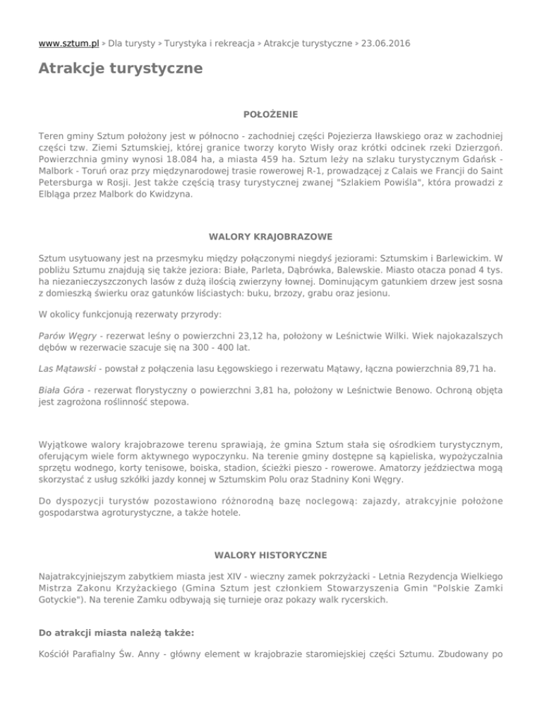 www.sztum.pl Dla turysty Turystyka i rekreacja Atrakcje turystyczne 23.06.2016 Atrakcje turystyczne POŁOŻENIE Teren gminy Sztum położony jest w północno - zachodniej części Pojezierza Iławskiego oraz w zachodniej części tzw. Ziemi Sztumskiej, której granice tworzy koryto Wisły oraz krótki odcinek rzeki Dzierzgoń. Powierzchnia gminy wynosi 18.084 ha, a miasta 459 ha. Sztum leży na szlaku turystycznym Gdańsk Malbork - Toruń oraz przy międzynarodowej trasie rowerowej R-1, prowadzącej z Calais we Francji do Saint Petersburga w Rosji. Jest także częścią trasy turystycznej zwanej "Szlakiem Powiśla", która prowadzi z Elbląga przez Malbork do Kwidzyna. WALORY KRAJOBRAZOWE Sztum usytuowany jest na przesmyku między połączonymi niegdyś jeziorami: Sztumskim i Barlewickim. W pobliżu Sztumu znajdują się także jeziora: Białe, Parleta, Dąbrówka, Balewskie. Miasto otacza ponad 4 tys. ha niezanieczyszczonych lasów z dużą ilością zwierzyny łownej. Dominującym gatunkiem drzew jest sosna z domieszką świerku oraz gatunków liściastych: buku, brzozy, grabu oraz jesionu. W okolicy funkcjonują rezerwaty przyrody: Parów Węgry - rezerwat leśny o powierzchni 23,12 ha, położony w Leśnictwie Wilki. Wiek najokazalszych dębów w rezerwacie szacuje się na 300 - 400 lat. Las Mątawski - powstał z połączenia lasu Łęgowskiego i rezerwatu Mątawy, łączna powierzchnia 89,71 ha. Biała Góra - rezerwat florystyczny o powierzchni 3,81 ha, położony w Leśnictwie Benowo. Ochroną objęta jest zagrożona roślinność stepowa. Wyjątkowe walory krajobrazowe terenu sprawiają, że gmina Sztum stała się ośrodkiem turystycznym, oferującym wiele form aktywnego wypoczynku. Na terenie gminy dostępne są kąpieliska, wypożyczalnia sprzętu wodnego, korty tenisowe, boiska, stadion, ścieżki pieszo - rowerowe. Amatorzy jeździectwa mogą skorzystać z usług szkółki jazdy konnej w Sztumskim Polu oraz Stadniny Koni Węgry. Do dyspozycji turystów pozostawiono różnorodną bazę noclegową: zajazdy, atrakcyjnie położone gospodarstwa agroturystyczne, a także hotele. WALORY HISTORYCZNE Najatrakcyjniejszym zabytkiem miasta jest XIV - wieczny zamek pokrzyżacki - Letnia Rezydencja Wielkiego Mistrza Zakonu Krzyżackiego (Gmina Sztum jest członkiem Stowarzyszenia Gmin "Polskie Zamki Gotyckie"). Na terenie Zamku odbywają się turnieje oraz pokazy walk rycerskich. Do atrakcji miasta należą także: Kościół Parafialny Św. Anny - główny element w krajobrazie staromiejskiej części Sztumu. Zbudowany po wojnie 13-letniej, obecny kształt uzyskał na przełomie lat 1900-1901. Wnętrze utrzymano w stylu neogotyckim, z elementami wystroju barokowego. Poewangelicki Kościół - na miejscu dawnego Ratusza, w centralnej części Rynku. Powstała w latach 1816-1818 budowla o formach neoklasycystycznych. Inne zabytki Ziemi Sztumskiej: - głaz upamiętniający podpisanie rozejmu polsko-szwedzkiego w Sztumskiej Wsi (1635 r.) - zabytkowe dworki w miejscowościach: Zajezierze, Michorowo, Cygusy, Czernin, Waplewo, Stążki, Ramzy Małe, Mleczewo, Wilczewo - grodziska: słowiańskie z XI w. w miejscowości Węgry; siedziba rodu Stangów - grodzisko w Stążkach; oraz grodziska kultury łużyckiej w Kalwie (650-125 p.n .e.) i Nowej Wsi - cmentarzyska kurhanowe w Koniecwałdzie, cmentarzysko w Nowym Targu - podcieniowy dom żuławski w Stalewie - XIX-wieczna śluza na rzece Nogat w Białej Górze - Dom Polski w Piekle wybudowany w 1937 r. jako Szkoła Polska w Wolnym Mieście Gdańsku - obecnie Izba Pamięci narodowej - odsłonięte fundamenty zamku komturskiego w Dzierzgoniu, jednego z najważniejszych zamków Zakonu Krzyżackiego - siedziba Wielkiego Szatnego - gotyckie kościoły z cennym wyposażeniem z okresu średniowiecza, renesansu i baroku: Postolin, Dzierzgoń, Żuławka Sztumska, Kalwa, Jasna, Krasna Łąka, Bągard, Pietrzwałd - szańce szwedzkie w Benowie ( I poł. XVII w.)