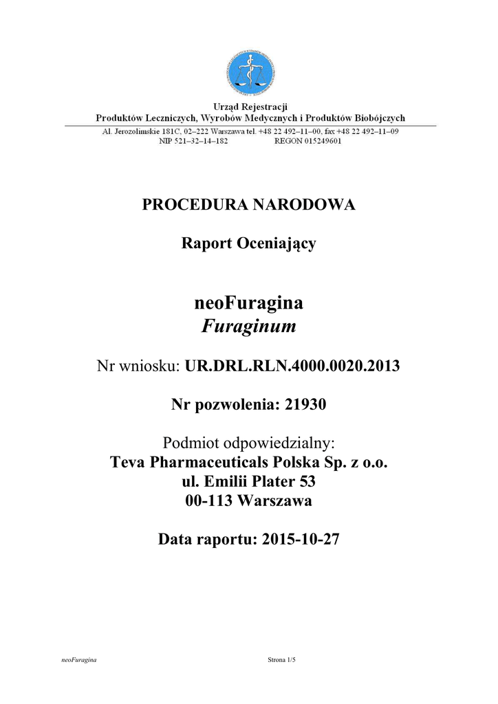 PROCEDURA NARODOWA Raport Oceniający neoFuragina Furaginum Nr wniosku: UR.DRL.RLN.4000.0020.2013 Nr pozwolenia: 21930 Podmiot odpowiedzialny: Teva Pharmaceuticals Polska Sp. z o.o. ul. Emilii Plater 53 00-113 Warszawa Data raportu: 2015-10-27 neoFuragina Strona 1/5 SPIS TREŚCI I WSTĘP II II.1 II.2 II.3 III PRZEGLĄD NAUKOWY I DYSKUSJA ASPEKTY DOTYCZĄCE JAKOŚCI ASPEKTY NIEKLINICZNE ASPEKTY KLINICZNE OCENA STOSUNKU KORZYŚCI DO RYZYKA IV ZALECANE WARUNKI POZWOLENIA NA DOPUSZCZENIE DO OBROTU I INFORMACJI O PRODUKCIE IV.1 IV.2 KATEGORIA DOSTĘPNOŚCI PRODUKTU LECZNICZEGO PROPONOWANA LISTA ZOBOWIĄZAŃ PO DOPUSZCZENIU DO OBROTU <I SZCZEGÓLNYCH OBOWIĄZKÓW> W PRZYPADKU POZYTYWNEJ OCENY STOSUNKU KORZYŚCI DO RYZYKA ZOBOWIĄZANIA PO DOPUSZCZENIU DO OBROTU IV.3 POZOSTAŁE WARUNKI neoFuragina Strona 2/5 INFORMACJE ADMINISTRACYJNE Proponowana nazwa produktu leczniczego neoFuragina Nazwa substancji czynnej (Nazwa INN): Furaginum Grupa farmakoterapeutyczna (kod ATC): J01 XE Postać (-ci) farmaceutyczna i moc(e): Tabletki, 50 mg Numer wniosku UR.DRL.RLN.4000.0020.2013 Teva Pharmaceuticals Polska Sp. z o.o. ul. Emilii Plater 53, 00-113 Warszawa Podmiot odpowiedzialny (nazwa i adres) Podstawa prawna wniosku I Art. 16 ust. 1 ustawy z dnia 6 września 2001 r. Prawo farmaceutyczne (Dz.U. z 2008 r. Nr 45, poz. 271 ze zm.) WSTĘP Po przeanalizowaniu danych odnośnie jakości, skuteczności i bezpieczeństwa zawartych w przedłożonej dokumentacji rejestracyjnej dołączonej do wniosku o pozwolenie na dopuszczenie do obrotu produktu leczniczego neoFuragina, we wskazaniu do stosowania: Zakażenie dolnych dróg moczowych uznano, że: przedłożone dane pozwoliły na wydanie pozwolenia na dopuszczenie do obrotu. Pozwolenie Nr 21930 wydano w dniu 18.06.2014 r. neoFuragina Strona 3/5 II PRZEGLĄD NAUKOWY I DYSKUSJA II.1 Aspekty dotyczące jakości Substancja czynna Specyfikacja substancji czynnej, metody badań i ich walidacje zostały zaakceptowane. Produkt leczniczy Opisane badania rozwojowe nad produktem leczniczym zostały zaakceptowane. Specyfikacje produktu, metody badań i ich walidacje zostały zaakceptowane. Proponowany okres ważności wynoszący 4 lata oraz warunki przechowywania „Przechowywać w temperaturze poniżej 25 °C” zostały zaakceptowane. Dokumentacja chemiczne, farmaceutyczna i biologiczna produktu neoFuragina spełnia wymagania prawa farmaceutycznego. II.2 Aspekty niekliniczne Właściwości farmakodynamiczne, farmakokinetyczne i toksykologiczne furaginy są dobrze znane. Biorąc pod uwagę fakt, że furagina jest powszechnie stosowaną, dobrze znaną substancją czynną, wnioskodawca nie przeprowadził dodatkowych badań, i dalsze badania nie są wymagane. Z powyższych powodów przegląd oparty na danych literaturowych jest wystarczający. Ocena zagrożeń dla środowiska naturalnego (ERA) Przedłożono Environmental Risk Assessment opracowany zgodnie z wytyczną Guideline on the environmental risk assessment of medicinal products for human use” EMEA/CHMP/SWP/4447/00. Na podstawie odnośnych danych oszacowano, że ryzyko dla środowiska naturalnego związane z dopuszczeniem do obrotu produktu leczniczego neoFuragina jest praktycznie znikome. II.3 Aspekty kliniczne Biorównoważność Nie dotyczy – produkt leczniczy zawierający substancję czynną o ugruntowanym zastosowaniu medycznym Skuteczność kliniczna Informacje dotyczące skuteczności klinicznej furaginy przedstawione w Module 2.5 Przegląd Kliniczny są wystarczające dla potwierdzenia skuteczności klinicznej produktu neoFuragina we wskazaniach określonych w pkt 4.1 ChPL Bezpieczeństwo kliniczne Informacje dotyczące bezpieczeństwa stosowania furaginy przedstawione w Module 2.5 Przegląd Kliniczny są wystarczające dla potwierdzenia bezpieczeństwa klinicznego produktu neoFuragina we wskazaniach określonych w pkt 4.1 ChPL neoFuragina Strona 4/5 Plan Zarządzania Ryzykiem Wnioskodawca, zgodnie z wymaganiami prawnymi, złożył plan zarządzania ryzykiem opisujący działania zmierzające do identyfikacji, scharakteryzowania i ograniczenia ryzyka związanego ze stosowaniem leku. Streszczenie Planu Zarządzania ryzykiem dostępne jest na stronie internetowej Urzędu Rejestracji Produktów Leczniczych, Wyrobów Medycznych i Produktów Biobójczych. System monitorowania (Pharmacovigilance System bezpieczeństwa stosowania produktu leczniczego Opis, w jaki sposób podmiot odpowiedzialny prowadzi nadzór nad bezpieczeństwem stosowania produktu leczniczego przedstawiono w sposób wystarczający do potwierdzenia prawidłowego wypełnienia obowiązków w tym zakresie. Okresowy raport o bezpieczeństwie stosowania produktu leczniczego (PSUR) Dla produktu zarejestrowanego na podstawie art. 16, zawierającego furaginę nie ma obowiązku przygotowywania okresowego raportu o bezpieczeństwie produktu leczniczego. III OCENA STOSUNKU KORZYŚCI DO RYZYKA Korzyści terapeutyczne przewyższają potencjalne ryzyko stosowania. IV ZALECANE WARUNKI POZWOLENIA NA DOPUSZCZENIE DO OBROTU I INFORMACJI O PRODUKCIE IV.1 Kategoria dostępności produktu leczniczego Produkt leczniczy wydawany bez przepisu lekarza – OTC. IV.2 Proponowana lista zobowiązań po dopuszczeniu do obrotu <i szczególnych obowiązków> w przypadku pozytywnej oceny stosunku korzyści do ryzyka Zobowiązania po dopuszczeniu do obrotu Nie dotyczy Szczególne obowiązki Nie dotyczy IV.3 neoFuragina Pozostałe warunki Strona 5/5