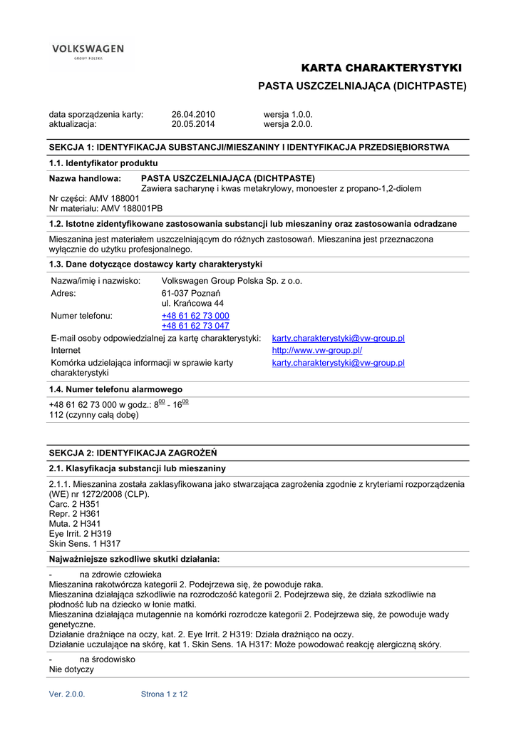 KARTA CHARAKTERYSTYKI PASTA USZCZELNIAJĄCA (DICHTPASTE) data sporządzenia karty: aktualizacja: 26.04.2010 20.05.2014 wersja 1.0.0. wersja 2.0.0. SEKCJA 1: IDENTYFIKACJA SUBSTANCJI/MIESZANINY I IDENTYFIKACJA PRZEDSIĘBIORSTWA 1.1. Identyfikator produktu Nazwa handlowa: PASTA USZCZELNIAJĄCA (DICHTPASTE) Zawiera sacharynę i kwas metakrylowy, monoester z propano-1,2-diolem Nr części: AMV 188001 Nr materiału: AMV 188001PB 1.2. Istotne zidentyfikowane zastosowania substancji lub mieszaniny oraz zastosowania odradzane Mieszanina jest materiałem uszczelniającym do różnych zastosowań. Mieszanina jest przeznaczona wyłącznie do użytku profesjonalnego. 1.3. Dane dotyczące dostawcy karty charakterystyki Nazwa/imię i nazwisko: Adres: Volkswagen Group Polska Sp. z o.o. 61-037 Poznań ul. Krańcowa 44 Numer telefonu: +48 61 62 73 000 +48 61 62 73 047 E-mail osoby odpowiedzialnej za kartę charakterystyki: [email protected] Internet http://www.vw-group.pl/ Komórka udzielająca informacji w sprawie karty [email protected] charakterystyki 1.4. Numer telefonu alarmowego 00 00 +48 61 62 73 000 w godz.: 8 - 16 112 (czynny całą dobę) SEKCJA 2: IDENTYFIKACJA ZAGROŻEŃ 2.1. Klasyfikacja substancji lub mieszaniny 2.1.1. Mieszanina została zaklasyfikowana jako stwarzająca zagrożenia zgodnie z kryteriami rozporządzenia (WE) nr 1272/2008 (CLP). Carc. 2 H351 Repr. 2 H361 Muta. 2 H341 Eye Irrit. 2 H319 Skin Sens. 1 H317 Najważniejsze szkodliwe skutki działania: na zdrowie człowieka Mieszanina rakotwórcza kategorii 2. Podejrzewa się, że powoduje raka. Mieszanina działająca szkodliwie na rozrodczość kategorii 2. Podejrzewa się, że działa szkodliwie na płodność lub na dziecko w łonie matki. Mieszanina działająca mutagennie na komórki rozrodcze kategorii 2. Podejrzewa się, że powoduje wady genetyczne. Działanie drażniące na oczy, kat. 2. Eye Irrit. 2 H319: Działa drażniąco na oczy. Działanie uczulające na skórę, kat 1. Skin Sens. 1A H317: Może powodować reakcję alergiczną skóry. na środowisko Nie dotyczy Ver. 2.0.0. Strona 1 z 12 KARTA CHARAKTERYSTYKI PASTA USZCZELNIAJĄCA (DICHTPASTE) SEKCJA 2: IDENTYFIKACJA ZAGROŻEŃ - związane z właściwościami fizykochemicznymi Nie dotyczy 2.1.2. Mieszanina została zaklasyfikowana jako niebezpieczna zgodnie z kryteriami dyrektywy 1999/45/WE. Repr. Cat. 3; R62 Muta. Cat. 3; R68 Carc. Cat. 3; R40 Drażniący Xi; R36 R43 2.2. Elementy oznakowania Oznakowanie zgodnie z rozporządzeniem (WE) nr 1272/2008 (CLP): Piktogramy określające rodzaj zagrożenia: Hasło ostrzegawcze: Uwaga. Zwroty wskazujące rodzaj zagrożenia: H361: Podejrzewa się, że działa szkodliwie na płodność lub na dziecko w łonie matki. H341: Podejrzewa się, że powoduje wady genetyczne. H351: Podejrzewa się, że powoduje raka. H319: Działa drażniąco na oczy. H317: Może powodować reakcję alergiczną skóry. Zwroty wskazujące środki ostrożności: P102: Chronić przed dziećmi. P201 Przed użyciem zapoznać się ze specjalnymi środkami ostrożności. P261 Unikać wdychania pyłu/dymu/gazu/mgły/par/rozpylonej cieczy. P280 Stosować rękawice ochronne/odzież ochronną/ochronę oczu/ochronę twarzy. P302 + P352 W PRZYPADKU KONTAKTU ZE SKÓRĄ: Umyć dużą ilością wody z mydłem. P308 + P313 W przypadku narażenia lub styczności: Zasięgnąć porady/zgłosić się pod opiekę lekarza. P405 Przechowywać pod zamknięciem. P501: Zawartość/pojemnik usuwać na składowiska odpadów niebezpiecznych. Informacje uzupełniające o zagrożeniach: Nie dotyczy. Etykieta powinna zawierać identyfikator produktu, o którym mowa w art. 18 rozp. CLP oraz nazwę, adres i telefon dostawcy danej mieszaniny. Dane identyfikujące wszystkie substancje w mieszaninie , które decydują o jej zaklasyfikowaniu zgodnie z Art. 18 pkt. 3b. sacharyna i kwas metakrylowy, monoester z propano-1,2-diolem 2.3. Inne zagrożenia 2.3.1 Ocena PBT lub vPvB zgodnie z zał. XIII REACH – substancje zawarte w mieszaninie nie zostały zakwalifikowane jako PBT lub vPvB. Kryteria PBT i vPvB zawarte są w Aneksie XIII REACH. 2.3.2. Informacje dotyczące innych zagrożeń, które nie powodują zaklasyfikowania, a które mogą przyczynić się do ogólnych zagrożeń powodowanych przez mieszaninę. Ver. 2.0.0. Strona 2 z 12 KARTA CHARAKTERYSTYKI PASTA USZCZELNIAJĄCA (DICHTPASTE) SEKCJA 2: IDENTYFIKACJA ZAGROŻEŃ Nie dotyczy. SEKCJA 3: SKŁAD/INFORMACJA O SKŁADNIKACH 3.1. Substancje Nie dotyczy. 3.2. Mieszaniny Identyfikator produktu: PASTA USZCZELNIAJĄCA (DICHTPASTE) Zawiera sacharynę i kwas metakrylowy, monoester z propano-1,2-diolem a) Substancje stanowiące zagrożenie dla zdrowia lub środowiska w rozumieniu rozporządzenia (WE) nr 1272/2008 i dyrektywy 67/548/EWG: Numer CAS Numer WE 27813-02-1 248-666-3 81-07-2 201-321-0 80-15-9 b) c) 201-254-7 Numer indeksowy - Numer rejestracji REACH Zawartość %-wagowy 01-2119490226-37XXXX 10%≤C<12, 5% 01-2119950321-48XXXX - 617-002-00-8 01-2119475796-19XXXX 1%≤C<3% 1%≤C<3% Nazwa Klasyfikacja substancji zgodnie z rozporządzeniem (WE) nr 1272/2008: Klasyfikacja substancji zgodnie z dyrektywą 67/548/EWG: Kwas metakrylowy, monoester z propano-1,2diolem Eye Irrit. 2; H319 Skin Sens. 1; H317 Xi; R36 R43 Sacharyna (1,2benzisothiazol3(2H)-one 1,1dioxide) Repr. 2 H361 Muta. 2 H341 Carc. 2 H351 Acute Tox. 4 H332 Repr. Cat. R62 Muta. Cat. R68 Carc. Cat. R40 Xn, R20 Hydronadtlenek 2-fenylopropan-2ylu Org. Perox. E H242 Acute Tox. 3 H331 Acute Tox. 4 H302 Acute Tox. 4 H312 STOT RE 2 H373 Skin Corr. 1B H314 Aquatic Chronic 2 H411 3; 3; 3; O; R7 T; R23 Xn; R21/2248/20/22 C; R34 N; R51-53 Substancje, dla których istnieją wspólnotowe najwyższe dopuszczalne stężenia w środowisku pracy, które nie zostały zawarte w lit. a): - Nie dotyczy. Substancje trwałe, wykazujące zdolność do bioakumulacji i toksyczne lub bardzo trwałe i wykazujące bardzo dużą zdolność do bioakumulacji zgodnie z kryteriami zawartymi w załączniku XIII l