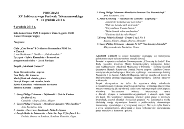 PROGRAM XV Jubileuszowego Festiwalu Telemannowskiego 9 – 11 grudnia 2016 r. 9 grudnia 2016 r. Sala koncertowa PSM I stopnia w Żarach, godz. 18.00 Koncert Inauguracyjny Program: Chór „Con Forza” i Orkiestra Kameralna PSM I st. w Żarach L. van Beethoven/ F. Schiller – „Oda do radości” Dyrygent – Sylwia Kamzelska – Bronowicka przygotowanie chóru – Jacek Furdzyn Zespół „Adalbert Consort” Anna Alexandrowicz - sopran Ewa Biały - flet traverso Maciej Kończak - lutnia, gitara Henryk Kasperczak - teorba, lutnia Sylwia Kamzelska - wiolonczela barokowa Elżbieta Karolak – pozytyw 1. Georg Philipp Telemann – Tafelmusik V. Solo in B minor for flute & b.c. Cantabile, Allegro, Dolce, Allegro 2. Georg Philipp Telemann – Moralische Kantaten "Die Landlust" Aria, Recitativo, Aria 3. Anonim – Ouverture, Sarabande, Folia de Espana 4. Joseph Bodin de Boismortier – Suite No. 5 op. 35 for flute & b.c. Prelude, Bouree en Rondeau, Rondeau, Fantaisie, Gigue. 5. Georg Philipp Telemann–Moralische Kantaten“Die Freundschaft” Aria, Recitativo, Aria 6. Jakob Kremberg - " Musikalische Gemüths – Ergötzung " - „Sturmt ihr Gedanken auf mein leben" - "Halt ein, betrube dich nicht mehr" - "Chrystallinen Wunder-Schein" - "Mein Gemuth wilstu erschrecken" - "Gut ferne dich du eitles Wesen" 7.George Frideric Handel – Sonate G op.1 No. 5 Adagio, Allegro, Adagio, Bouree, Menuetto 8. Georg Philipp Telemann – Kantate Nr 127 "Am Sonntag Estomihi" Allegro moderato, Recitativo, Vivace Adalbert Consort to zespół kameralny zajmujący się historycznie poinformowanym wykonawstwem muzyki dawnej. Powstał w oparciu o członków Stowarzyszenia „Z Muzyką do Ludzi": Ewa Biały (recorder, traverso), Maciej Kończak (gitary historyczne, lutnie) oraz wykładowców Akademii Muzycznej w Poznaniu – Elżbietę Karolak (pozytyw), Henryk Kasperczak (lutnie). Nazwa zespołu Adalbert Consort nawiązuje do pochodzącego z Gostynia, wybitnego renesansowego lutnisty Wojciecha ( po łacinie Adalbert) Długoraja, którego muzykę od trzech lat Stowarzyszenie promuje organizując międzynarodowy festiwal lutniowy w Gostyniu. Zespół nie ogranicza się tylko do repertuaru doby odrodzenia, a z zamiłowaniem wykonuje muzykę epoki baroku i wczesnego klasycyzmu. Muzycy starają się jak najwierniej oddać sens wykonywanych dzieł poprzez właściwą lecz zarazem twórczą interpretację opartą o dźwięki płynące z instrumentów oryginalnych z danych epok, bądź ich kopii. Do współpracy zapraszają również gości grając w tercetach, kwartetach, a nawet oktetach i większych grupach. Na koncertach z wielką dbałością starają się nawiązać kontakt z publicznością demonstrując instrumenty, opowiadając o wykonywanej muzyce. Nie są to tylko historie z życia kompozytorów, ale również z życia wykonawców opowiedziane przez muzyków z humorem i pokorą. 10 grudnia 2016 r. Sala koncertowa PSM I stopnia w Żarach JURY IV POLSKO – NIEMIECKIEGO KONKURSU SMYCZKOWYCH I FLETOWYCH ZESPOŁÓW KAMERALNYCH - Lech Bałaban – Przewodniczący Jury, skrzypek, altowiolista, kameralista, koncertmistrz Orkiestry Kameralnej Polskiego Radia Agnieszki Duczmal, juror ogólnopolskich i międzynarodowych konkursów, profesor Akademii Muzycznej w Bydgoszczy i Szkoły Talentów w Poznaniu. Współpracuje z wieloma wybitnymi artystami, m. in. Piotrem Pławnerem, Bartoszem Bryłą i Waldemarem Malickim. - Stephan Schuh – pianista, kameralista, Dyrektor Konservatorium Georg Philipp Telemann w Magdeburgu - Thomas Stapel – skrzypek, kompozytor, aranżer i dyrektor filii Kreismusikschule Dreiländereck Löbau w Niesky. Przez wiele lat dyrygent młodzieżowej orkiestry kameralnej „Youth Symphony Orchestra” - Dorothea Wollstadt – flecistka, kameralistka, dyrektor filii Musikschule Dreiländereck Löbau w Weißwasser - Cezary Traczewski – flecista, kameralista, nauczyciel klasy fletu w ZSM we Wrocławiu i Wałbrzychu. Wykształcił wielu laureatów ogólnopolskich i międzynarodowych konkursów fletowych. - Katarzyna Helwing – Osuch – skrzypaczka, kameralistka, absolwentka PSM w Żarach. Nauczyciel PSM I stopnia w Zawierciu i ZSM im. M. Spisaka w Dąbrowie Górniczej. 08:00 – 09:10 – próby akustyczne w Sali Koncertowej 09:10 – Uroczyste rozpoczęcie IV Polsko-Niemieckiego Konkursu Smyczkowych i Fletowych Zespołów Kameralnych 09:20 - przesłuchania 1. Trio fortepianowe – PSM I st. im. G. Ph. Telemanna, Żary Dominika Nerga, Daria Bryjak – skrzypce Aleksandra Ledwoch – fortepian naucz. mgr Jadwiga Pietsch G. Ph. Telemann – Sonata G – dur cz. I Soave W. A. Mozart – Dzwoneczek 2. Trio fortepianowe „Infanta” – Kreismusikschule Dreilӓndereck, Niesky, Clara Schuster, Fides Tripke – skrzypce Judith Kagelmann – fortepian naucz. mgr Thomas Stapel G. Ph. Telemann – Très viste Th. Stapel – Dwie miniatury na 2 skrzypiec i fortepian 3. Duet wiolonczelowy „Cellissimo” – PSM I st. im. G. Ph. Telemanna, Żary Julia Zając, Zuzanna Pilas naucz. mgr Sylwia Kamzelska – Bronowicka G. Ph. Telemann – Canon A. Vivaldi – Allegro F – dur A. Trowell – Medytacja 4. Blockflӧten-Duo – Kreismusikschule Dreilӓndereck, oddział Weiβwasser Hanna Krahl, Veronika Fuchs naucz. mgr Dorothea Wollstadt G. Ph. Telemann – Sonata nr 6 G-dur, Affettuoso i Allegro Matthias Maute – “Bixler Beat” 5. Trio fortepianowe „MAK” – PSM I st. im. G. Bacewicz, Nowa Sól Aneta Grzegorska, Marcin Mosorzewski – skrzypce Klaudia Bogucka – fortepian naucz. mgr Patrycja Śmiejczak – Świdzińska G. F. Haendel – Aria Anonim – Dance, Dance B. Keampfert – Strangers in the Night 9. „Choszczeńskie trio fletowe” – PSM I st. im. I. J. Paderewskiego, Choszczno Wiktoria Joksch, Klaudia Jaruga, Ewa Zarzecka naucz. mgr Stefan Małecki J. J. Quantz – Sonata F –dur op.3 nr 6, Preludio, Aria i Menuet F. Kuhlau – Trio nr 1 op 86, Allegro assai V. Agafinnikov – Trio, “Poranek