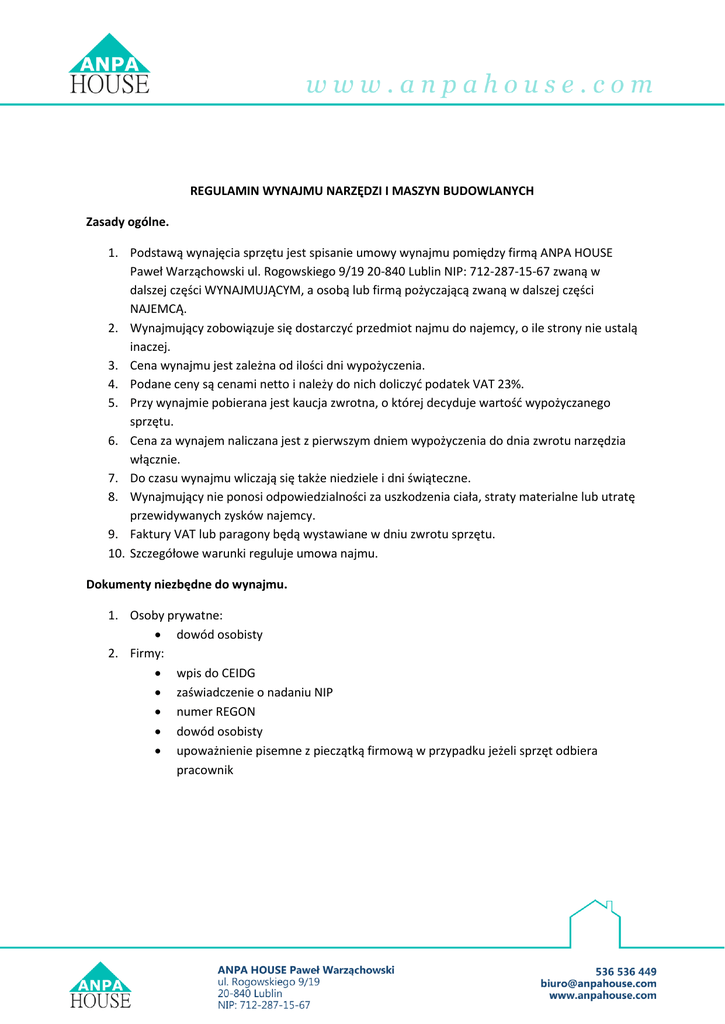 REGULAMIN WYNAJMU NARZĘDZI I MASZYN BUDOWLANYCH Zasady ogólne. 1. Podstawą wynajęcia sprzętu jest spisanie umowy wynajmu pomiędzy firmą ANPA HOUSE Paweł Warząchowski ul. Rogowskiego 9/19 20-840 Lublin NIP: 712-287-15-67 zwaną w dalszej części WYNAJMUJĄCYM, a osobą lub firmą pożyczającą zwaną w dalszej części NAJEMCĄ. 2. Wynajmujący zobowiązuje się dostarczyć przedmiot najmu do najemcy, o ile strony nie ustalą inaczej. 3. Cena wynajmu jest zależna od ilości dni wypożyczenia. 4. Podane ceny są cenami netto i należy do nich doliczyć podatek VAT 23%. 5. Przy wynajmie pobierana jest kaucja zwrotna, o której decyduje wartość wypożyczanego sprzętu. 6. Cena za wynajem naliczana jest z pierwszym dniem wypożyczenia do dnia zwrotu narzędzia włącznie. 7. Do czasu wynajmu wliczają się także niedziele i dni świąteczne. 8. Wynajmujący nie ponosi odpowiedzialności za uszkodzenia ciała, straty materialne lub utratę przewidywanych zysków najemcy. 9. Faktury VAT lub paragony będą wystawiane w dniu zwrotu sprzętu. 10. Szczegółowe warunki reguluje umowa najmu. Dokumenty niezbędne do wynajmu. 1. Osoby prywatne: dowód osobisty 2. Firmy: wpis do CEIDG zaświadczenie o nadaniu NIP numer REGON dowód osobisty upoważnienie pisemne z pieczątką firmową w przypadku jeżeli sprzęt odbiera pracownik
