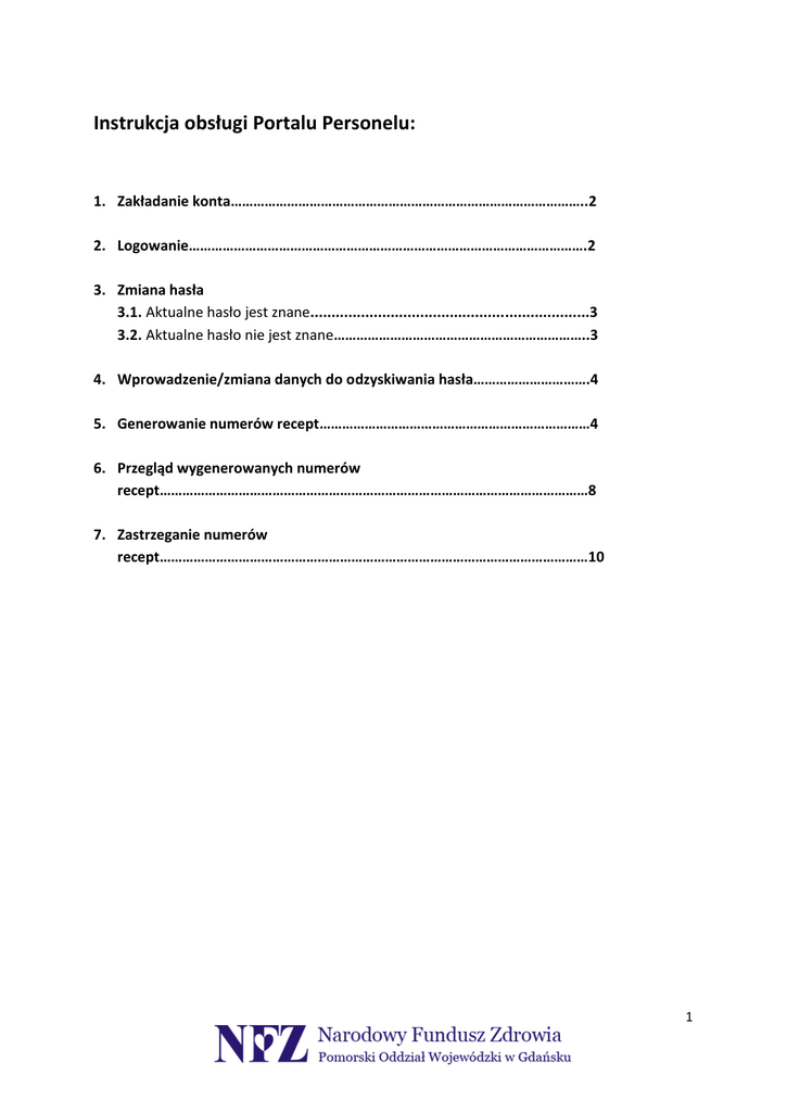 Instrukcja obsługi Portalu Personelu: 1. Zakładanie konta…………………………………………………………………………………..2 2. Logowanie…………………………………………………………………………………………….2 3. Zmiana hasła 3.1. Aktualne hasło jest znane..................................................................3 3.2. Aktualne hasło nie jest znane…………………………………………………………..3 4. Wprowadzenie/zmiana danych do odzyskiwania hasła………………………….4 5. Generowanie numerów recept………………………………………………………………4 6. Przegląd wygenerowanych numerów recept……………………………………………………………………………………………………8 7. Zastrzeganie numerów recept……………………………………………………………………………………………………10 1 1. Zakładanie konta W celu założenia konta na Portalu Personelu należy: Krok 1. Wejść na stronę konkurs.nfz-gdansk.pl/CLO_WL/ Krok 2. Kliknąć „Aktywacja” Krok 3. Wypełnić i zatwierdzić formularz aktywacyjny. Na podany adres mailowy zostanie wysłany link do formularza aktywacyjnego do wydruku. Krok 4. Wydrukować formularz aktywacyjny poprzez kliknięcie „Drukuj”. Krok 5. Wydrukować i wypełnić 2 egzemplarze umowy upoważniającej do korzystania z Portalu NFZ: umowa_portal_personelu.pdf Przy czym jako numer umowy należy wpisać numer umowy upoważniającej do wystawiania recept (9811XXXXX), jako miejsce zawarcia - Gdańsk. Datę wpisuje pracownik oddziału. Krok 6. Formularz aktywacyjny i 2 egzemplarze umowy przesłać na adres: Pomorski Oddział Wojewódzki NFZ ul. Marynarki Polskiej 148 80-865 Gdańsk Krok 7. Po aktywacji konta przez pracownika oddziału otrzymają Państwo informację na podany adres mailowy. 2. Logowanie W celu zalogowania na Portalu Personelu należy: Krok 1. Wejść na stronę konkurs.nfz-gdansk.pl/CLO_WL/ Krok 2. Jako login podać numer PESEL lekarza, jako hasło – hasło wpisane w formularzu aktywacyjnym bądź hasło podane przy aktualizacji hasła. PESEL 2 3. Zmiana hasła Krok 1. Aktualne hasło jest znane Po zalogowaniu należy kliknąć opcję „Zmiana hasła” w oknie „Administracja i opcje” Następnie należy wprowadzić jednokrotnie aktualne hasło (to przez które właśnie się zalogowano) i dwukrotnie nowe hasło: Krok 2. Aktualne hasło nie jest znane: W przypadku zapomnienia hasła i braku danych umożliwiajacych korzystanie z funkcjonalności „zapomniałem hasła” należy wysłać do oddziału prośbę o wygenerowanie nowego hasła. W piśmie należy uwzględnić numer PESEL, numer umowy upoważniającej na wystawianie recept oraz adres mailowy, na który ma zostać wysłane nowe hasło. 3 4. Wprowadzenie/zmiana danych do odzyskiwania hasła Aby wprowadzić lub zmienić dane do odzyskiwania hasła należy: Krok 1. Po zalogowaniu kliknąć „Moje podstawowe dane” w oknie „Moje dane” Krok 2. Kliknąć „Edytuj” w okienku „Dane do odzyskiwania hasła” Krok 3. Wpisać własne pytanie i odpowiedź po czym kliknąć „Zatwierdź” 4 5. Generowanie numerów recept Krok 1. Z menu Recepty należy wybrać opcję „Generowanie numerów recept”: Krok 2. Przy numerze umowy należy kliknąć „Wniosek” 5 Krok 3. Należy wybrać rodzaj recept (a) i tryb wydania (b) oraz podać ilość bloczków (dzienny limit pobrań: 10 bloczków, miesięczny limit pobrań: 100 bloczków): (a) (b) (a) (b) Następnie należy jednokrotnie kliknąć przycisk „Zatwierdź” i chwilę odczekać. 6 Krok 4. Pojawią się szczegółowe informacje o złożonym wniosku wraz z możliwością pobrania w odpowiednim formacie (plik XML, plik PDF, druk zamówienia): W przypadku gdy takie okno się nie pojawi, ale wystąpi komunikat mówiący, że wniosek o podanym numerze został już złożony lub że limit dzienny ilości bloczków został przekroczony należy skorzystać z funkcjonalności „Przegląd wygenerowanych numerów recept” (opis poniżej). 7 6. Przegląd wygenerowanych numerów recept Krok 1. Z menu Recepty należy wybrać opcję „Pokaż więcej”: Krok 2. Należy kliknąć „Przegląd wygenerowanych numerów recept - dane archiwalne”: 8 Krok 3. Pojawi się tabela z dotychczas złożonymi wnioskami oraz możliwością pobrania odpowiednich plików z wygenerowanymi numerami: Przy korzystaniu z tej funkcjonalności należy zwrócić uwagę na to, czy dane numery recept nie zostały już raz wykorzystane. 9 7. Zastrzeganie numerów recept Krok 1. Z menu Recepty należy wybrać opcję „Składanie wniosków o zastrzeganie recept”: Krok 2. W tym widoku należy określić sposób wyboru recept do zastrzeżenia: 10 a) Bloczki – zastrzegamy przez zaznaczenie pola wyboru obok zakresów numerycznych bloczku: b) Zakres – należy podać numer początkowy i końcowy zakresu: Przykład wyboru tylko 1 recepty Krok 3. Po kliknięciu na pole „Wniosek” pojawi się okno z danymi wniosku. Należy wybrać powód zastrzeżenia (Kradzież/Zagubienie/Inne) i kliknąć „Zatwierdź” 11