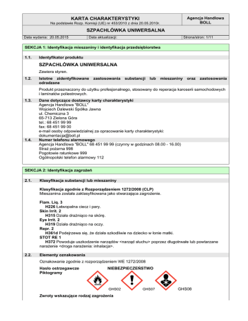 Agencja Handlowa BOLL KARTA CHARAKTERYSTYKI Na podstawie Rozp. Komisji (UE) nr 453/2010 z dnia 20.05.2010r. SZPACHLÓWKA UNIWERSALNA Data wydania: 20.05.2015 Data aktualizacji: Strona/stron: 1/11 SEKCJA 1: Identyfikacja mieszaniny i identyfikacja przedsiębiorstwa 1.1. Identyfikator produktu SZPACHLÓWKA UNIWERSALNA Zawiera styren. 1.2. Istotne zidentyfikowane odradzane zastosowania substancji lub mieszaniny oraz zastosowania Produkt przeznaczony do użytku profesjonalnego, stosowany do reperacja karoserii samochodowych i laminatów poliestrowych. 1.3. 1.4. Dane dotyczące dostawcy karty charakterystyki Agencja Handlowa "BOLL" Wojciech Dalewski Spółka Jawna ul. Chemiczna 3 65-713 Zielona Góra tel.: 68 451 99 99 fax: 68 451 99 00 e-mail osoby odpowiedzialnej za opracowanie karty charakterystyki: [email protected] Numer telefonu alarmowego Agencja Handlowa "BOLL" 68 451 99 99 (czynny w godzinach 08.00 - 16.00) Straż pożarna 998 Pogotowie ratunkowe 999 Ogólnopolski telefon alarmowy 112 SEKCJA 2: Identyfikacja zagrożeń 2.1. Klasyfikacja substancji lub mieszaniny Klasyfikacja zgodnie z Rozporządzeniem 1272/2008 (CLP) Mieszanina została zaklasyfikowana jako stwarzająca zagrożenie. Flam. Liq. 3 H226 Łatwopalna ciecz i pary. Skin Irrit. 2 H315 Działa drażniąco na skórę. Eye Irrit. 2 H319 Działa drażniąco na oczy. Repr. 2 H361d Podejrzewa się, że działa szkodliwie na dziecko w łonie matki. STOT RE 1 H372 Powoduje uszkodzenie narządów <narząd słuchu> poprzez długotrwałe lub powtarzane narażenie <droga narażenia: inhalacja>. 2.2. Elementy oznakowania Oznakowanie zgodnie z rozporządzeniem WE 1272/2008 Hasło ostrzegawcze Piktogramy NIEBEZPIECZEŃSTWO GHS02 Zwroty wskazujące rodzaj zagrożenia GHS07 GHS08 KARTA CHARAKTERYSTYKI Na podstawie Rozp. Komisji (UE) nr 453/2010 z dnia 20.05.2010r. Agencja Handlowa BOLL SZPACHLÓWKA UNIWERSALNA Data wydania: 20.05.2015 Data aktualizacji: Strona/stron: 2/11 H226 Łatwopalna ciecz i pary. H315 Działa drażniąco na skórę. H319 Działa drażniąco na oczy. H361d Podejrzewa się, że działa szkodliwie na dziecko w łonie matki. H372 Powoduje uszkodzenie narządów <narząd słuchu> poprzez długotrwałe lub powtarzane narażenie <droga narażenia: inhalacja>. Zwroty wskazujące środki ostrożności Zapobieganie P260 P280 Reagowanie P314 P303+P361+P353 Przechowywanie P403+P235 Usuwanie P501 Nie wdychać pyłu/par. Stosować rękawice ochronne/odzież ochronną/ ochronę oczu/ ochronę twarzy. W przypadku złego samopoczucia zasięgnąć porady/zgłosić się pod opiekę lekarza. W PRZYPADKU KONTAKTU ZE SKÓRĄ (lub z włosami): Natychmiast zdjąć całą zanieczyszczoną odzież. Spłukać skórę pod strumieniem wody/prysznicem. Przechowywać w dobrze wentylowanym miejscu. Przechowywać w chłodnym miejscu. Zawartość / pojemnik usuwać do: składowisk substancji niebezpiecznych. Informacje uzupełniające Wartość LZO w produkcie gotowym do użytku (LZO) < 250 g/l. Dopuszczalna wartość LZO: 250 g/l 2.3. Inne zagrożenia Produkt nie zawiera składników spełniających kryteria PBT lub vPvB. SEKCJA 3: Skład/informacja o składnikach 3.2. Mieszaniny Charakter chemiczny: mieszanina substancji organicznych i pomocniczych. Nazwa substancji Identyfikator Klasyfikacja 1272/2008 styren Indeks 601-026-00-0 CAS 100-42-5 WE 202-851-5 Nr rej. 01-2119457861-32XXXX Flam. Liq. 3 Acute Tox. 4 Skin Irrit. 2 Eye Irrit. 2 Asp. Tox. 1 STOT SE 3 STOT RE 1 Repr. 2 Aquatic Chronic. 3 H226 H332 H315 H319 H304 H335 H372 H361d H412 % wag <15 Pełne znaczenie zwrotów zagrożenia ujęto w sekcji 16 SEKCJA 4: Środki pierwszej pomocy 4.1. Opis środków pierwszej pomocy Drogi narażenia: Drogi oddechowe, drogi pokarmowe, kontakt ze skórą, kontakt z oczami. Następstwa wdychania: Wyprowadzić poszkodowana osobę na świeże powietrze. Ułożyć w wygodnej pozycji. Zapewnić KARTA CHARAKTERYSTYKI Na podstawie Rozp. Komisji (UE) nr 453/2010 z dnia 20.05.2010r. Agencja Handlowa BOLL SZPACHLÓWKA UNIWERSALNA Data wydania: 20.05.2015 4.2. 4.3. Data aktualizacji: Strona/stron: 3/11 ciepło i spokój. W razie potrzeby zapewnić pomoc lekarską. Następstwa połknięcia: Przepłukać usta wodą, dać do wypicia 2-3 szklanki wody, skontaktować się z lekarzem. Nie wywoływać wymiotów. Osobie nieprzytomnej nie podawać niczego do połknięcia. W razie potrzeby przetransportować do szpitala. Choremu zapewnić spokój, leżenie i ciepło. Kontakt z oczami: Usunąć szkła kontaktowe. Przemyć zanieczyszczone oczy większą ilością letniej wody przez 10 minut, przy wywiniętych powiekach. Co pewien czas nakładać górną na dolną powiekę. Oczy osłonić kompresem. W razie potrzeby zapewnić pomoc okulisty. Kontakt ze skórą: Zdjąć zanieczyszczone ubranie i buty. Oczyścić zanieczyszczoną skórę, przemyć dużą ilością wody a następnie wodą z łagodnym mydłem. W przypadku gdy wystąpi podrażnienie skóry, które nie przemija, skonsultować się z lekarzem dermatologiem. Najważniejsze ostre i opóźnione objawy oraz skutki narażenia W wyniku kontaktu z oparami o wysokich stężeniach mogą wystąpić oznaki podrażnienia oczu, gardła i układu oddechowego (kaszel i trudności w oddychaniu), depresja ośrodkowego układu nerwowego (zmęczenie, zawroty i bóle głowy). Wskazania dotyczące wszelkiej natychmiastowej pomocy lekarskiej i szczególnego postępowania z poszkodowanym W miejscu pracy powinny być dostępne środki umożliwiające natychmiastową pomoc przedlekarską. Osoby udzielające pierwszej pomocy powinny posiadać rękawiczki medyczne. Leczenie objawowe. Leczenie w przypadku nadmiernej ekspozycji należy prowadzić kierując się obserwacją objawów i ogólnym stanem pacjenta. SEKCJA 5: Postępowanie w przypadku pożaru 5.1. 5.2. 5.3. Środki gaśnicze Odpowiednie środki gaśnicze: piana gaśnicza odporna na alkohol, ditlenek węgla CO2, proszki gaśnicze, rozproszona woda. Niewłaściwe środki gaśnicze: Nie stosowa