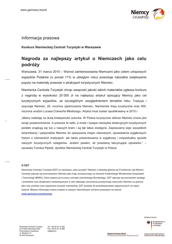 www.germany.travel Informacja prasowa Konkurs Niemieckiej Centrali Turystyki w Warszawie Nagroda za najlepszy artykuł o Niemczech jako celu podróży Warszawa, 31 marca 2015 – Wzrost zainteresowania Niemcami jako celem urlopowych wyjazdów Polaków (o ponad 11% w ubiegłym roku) powoduje naturalne zwiększenie popytu na materiały prasowe o atrakcjach turystycznych Niemiec. Niemiecka Centrala Turystyki chcąc wesprzeć jakość takich materiałów ogłasza konkurs z nagrodą w wysokości 20 000 zł na najlepszy artykuł opisujący Niemcy jako cel turystycznych wyjazdów, ze szczególnym uwzględnieniem tematów roku: Tradycje i zwyczaje Niemiec, 25. rocznica zjednoczenia Niemiec, Niemieckie trasy turystyczne oraz 500. rocznica urodzin Lucasa Cranacha Młodszego. Artykuł musi zostać opublikowany w 2015 r. „Mamy nadzieję na dużą kreatywność autorów. W Polsce turystyczne oblicze Niemiec znane jest wciąż powierzchownie. A przecież te setki, a może i tysiące niezwykle atrakcyjnych turystycznych perełek znajdują się tuż u naszych bram i są tak łatwo dostępne. Zapraszamy więc wszystkich dziennikarzy i pasjonatów Niemiec do opisywania miejsc nieznanych, opowiadania wyjątkowych historii o niemieckich tradycjach, ale także prezentowania w wyjątkowy i indywidualny sposób naszych turystycznych szlagierów. Jestem pewien, że powstaną fascynujące opowieści.” – zauważa Tomasz Pędzik, dyrektor Niemieckiej Centrali Turystyki w Polsce. O DZT Niemiecka Centrala Turystyki (DZT) to narodowa „izba turystyki” Niemiec z siedzibą główną we Frankfurcie nad Menem. Centrala zajmuje się promowaniem Niemiec jako kraju turystycznego na zlecenie Federalnego Ministerstwa Gospodarki i Technologii (BMWi), które wspiera ją na mocy uchwały niemieckiego Bundestagu. DZT zajmuje się tworzeniem strategii i produktów oraz działaniami marketingowymi w celu dalszego umocnienia pozytywnego wizerunku Niemiec za granicą jako celu podróży oraz wspierania turystyki niemieckiej. DZT posiada 30 przedstawicielstw zagranicznych na całym świecie. Bliższe informacje można znaleźć w naszym internetowym centrum prasowym na stronie www.germany.travel/presse. Niemiecka Centrala Turystyki c/o Polsko-Niemiecka Izba Przemysłowo-Handlowa ul. Miodowa 14 00-246 Warszawa Tel. +48 22 53 10 528 Fax +48 22 53 10 688 [email protected] Regulamin Konkursu „Najlepszy artykuł o Niemczech jako celu podróży” I. Postanowienia ogólne 1.1 Organizatorem konkursu jest Niemiecka Centrala Turystyki (DZT) z siedzibą we Frankfurcie, Beethovenstr. 69, 60325 Frankfurt/M. 1.2 Konkurs organizowany jest w terminie: 01.01.2015-15.11.2015 1.3 Konkurs prowadzony jest w Polsce 1.4 Niniejszy Regulamin określa zasady przeprowadzania Konkursu polegającego na napisaniu artykułu (prasa lub online) na temat Niemiec jako celu podróży. 1.5 Definicje. Przez terminy użyte w niniejszym Regulaminie rozumie się: - Regulamin – niniejszy regulamin; - Konkurs – konkurs opisany w pkt. 1.4; - Uczestnik Konkursu – osoba, która wykonała napisała artykuł o Niemczech jako celu podróży i zgłosiła go do Konkursu. II. Zasady uczestnictwa w Konkursie 2.1. Uczestnikami Konkursu mogą być wyłącznie osoby fizyczne, bez względu na adres zamieszkania. 2.2. Uczestnikami Konkursu nie mogą być pracownicy i przedstawiciele Organizatora i Partnera Konkursu oraz członkowie ich rodzin do drugiego stopnia pokrewieństwa oraz innych podmiotów biorących bezpośredni udział w przygotowaniu i przeprowadzeniu Konkursu na zlecenie Organizatora. 2.3 Zasady wyłonienia Zwycięzców Konkursu opisane zostały w pkt. III Regulaminu. 2.4. W Konkursie każdy Użytkownik może wziąć udział nieograniczoną ilość razy. 2.5. Udział w Konkursie oznacza akceptację jego zasad przewidzianych w niniejszym Regulaminie. 2.6. Udział w Konkursie oznacza zgodę na przetwarzanie danych osobowych jak: imię i nazwisko, adres zamieszkania oraz e-mail. 2.7. Udział w konkursie oznacza zgodę na otrzymywanie biuletynu prasowego Niemieckiej Centrali Turystyki. 2.8. Organizator nie ponosi odpowiedzialności za podanie przez Uczestników konkursu w związku z odbiorem nagrody w Konkursie nieprawdziwych danych lub danych osoby trzeciej. Podanie nieprawdziwych danych lub danych osoby trzeciej skutkuje odebraniem prawa do nagrody. 2.9. W konkursie mogą wziąć udział osoby pełno- i niepełnoletnie. Warunkiem odebrania nagrody przez osobę niepełnoletnią jest pisemna zgoda jednego z rodziców lub opiekuna prawnego. 2.10. Wzięcie udziału w Konkursie oznacza zaakceptowanie wszystkich zasad określonych w Regulaminie. str. 1 III. Zasady przyznawania nagród Konkursowych 3.1. Zadaniem Uczestnika Konkursu jest opisanie Niemiec jako celu podróży oraz zgłoszenie artykułu do Konkursu w terminie do 15.11.2015 na adres e-mail: [email protected] (w tytule email należy wpisać „konkurs dla dziennikarzy”) lub na adres pocztowy (Niemiecka Centrala Turystyki, ul. Miodowa 14, 00-246 Warszawa z dopiskiem „konkurs dla dziennikarzy”). Za zgłoszenie uznaje się przesłanie czytelnych skanów artykułu z prasy lub zrzutów strony i linków z artykułów opublikowanych online lub gazet/czasopism na adres pocztowy. 3.2. Wyłonienia zwycięzcy dokona komisja konkursowa Niemieckiej Centrali Turystyki. Komisja Konkursowa dokona wyboru najlepszego artykułu biorąc pod uwagę wartości merytoryczne i styl. Wartość dodatkową w ocenie stanowić będą: - materiał zdjęciowy ilustrujący artykuł, - odniesienie do tematów marketingowych DZT w 2015: „Tradycje i zwyczaje Niemiec” lub „25 rocznica zjednoczenia Niemiec” lub „Niemieckie trasy turystyczne” lub „500. rocznica urodzin Lucasa Cranacha Młodszego”. 3.3. Zwycięzca zostanie powiadomiony drogą mailową zgodnie z adresem podanym w zgłoszeniu. 3.4. Nad prawidłowością przebiegu Konkursu czuwać będzie Komisja Konkursowa złożona z przedstawicieli Organizatora. Komisja Konku