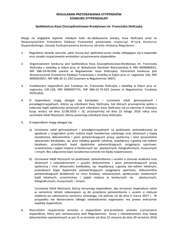 REGULAMIN PRZYZNAWANIA STYPENDIÓW KONKURS STYPENDIALNY Spółdzielcza Kasa Oszczędnościowo-Kredytowa im. Franciszka Stefczyka Mając na względzie dążenie młodych ludzi do zdobywania wiedzy, Kasa Stefczyka wraz ze Stowarzyszeniem Krzewienia Edukacji Finansowej postanawia rozpocząć IX turę Konkursu Stypendialnego. Zasady funkcjonowania konkursu określa niniejszy Regulamin. 1. Regulamin określa warunki, jakie muszą być spełnione przez osoby ubiegające się o stypendia oraz zasady rozpatrywania wniosków i przyznawania stypendiów. 2. Organizatorem konkursu jest Spółdzielcza Kasa Oszczędnościowo-Kredytowa im. Franciszka Stefczyka z siedzibą w Gdyni przy ul. Bohaterów Starówki Warszawskiej 6, KRS 0000080915, NIP 586-10-40-096 (zwana w Regulaminie: Kasa Stefczyka). Partnerem konkursu jest Stowarzyszenie Krzewienia Edukacji Finansowej z siedzibą w Gdyni przy ul. Legionów 126, KRS 0000053057, NIP 586-20-11-292 (zwanym w Regulaminie: SKEF). 3. Fundatorem stypendium jest Fundacja im. Franciszka Stefczyka z siedzibą w Gdyni przy ul. Legionów 126-128, KRS 0000407731, NIP 586-22-75-625 (zwana w Regulaminie: Fundacja Stefczyka). 4. O stypendium mogą ubiegać się kandydaci – uczniowie szkół gimnazjalnych i ponadagimnazjalnych, którzy są członkami Kasy Stefczyka, lub których przynajmniej jedno z rodziców bądź opiekunów prawnych jest członkiem Kasy Stefczyka od co najmniej 6 miesięcy licząc wstecz od dnia 22.08.2016 r. (tj. przynajmniej od dnia 22 lutego 2016 roku) oraz uczniowie Szkół Wyższych, którzy pozostają członkami Kasy Stefczyka. 5. O stypendium mogą ubiegać się: a) Uczniowie szkół gimnazjalnych i ponadgimnazjalnych na podstawie: poświadczonej za zgodność z oryginałem przez rodzica kopii świadectwa szkolnego oraz złożonych z kopią świadectwa dokumentów i pism potwierdzających pracę społeczną i inne pozaszkolne aktywności kandydata, np. przy redakcji gazetki szkolnej, współpracy z gazetą lub radiem lokalnym, przesłanych kopii dyplomów potwierdzających osiągnięcia sportowe, uczestnictwo i zajęte miejsca w konkursach np. plastycznych, fotograficznych, muzycznych i innych. Bez załączonej kopii świadectwa wnioski nie będą rozpatrywane. b) Uczniowie Szkół Wyższych na podstawie: potwierdzenia z uczelni o statusie studenta oraz złożonych z zaświadczeniem z uczelni dokumentów i pism potwierdzających pracę społeczną i inne aktywności kandydata, np. współpracę z gazetą lub radiem lokalnym, przesłanych kopii dyplomów potwierdzających osiągnięcia sportowe, dokumentów potwierdzających działalność na rzecz fundacji, stowarzyszeń, społeczności studenckich bądź lokalnych, uczestnictwo i zajęte miejsca w konkursach np. plastycznych, fotograficznych, muzycznych i innych. Uczniowie Szkół Wyższych, którzy otrzymają stypendium, aby otrzymać stypendium także w semestrze letnim zobowiązani są do przesłania potwierdzenia z uczelni o statusie studenta po zakończeniu semestru zimowego, nie później niż do dnia 5 marca 2017 r. W przypadku nie dostarczenia takiego zaświadczenia organizator ma prawo wstrzymać wypłatę stypendium. 6. Warunkiem rozpatrzenia wniosku o stypendium jest przesłanie wniosku o przyznanie stypendium, który jest zamieszczony pod Regulaminem (wraz z oświadczeniem oraz kopią dokumentów wymienionych w par.5) w terminie od dnia 22 sierpnia do dnia 30 września 2016 roku drogą elektroniczną w formie skanu na adres e-mail: [email protected] , bądź drogą listową (decyduje data stempla pocztowego) na adres Kasy Stefczyka: Kasa Stefczyka ul. Legionów 126-128 81-472 Gdynia z dopiskiem „KONKURS STYPENDIALNY” 7. Stypendia dla uczniów przyznawane będą na okres od 1 września 2016 r. – 30 czerwca 2017 r. Stypendia dla studentów przyznawane będą zgodnie z rokiem akademickim 2016/2017 r. tj. od października 2016 do czerwca 2017 r., przy czym studenci zobowiązani są do złożenia po zakończeniu semestru zimowego najpóźniej do dnia 5 marca 2017 r. zaświadczenia z uczelni potwierdzającego status studenta. 8. Kwoty przyznawanych stypendiów są kwotami brutto i z zastrzeżeniem postanowień pkt 10 wynoszą odpowiednio: a)250 zł/miesięcznie dla uczniów szkół gimnazjalnych i ponadgimnazjalnych, b) 350 zł/miesięcznie dla studentów uczelni wyższych. 9. Stypendia przyznaje Komisja Konkursu (dalej: Komisja), składająca się z czterech osób. W skład Komisji wchodzi Przewodniczący Komisji z Kasy Stefczyka, jeden Członek z Kasy Stefczyka, jeden Członek ze SKEF oraz jeden Członek z Fundacji Stefczyka. 10. Kwota otrzymanego stypendium stanowi przychód stypendysty zgodnie z przepisami ustawy o podatku dochodowym od osób fizycznych i podlega opodatkowaniu tym podatkiem. Fundator Fundacja Stefczyka jako płatnik obliczy, potrąci z przyznanej kwoty stypendium i przekaże do właściwego urzędu skarbowego, zgodnie z przepisami prawa obowiązującymi na terenie Rzeczpospolitej Polskiej, należną kwotę zaliczki na podatek dochodowy z tego tytułu. Po zakończeniu roku podatkowego stypendysta otrzyma od Fundacji Stefczyka informację o osiągniętym dochodzie oraz kwocie potrąconych zaliczek na podatek. 11. W przypadku naruszenia przez stypendystę któregokolwiek z punktów niniejszego Regulaminu Komisja może wstrzymać wypłatę stypendium. 12. W indywidualnych przypadkach Komisja zastrzega sobie możliwość przyznania stypendium na zasadach innych niż ujętych w Regulaminie. Decyzja Komisji odnośnie przyznania stypendium jest decyzją ostateczną i nie podlega odwołaniu. 13. Przyznane stypendium wypłacane będzie w okresach miesięcznych w następujący sposób: a) dla uczniów - za miesiące wrzesień i październik, 2 transze wypłacone łącznie do dnia 31 października 2016 r., kolejne transze (od listopada do czerwca) wypłacane miesięcznie do ostatniego dnia każdego miesiąca; b) dla studentów – wypłacane miesięcznie w okresie od paźd