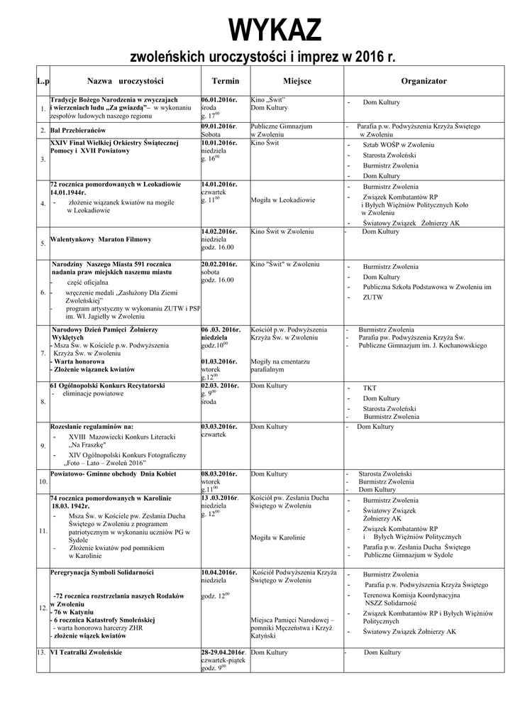 WYKAZ zwoleńskich uroczystości i imprez w 2016 r. L.p Nazwa uroczystości Tradycje Bożego Narodzenia w zwyczajach 1. i wierzeniach ludu „Za gwiazdą”– w wykonaniu zespołów ludowych naszego regionu 2. Bal Przebierańców XXIV Finał Wielkiej Orkiestry Świątecznej Pomocy i XVII Powiatowy 3. 72 rocznica pomordowanych w Leokadiowie 14.01.1944r. złożenie wiązanek kwiatów na mogile 4. w Leokadiowie Termin Miejsce Organizator 06.01.2016r. środa g. 1700 Kino „Świt” Dom Kultury - 09.01.2016r. Sobota 10.01.2016r. niedziela g. 1600 Publiczne Gimnazjum w Zwoleniu Kino Świt - 14.01.2016r. czwartek g. 1100 Mogiła w Leokadiowie 5. Walentynkowy Maraton Filmowy Kino Świt w Zwoleniu Parafia p.w. Podwyższenia Krzyża Świętego w Zwoleniu - Sztab WOŚP w Zwoleniu Starosta Zwoleński Burmistrz Zwolenia Dom Kultury - Burmistrz Zwolenia Związek Kombatantów RP i Byłych Więźniów Politycznych Koło w Zwoleniu Światowy Związek Żołnierzy AK Dom Kultury 14.02.2016r. niedziela godz. 16.00 Dom Kultury - Narodziny Naszego Miasta 591 rocznica 20.02.2016r. sobota nadania praw miejskich naszemu miastu godz. 16.00 część oficjalna 6. wręczenie medali „Zasłużony Dla Ziemi Zwoleńskiej” program artystyczny w wykonaniu ZUTW i PSP im. Wł. Jagiełły w Zwoleniu Kino "Świt" w Zwoleniu - Narodowy Dzień Pamięci Żołnierzy Wyklętych - Msza Św. w Kościele p.w. Podwyższenia 7. Krzyża Św. w Zwoleniu - Warta honorowa - Złożenie wiązanek kwiatów 06 .03. 2016r. niedziela godz.1000 Kościół p.w. Podwyższenia Krzyża Św. w Zwoleniu - Burmistrz Zwolenia Parafia pw. Podwyższenia Krzyża Św. Publiczne Gimnazjum im. J. Kochanowskiego 01.03.2016r. wtorek g.1200 02.03. 2016r. g. 900 środa Mogiły na cmentarzu parafialnym Rozesłanie regulaminów na: XVIII Mazowiecki Konkurs Literacki „Na Fraszkę" 9. XIV Ogólnopolski Konkurs Fotograficzny „Foto – Lato – Zwoleń 2016” 03.03.2016r. czwartek Dom Kultury - TKT Dom Kultury Starosta Zwoleński Burmistrz Zwolenia Dom Kultury Powiatowo- Gminne obchody Dnia Kobiet 08.03.2016r. wtorek g.1100 13 .03.2016r. niedziela g. 1200 Dom Kultury - Starosta Zwoleński Burmistrz Zwolenia Dom Kultury Kościół pw. Zesłania Ducha Świętego w Zwoleniu - 61 Ogólnopolski Konkurs Recytatorski - eliminacje powiatowe 8. 10. 74 rocznica pomordowanych w Karolinie 18.03. 1942r. Msza Św. w Kościele pw. Zesłania Ducha Świętego w Zwoleniu z programem 11. patriotycznym w wykonaniu uczniów PG w Sydole Złożenie kwiatów pod pomnikiem w Karolinie Peregrynacja Symboli Solidarności Dom Kultury Mogiła w Karolinie 10.04.2016r. niedziela - Kościół Podwyższenia Krzyża Świętego w Zwoleniu -72 rocznica rozstrzelania naszych Rodaków w Zwoleniu 12. - 76 w Katyniu - 6 rocznica Katastrofy Smoleńskiej - warta honorowa harcerzy ZHR - złożenie wiązek kwiatów godz. 1200 13. VI Teatrałki Zwoleńskie 28-29.04.2016r. Dom Kultury czwartek-piątek godz. 900 - Miejsca Pamięci Narodowej – pomniki Męczeństwa i Krzyż Katyński - Burmistrz Zwolenia Dom Kultury Publiczna Szkoła Podstawowa w Zwoleniu im ZUTW Burmistrz Zwolenia Światowy Związek Żołnierzy AK Związek Kombatantów RP i Byłych Więźniów Politycznych Parafia p.w. Zesłania Ducha Świętego Publiczne Gimnazjum w Sydole Burmistrz Zwolenia Parafia p.w. Podwyższenia Krzyża Świętego Terenowa Komisja Koordynacyjna NSZZ Solidarność Związek Kombatantów RP i Byłych Więźniów Politycznych Światowy Związek Żołnierzy AK Dom Kultury 14. Uroczystości z okazji Święta Narodowego 28.04.2016r. czwartek 225 Rocznicy Uchwalenia Konstytucji 3 Maja Koncert w wykonaniu młodzieży g.1200 Niepublicznego Gimnazjum i Liceum Ogólnokształcącego im. Jana Kochanowskiego - 15. 16. 17. 18. Msza Św. za Ojczyznę z udziałem Pocztów 03.05.2016r. Sztandarowych i Młodzieżowej Orkiestry Dętej wtorek Miasta Zwolenia g.1000 Składanie kwiatów pod Pomnikiem Nieznanego Żołnierza g.1500 Imprezy sportowe turniej piłki ręcznej Powiatowy Dzień Strażaka 01.05.2016r. niedziela - Msza Święta w intencji Strażaków g.1000 - Apel - pokaz sprzętu ratowniczego g.1115 VI Niedziela na Staropuławskiej 08 .05.2016r. niedziela wielopokoleniowy happening uliczny. g.1600 XIII Powiatowy Przegląd Twórczości Dziecięcej 12. 05.2016r. czwartek "Dzieci Dzieciom" Zwoleń 2016 g.1000 Parafiada „Rodzinne Spotkanie z Janem 22.05.2016r. niedziela Pawłem II” – Zwoleń 2016 g.900- 1400 19. XV Powiatowy Festiwal Piosenki Turystycznej i Ekologicznej 24.05.2016r. wtorek g.900- 1400 20. II edycja Turnieju Gier Komputerowych Zwoleń 27-28.05.2016 Game Cup piątek- sobota 21. Dzień Matki – Spotkanie Klubów Seniora Ziemi Radomskiej - koncert zespołów - spotkanie seniorów 27.05.2016r. piątek g.1130 22. V Czarnoleska Biesiada Bezalkoholowa 28.05. 2016r. Sobota Zespół Szkół Licealnych w Zwoleniu - Zespół Szkół Licealnych w Zwoleniu Niepubliczne Gimnazjum w Zwoleniu Kościół p.w. Podwyższenia Krzyża Świętego - Zespół Szkół RolniczoTechnicznych w Zwoleniu - Kościół p.w. Podwyższenia Krzyża Świętego w Zwoleniu Plac Kochanowskiego - 24. Ogólnopolski Głos Profilaktyki 25. Powiatowy Turniej Wiedzy o Polsce Ulica Stropuławska - Dom Kultury Kino Świt - Publiczne Przedszkole w Zwoleniu Dom Kultury w Zwoleniu Plac Kościelny - Parafia p.w. Podwyższenia Krzyża Świętego w Zwoleniu Park w Sycynie - estrada - Starosta Zwoleński Burmistrz Zwolenia Publiczna Szkoła Podstawowa im. Władysława Jagiełły w Zwoleniu Dom Kultury w Zwoleniu Zespół Szkół Licealnych w Zwoleniu - Zespół Szkół Licealnych w Zwoleniu Kino Świt P G w Zwoleniu - Starosta Zwoleński Burmistrz Zwolenia Klub Seniora „Pogodna Jesień” ze Zwoleniu Dom Kultury w Zwoleniu Publiczne Gimnazjum w Zwoleniu Czarnolas - Stowarzyszenie Klub Abstynenta Wzajemnej Pomocy „S” Dom Kultury w Zwoleniu 29.05. 2016r. niedziela g.1500 Czerwiec Estrada Plac Kochanowskiego - Dom Kultury w Zwoleniu LO im. Jana Kochanowskiego -