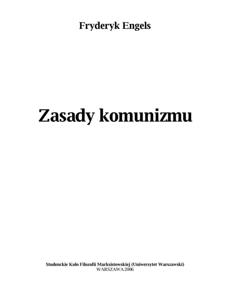 Fryderyk Engels Zasady komunizmu Studenckie Koło Filozofii Marksistowskiej (Uniwersytet Warszawski) WARSZAWA 2006 Fryderyk Engels – Zasady komunizmu (1847 rok) Tekst Fryderyka Engelsa „Zasady komunizmu” („Grundsätze des Kommunismus”) został napisany w październiku-listopadzie 1847 r. jako projekt programu dla Związku Komunistów. W języku polskim został opublikowany po raz pierwszy w r. 1920 we Lwowie przez Ludowe Towarzystwo Wydawnicze, w tłumaczeniu Fr. Dorskiego. Odpowiedzi na pytania 9, 22 i 23 zostały uzupełnione na podstawie wcześniejszego rękopisu Engelsa pt. „Zarys komunistycznego wyznania wiary” („Draft of the Communist Confession of Faith”) napisanego w czerwcu 1847 roku i przez wiele lat uważanego za zaginiony. Odnaleziony został w 1968 roku i po raz pierwszy opublikowany w 1969 roku w Hamburgu razem z czterema innymi dokumentami odnoszącymi się do pierwszego kongresu Związku Komunistów w broszurze zatytułowanej „Gründungs Dokumente des Bundes der Kommunisten” („Dokumenty założycielskie Związku Komunistów”). Podstawa niniejszego wydania (w wersji bez uzupełnień): Karol Marks, Fryderyk Engels, „Dzieła”, tom 4, wyd. Książka i Wiedza, Warszawa 1962. Tłumaczenie z języka niemieckiego: Franciszka Landau. Przejrzenie przekładu i uzupełnienia w oparciu o wydanie angielskie: Maciej Zbylut. -2© Studenckie Koło Filozofii Marksistowskiej (UW) www.skfm-uw.w.pl Fryderyk Engels – Zasady komunizmu (1847 rok) 1 pytanie: Co to jest komunizm? Odpowiedź: Komunizm jest to nauka o warunkach wyzwolenia proletariatu. 2 pytanie: Co to jest proletariat? Odpowiedź: Proletariatem nazywamy tę klasę społeczeństwa, która środki do życia czerpie jedynie i wyłącznie ze sprzedaży swej pracy1, nie zaś z zysku od jakiegokolwiek kapitału; klasę, której dola i niedola, życie i śmierć oraz całe istnienie zależne jest od popytu na pracę, a więc od okresowych zmian pomyślnego i niepomyślnego stanu interesów, od wahań nieokiełznanej konkurencji. Słowem, proletariat, inaczej klasa proletariuszy, to klasa robotnicza dziewiętnastego wieku. 3 pytanie: A więc nie zawsze istnieli proletariusze? Odpowiedź: Nie, nie zawsze. Biedota i klasy pracujące istniały zawsze2; klasy pracujące żyły też przeważnie w biedzie. Lecz taka biedota, tacy robotnicy, którzy żyliby w wyżej opisanych warunkach, a więc proletariusze, nie zawsze istnieli, podobnie jak konkurencja nie zawsze była wolna i nieokiełznana. 4 pytanie: Jak powstał proletariat? Odpowiedź: Proletariat powstał wskutek rewolucji przemysłowej, która dokonała się w drugiej połowie ubiegłego wieku w Anglii i powtarzała się odtąd we wszystkich cywilizowanych krajach świata. Tę rewolucję przemysłową wywołało wynalezienie maszyny parowej oraz najróżnorodniejszych maszyn przędzalniczych, mechanicznego warsztatu tkackiego i wielu innych urządzeń mechanicznych. Maszyny te, bardzo kosztowne, nabywane zatem wyłącznie przez wielkich kapitalistów, zmieniły cały dotychczasowy sposób produkcji i wyparły dotychczasowych robotników, dostarczały bowiem lepszych i tańszych towarów aniżeli te, które robotnicy mogli produkować na swoich niedoskonałych kołowrotkach i warsztatach tkackich. Maszyny te oddały zatem w całości przemysł w ręce wielkich kapitalistów i pozbawiły nikłą własność robotników (narzędzia, warsztaty tkackie itp.) wszelkiej wartości, tak że kapitaliści wkrótce zagarnęli wszystko w swoje ręce, zaś robotnicy zostali ze wszystkiego wyzuci. W ten sposób wprowadzony został system fabryczny w dziedzinie produkcji materiałów odzieżowych. Z chwilą gdy dany był pierwszy bodziec do wprowadzenia maszyn i systemu fabrycznego, znalazł on bardzo szybko zastosowanie i w pozostałych gałęziach przemysłu, a głównie w drukarstwie tekstylnym i książkowym, w garncarstwie i przemyśle metalowym. W coraz większym stopniu przyjmował się podział pracy pomiędzy poszczególnych robotników, tak że robotnik, który dawniej wykonywał daną pracę w całości, obecnie wykonywał tylko jej część. Ten podział pracy umożliwił tańsze i szybsze dostarczanie produktów. Redukował on też pracę każdego poszczególnego robotnika do niezmiernie prostej i wciąż powtarzanej mechanicznej czynności, Początkowo Marks i Engels mówili o sprzedaży pracy. Później Marks wykazał, że robotnik nie sprzedaje swojej pracy, lecz swoją siłę roboczą. Patrz: objaśnienia Engelsa we wstępie do rozprawy Marksa „Praca najemna i kapitał”. – Red. 2 Patrz: uwaga Engelsa o poprzedzającym społeczeństwo klasowe bezklasowym społeczeństwie pierwotnym w notce do „Manifestu Partii Komunistycznej” (Karol Marks, Fryderyk Engels, „Dzieła”, t. 4, Warszawa 1962, str. 514). – Red. 1 -3© Studenckie Koło Filozofii Marksistowskiej (UW) www.skfm-uw.w.pl Fryderyk Engels – Zasady komunizmu (1847 rok) którą nie tylko równie dobrze, ale znacznie lepiej mogła wykonać maszyna. W ten sposób wszystkie te gałęzie przemysłu, jedna po drugiej, popadały na równi z przędzalnictwem i tkactwem we władanie siły pary, maszyn i systemu fabrycznego. Ale tym samym dostały się one jednocześnie całkowicie w ręce wielkich kapitalistów, robotnicy zaś pozbawieni zostali i tutaj ostatnich resztek swej samodzielności. Stopniowo system fabryczny ogarniał nie tylko manufakturę we właściwym tego słowa znaczeniu, lecz również rzemiosło, albowiem i w tej dziedzinie wielcy kapitaliści, zakładając duże warsztaty, które pozwalały oszczędzić wiele kosztów i znacznie dalej posunąć podział pracy, coraz bardziej wypierali drobnych rzemieślników. W konsekwencji doszliśmy obecnie do tego, że w krajach cywilizowanych prawie każdy rodzaj pracy wykonywany jest systemem fabrycznym, że prawie we wszystkich dziedzinach pracy rzemiosło i manufaktura zostały wyparte przez wielki przemysł. Wskutek tego dotychczasow