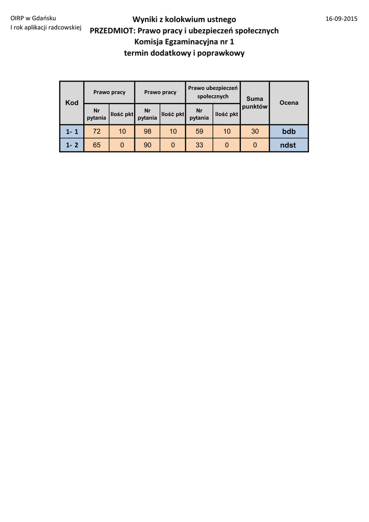 OIRP w Gdańsku I rok aplikacji radcowskiej Wyniki z kolokwium ustnego PRZEDMIOT: Prawo pracy i ubezpieczeń społecznych Komisja Egzaminacyjna nr 1 termin dodatkowy i poprawkowy Prawo pracy Prawo pracy Prawo ubezpieczeń społecznych Kod Nr Nr Nr Ilość pkt Ilość pkt pytania pytania pytania 16-09-2015 Suma punktów Ocena Ilość pkt 1- 1 72 10 98 10 59 10 30 bdb 1- 2 65 0 90 0 33 0 0 ndst