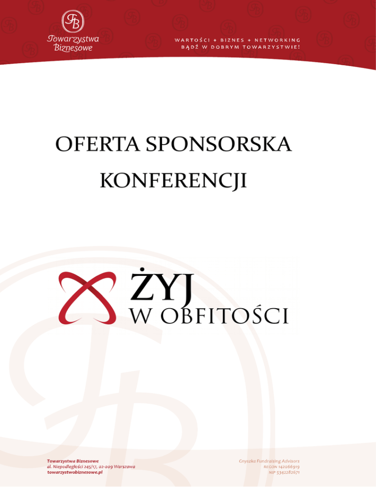 OFERTA SPONSORSKA KONFERENCJI Towarzystwa Biznesowe zostały założone 6 lat temu przez Macieja Gnyszkę w celu skupiania przedsiębiorców. Dzięki temu przedsiębiorcy mogą tworzyć sieć osób życzliwych, których założeniem jest wzrost wszelkich form kapitału. Wyróżniamy dwa główne cele Towarzystw Biznesowych, są to: cel przyrodzony - bogacenie się Członków TB, cel nadprzyrodzony: utwierdzenie Członków TB w poczuciu misji bycia przedsiębiorcą (przez to dążącym do świętości przez swoje powołanie). Konsekwencją istnienia TB ma być w perspektywie 20 lat budowa silnej klasy średniej i kilku katolickich milionerów, którzy wspierają finansowo dobre inicjatywy trzeciego sektora. Z okazji 6-lecia Towarzystw Biznesowych organizujemy już trzecią konferencję Żyj w Obfitości. Do udziału w konferencji chcemy przyciągnąć przedsiębiorców prowadzących małe i średnie firmy, osoby zainteresowane założeniem własnego biznesu chcące wyrwać się z korporacji jak również ambitnych studentów. Chcemy pokazać, że trzymając się konserwatywnych wartości można zbudować potężny biznes. Pragniemy stworzyć okazję do zaprezentowania ciekawych ludzi, którzy osiągnęli sukces w zarządzaniu dużym biznesem. Pierwsza konferencja miała miejsce w listopadzie 2013 roku pod hasłem "Bądź milionerem". Pięciu zaproszonych prelegentów (polskich milionerów) opowiadało o różnych aspektach związanych z prowadzeniem biznesu. Konferencja odbyła się w hali Expo XXI. Tutaj znajduje się wideorelacja z pierwszego wydarzenia: https://www.youtube.com/watch?v=xgbCjNfalHs i relacja Radia Wnet: http://www.radiownet.pl/publikacje/dobry-pracownik-nie-szuka-etatu-badzmilionerem W zeszłym roku II konferencja odbyła się pod nowym tytułem: "Bądź milionerem" zostało zastąpionenazwą "Żyj w obfitości". Do Hotelu Golden Tulip w Warszawie przybyło prawie 200 osób. Prelegentami byli m.in. Pan Henryk Siodmok z Atlasu, Pan Paweł Kastory z DDB, Pan Wojciech Sobieraj z Alior Banku. Zwieńczeniem wydarzenia były bankiet z okazji 5. urodzin Towarzystw Biznesowych, podczas którego odbyło się m.in. rozstrzygnięcie konkursu dla gimnazjalistów, w którym nagrodą był dwutygodniowy pobyt w Szwajcarii na zaproszenie Instytutu Le Rosey. Tutaj znajduje się wideorelacja z ostatniego wydarzenia: https://www.youtube.com/watch?v=tOmhiuEejaI W tym roku będzie miała miejsce III edycja wydarzenia również pod tytułem: - "Żyj w obfitości". Odbędzie się 23. kwietnia na Stadionie Narodowym w Warszawie. Wydarzenia zakończy się wieczornymi 6. urodzinami Towarzystw Biznesowych, w Hotelu Mercure przy ulicy Kruczej 28. W tym roku do udziału w charakterze prelegenta zaprosiliśmy m.in.; Panią Barbarę Grzelak współwłaścicielkę Atlasu, Pana Pawła Kastorego z DDB, Pana Macieja Kopra twórcę m.in. portalu Przeznaczeni.pl, Panią Maję Meissner z firmy Meissner & Partners, Panią Barbarę Komorowską z Bakomy, Pana Wojciecha Apela prezesa grupy 3S S.A. i Pana Mariusza Bobera prezesa Grupy Azoty. Wydarzenie nie ma wprost charakteru ani religijnego, ani ideowego. Liczymy jednak na to, że staranny dobór nieprzypadkowych Prelegentów spowoduje, że konferencja będzie swego rodzaju świadectwem na temat tego, jak ważne w biznesie są uczciwość, rzetelność, czy wreszcie – rodzina. Konferencja „Żyj w Obfitości” organizowana przez Towarzystwa Biznesowe 23. kwietnia na Stadionie Narodowym to wyjątkowa okazja dla Państwa firmy na zaprezentowanie usług i produktów przed: - przedsiębiorcami prowadzącymi małe i średnie firmy, - osobami z korporacji myślącymi o stworzeniu własnego biznesu, - ambitnymi studentami. Umożliwiamy zdobycie nowych klientów dzięki profilowi, tematyce oraz prestiżowi organizowanego przez nas wydarzenia. W związku z tym proponujemy Państwu współpracę pozwalającą na zaprezentowanie Państwa firmy podczas Konferencji, zawartą w następujących pakietach: Pakiet Strategiczny (1 miejsce) umieszczenie logotypu Państwa firmy w górnej części materiałów informacyjnych dotyczących Konferencji (1,5 razy większe niż w przypadku Pakietu Złotego), dodanie logotypu Państwa firmy w miejscu dla głównych Sponsorów na oficjalnej stronie internetowej Konferencji www.zyjwobfitosci.pl, umieszczenie logotypu Państwa firmy w tle sceny w taki sposób, by było jak najlepiej widoczne, zaproszenie 3 przedstawicieli Państwa firmy na Konferencję, możliwość ustawienia stoiska Państwa firmy w specjalnie wyznaczonej strefie, możliwość ustawienia 2 roll-up'ów Sponsora na sali w okolicach sceny i przy wejściu, możliwość dołączenia Państwa materiałów promocyjnych (płyty CD, DVD, pendrive) dodawanych do zestawów upominkowych rozdawanych uczestnikom Konferencji, wywiad ze Sponsorem w Merkuryuszu, wywiad video ze Sponsorem, 2–minutowa prezentacja Państwa firmy podczas uroczystego otwarcia Konferencji. Cena pakietu: 25 000zł netto. Pakiet Platynowy: (1 miejsce) umieszczenie logotypu Państwa firmy w górnej części materiałów informacyjnych dotyczących Konferencji, dodanie logotypu Państwa firmy w górnej części dla Sponsorów na oficjalnej stronie internetowej Konferencji www.zyjwobfitosci.pl, umieszczenie logotypu Państwa firmy w tle sceny w taki sposób, by było widoczne, zaproszenie 3 przedstawicieli Państwa firmy na Konferencję, możliwość zaprezentowania swoich drukowanych materiałów informacyjnych (ulotki, broszury, plakaty) w specjalnie wyznaczonych miejscach dedykowanych tymże materiałom, możliwość przygotowania multimedialnych materiałów promocyjnych (płyty CD, DVD, pendrive) dodawanych do zestawów upominkowych rozdawanych uczestnikom Konferencji, możliwość ustawienia stoiska Państwa firmy w specjalnie wyznaczonej strefie, wywiad ze Sponsorem w Merkuryuszu, wywiad video ze Sponsorem. Cena pakietu: 20 000zł netto. Pakiet Złoty: (2 miejsca) możliwość zaprezentowania swoich dru