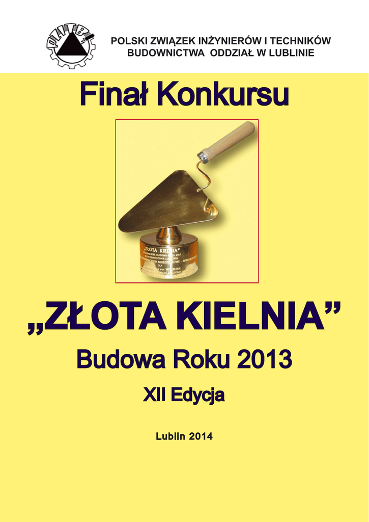 POLSKI ZWIĄZEK INŻYNIERÓW I TECHNIKÓW BUDOWNICTWA ODDZIAŁ W LUBLINIE Finał Konkursu „ZŁOTA KIELNIA” Budowa Roku 2013 2012 XIIEdycja Edycja XI Lublin 2014 2013 Polski Związek Inżynierów i Techników Budownictwa Oddział w Lublinie przy udziale Stowarzyszenia Architektów Polskich, Lubelskiej Okręgowej Izby Inżynierów Budownictwa i Lubelskiego Wojewódzkiego Inspektoratu Nadzoru Budowlanego ogłasza Konkurs: „ZŁOTA KIELNIA" Budowa Roku 2013 XII EDYCJA Patronat nad Konkursem objęli: Marszałek Województwa Lubelskiego Wojewoda Lubelski Dyrektor Telewizji Polskiej S.A. Oddział w Lublinie Prezes Zarządu Polskiego Radia Lublin S.A. Konkurs promuje inwestycje wyróżniające się nowoczesnością rozwiązań i zastosowanych technologii, wysoką jakością wykonawstwa, dobrą organizacją procesu budowlanego, wysokim poziomem bezpieczeństwa pracy i ochrony środowiska. Nagrodzone inwestycje stanowią na rynku budowlanym szczególną rekomendacją dla ich inwestorów, projektantów i firm wykonawczych. WARUNKI KONKURSU 1. CEL KONKURSU Celem Konkursu jest wyłonienie inwestycji charakteryzujących się nowoczesnością rozwiązań i zastosowanych technologii, wysoką jakością wykonawstwa, dobrą organizacją procesu budowlanego, wysokim poziomem bezpieczeństwa pracy i ochrony środowiska. 2. PRZEDMIOT KONKURSU Przedmiotem Konkursu są inwestycje wszystkich rodzajów budownictwa, które decyzje o pozwoleniu na użytkowanie otrzymały w okresie od 1 czerwca 2012 r. do 31 maja 2014 r. 3. ORGANIZACJA KONKURSU Konkurs organizuje Komitet Organizacyjny powołany przez Zarząd PZITB Oddział w Lublinie. Komitet Organizacyjny powołuje Sąd Konkursowy, zatwierdza Regulamin Konkursu oraz popularyzuje Konkurs i jego Laureatów. Sąd Konkursowy dokonuje oceny inwestycji zgłoszonych do Konkursu w poszczególnych kategoriach i według ustalonych kryteriów oraz wyłania Laureatów Konkursu. 4. KATEGORIE OBIEKTÓW I BUDOWLI Kategoria I Budownictwo mieszkaniowe Kategoria VIII Budownictwo biurowe Kategoria II Budownictwo inżynieryjne Kategoria IX Rozbudowa i przebudowa Kategoria III Budownictwo użyteczności publicznej Kategoria X Budownictwo drogowe Kategoria IV Budownictwo ekologiczne Kategoria XI Budownictwo drewniane Kategoria V Budownictwo sportowe i rekreacyjne Kategoria XII Zastosowanie nowych technologii Kategoria VI Budownictwo handlowe i usługowe Kategoria XIII Rewaloryzacja zabytków Kategoria VII Budownictwo magazynowe i przemysłowe 5. KRYTERIA OCENY Kategoria XIV Inne Sąd Konkursowy dokonuje oceny zgłoszonych inwestycji w oparciu o kryteria takie jak: − jakość wykonanych robót budowlanych, − organizacja procesu inwestycyjnego w oparciu o relacje jego uczestników i dokumentację przebiegu budowy, − zastosowanie nowoczesnych technologii i materiałów, − rozwiązania architektoniczne i konstrukcyjne, − walory użytkowe, − dostosowanie do potrzeb osób niepełnosprawnych. 6. TRYB PRACY SĄDU KONKURSOWEGO I etap formalne przyjęcie zgłoszenia inwestycji do Konkursu i powiadomienie jednostki zgłaszającej o rozpoczęciu procedury konkursowej – w terminie do 14 dni od daty zgłoszenia II etap analiza i ocena zgłoszonych inwestycji na podstawie przedstawionych dokumentów i wizji lokalnych w oparciu o przyjęte kryteria oceny – w terminie do końca września 2014 r. III etap wyłonienie Laureatów Konkursu IV etap ogłoszenie wyników oraz wręczenie nagród i wyróżnień podczas uroczystej gali w dniu 6 listopada 2014 r. 7. NAGRODY Laureaci Konkursu otrzymają następujące nagrody: − Statuetki „ZŁOTA KIELNIA" Budowa Roku 2013 dla zgłaszających inwestycje, − Tablice na budynki lub budowle, − Dyplomy uznania dla zgłaszających inwestycje do Konkursu, − Statuetki-miniaturki dla kierownika budowy, projektanta i inspektora nadzoru, Ponadto Laureaci Konkursu będą promowani poprzez: − Publikacje w mediach, − Okolicznościowe wydawnictwo konkursowe. 8. ZASADY UCZESTNICTWA Zgłoszenia do Konkursu może dokonać każdy z uczestników procesu budowlanego: − Inwestor lub jednostka przygotowujące inwestycję do realizacji, − Generalny/główny wykonawca robót budowlanych, − Użytkownik. Zgłaszający jest zobowiązany do: − poinformowania inwestora danej inwestycji o zamiarze zgłoszenia do Konkursu − zapewnienia członkom Sądu Konkursowego możliwości dokonania wizji lokalnej oraz zapoznania się z dokumentacji projektową inwestycji i dokumentacją budowy. Zgłaszający zobowiązany jest wnieść opłatę organizacyjną w wysokości odniesionej do kosztów inwestycji: − przy nakładach inwestycyjnych do 1.000.000 zł, kwotę od 1.500 do 3.000 zł netto plus 23 % VAT − przy nakładach inwestycyjnych do 2.000.000 zł, kwotę 4.000 zł netto plus 23 % VAT − przy nakładach inwestycyjnych do 5.000.000 zł, kwotę 5.000 zł netto plus 23 % VAT − przy nakładach inwestycyjnych do 10.000.000 zł, kwotę 6.000 zł netto plus 23 % VAT − przy nakładach inwestycyjnych powyżej 10.000.000 zł, kwotę 7.000 zł netto plus 23 % VAT. 9. ZGŁOSZENIE INWESTYCJI DO KONKURSU Do Konkursu można zgłaszać wyłącznie inwestycje, które uzyskały decyzję o pozwoleniu na użytkowanie. Zgłoszenie powinno zawierać: − deklarację przystąpienia do Konkursu „ZŁOTA KIELNIA" (załącznik 1), − podstawowe dane charakteryzujące inwestycję (załącznik 2), − dowód wniesienia opłaty organizacyjnej. 10. POSTANOWIENIA OGÓLNE Decyzje Sądu Konkursowego są ostateczne. Organizator Konkursu zastrzega sobie prawo do zawieszenia procedury konkursowej bez wyłonienia laureatów. Zgłoszenia inwestycji do Konkursu przyjmuje: Zarząd PZITB Oddział w Lublinie ul. Marii Curie-Skłodowskiej 3/17, 20-029 Lublin z dopiskiem: Konkurs „ZŁOTA KIELNIA” Opłaty organizacyjne prosimy wnosić na konto: PZITB Oddział w Lublinie 57 1020 3150 0000 3502 0044 6955 Tytuł przelewu: Konkurs „ZŁOTA KIELNIA” „ZŁOTA KIELNIA" Budowa Roku 2013 XII E