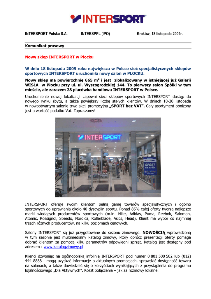 INTERSPORT Polska S.A. INTERSPPL (IPO) Kraków, 18 listopada 2009r. Komunikat prasowy Nowy sklep INTERSPORT w Płocku W dniu 18 listopada 2009 roku największa w Polsce sieć specjalistycznych sklepów sportowych INTERSPORT uruchomiła nowy salon w PŁOCKU. Nowy sklep ma powierzchnię 665 m2 i jest zlokalizowany w istniejącej już Galerii WISŁA w Płocku przy ul. ul. Wyszogrodzkiej 144. To pierwszy salon Spółki w tym mieście, ale zarazem 28 placówka handlowa INTERSPORT w Polsce. Uruchomienie nowej lokalizacji zapewni sieci sklepów sportowych INTERSPORT dostęp do nowego rynku zbytu, a także powiększy liczbę stałych klientów. W dniach 18-30 listopada w nowootwartym salonie trwa akcji promocyjna „SPORT bez VAT”. Cały asortyment obniżony jest o wartość podatku Vat. Zapraszamy! INTERSPORT oferuje swoim klientom pełną gamę towarów specjalistycznych i ogólno sportowych do uprawiania około 40 dyscyplin sportu. Ponad 85% całej oferty tworzą najlepsze marki wiodących producentów sportowych (m.in. Nike, Adidas, Puma, Reebok, Salomon, Atomic, Rossignol, Speedo, Nordica, Rollerblade, Asics, Head). Klient ma wybór co najmniej trzech różnych producentów, na kilku poziomach cenowych. Salony INTERSPORT są już przygotowane do sezonu zimowego. NOWOŚCIĄ wprowadzoną w tym sezonie jest multimedialny katalog zimowy, który oprócz prezentacji oferty pomaga dobrać klientom za pomocą kilku parametrów odpowiedni sprzęt. Katalog jest dostępny pod adresem : www.katalogzimowy.pl Klienci dzwoniąc na ogólnopolską infolinię INTERSPORT pod numer 0 801 500 502 lub (012) 444 8888 - mogą uzyskać informacje o aktualnych promocjach, sprawdzić dostępność towaru na salonach, a także dowiedzieć się o korzyściach wynikających z przystąpienia do programu lojalnościowego „Dla Aktywnych”. Koszt połączenia – jak za rozmowy lokalne. INTERSPORT Polska S.A. Spółka jest w Polsce liderem wśród sieci sklepów sportowych, posiadającym obecnie 28 salonów zlokalizowanych w 16 największych miastach Polski: czterech w Warszawie i Poznaniu, trzech w Krakowie i Wrocławiu, dwóch w Gdańsku i Łodzi oraz po jednym salonie w Bielsku-Białej, Białymstoku, Bytomiu, Bydgoszczy, Częstochowie, Gdyni, Katowicach, Płocku, Sosnowcu i Opolu. Łączna powierzchnia salonów wynosi obecnie ponad 31 tys. m2. W bieżącym roku sieć INTERSPORT Polska S.A. otworzyła 3 nowe salony: (1) w Galerii Solaris w Opolu, (2) w Galerii Jurajskiej w Częstochowie oraz (3) w Galerii Wisła w Płocku. Uruchamiając nowe lokalizacje Spółka powiększyła w 2009 roku powierzchnię sprzedaży o 2570 m 2. Według wstępnych szacunków, INTERSPORT Polska S.A. chce osiągnąć w roku 2009 dwudziestodwuprocentowy wzrost przychodów ze sprzedaży do około 230 mln zł oraz planuje znaczną poprawę zysku netto w stosunku do 2008 roku. Dodatkowych informacji udziela: Iwona Książek Kierownik Działu Komunikacji i RI tel. (012) 44 48 104, 600 401 271 e-mail: [email protected] www.inwestor.intersport.pl