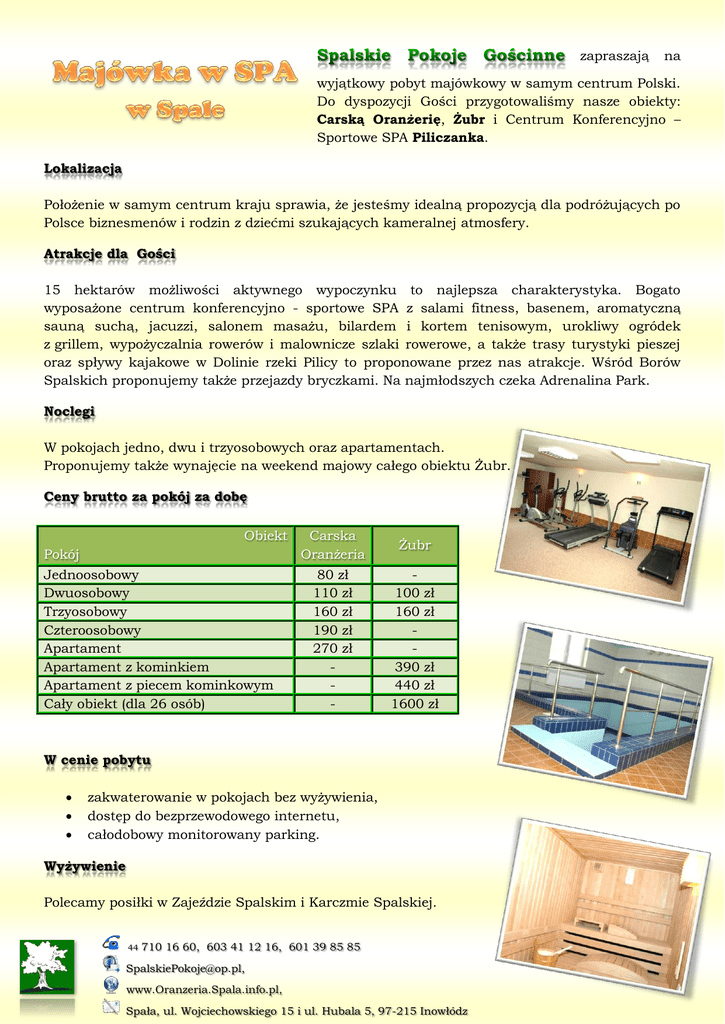 zapraszają na wyjątkowy pobyt majówkowy w samym centrum Polski. Do dyspozycji Gości przygotowaliśmy nasze obiekty: Carską Oranżerię, Żubr i Centrum Konferencyjno – Sportowe SPA Piliczanka. Lokalizacja Położenie w samym centrum kraju sprawia, że jesteśmy idealną propozycją dla podróżujących po Polsce biznesmenów i rodzin z dziećmi szukających kameralnej atmosfery. Atrakcje dla Gości 15 hektarów możliwości aktywnego wypoczynku to najlepsza charakterystyka. Bogato wyposażone centrum konferencyjno - sportowe SPA z salami fitness, basenem, aromatyczną sauną suchą, jacuzzi, salonem masażu, bilardem i kortem tenisowym, urokliwy ogródek z grillem, wypożyczalnia rowerów i malownicze szlaki rowerowe, a także trasy turystyki pieszej oraz spływy kajakowe w Dolinie rzeki Pilicy to proponowane przez nas atrakcje. Wśród Borów Spalskich proponujemy także przejazdy bryczkami. Na najmłodszych czeka Adrenalina Park. Noclegi W pokojach jedno, dwu i trzyosobowych oraz apartamentach. Proponujemy także wynajęcie na weekend majowy całego obiektu Żubr. Ceny brutto za pokój za dobę Obiekt Pokój Jednoosobowy Dwuosobowy Trzyosobowy Czteroosobowy Apartament Apartament z kominkiem Apartament z piecem kominkowym Cały obiekt (dla 26 osób) Carska Oranżeria Żubr 80 zł 110 zł 160 zł 190 zł 270 zł - 100 zł 160 zł 390 zł 440 zł 1600 zł W cenie pobytu zakwaterowanie w pokojach bez wyżywienia, dostęp do bezprzewodowego internetu, całodobowy monitorowany parking. Wyżywienie Polecamy posiłki w Zajeździe Spalskim i Karczmie Spalskiej. 44 710 16 60, 603 41 12 16, 601 39 85 85 [email protected], www.Oranzeria.Spala.info.pl, Spała, ul. Wojciechowskiego 15 i ul. Hubala 5, 97-215 Inowłódz