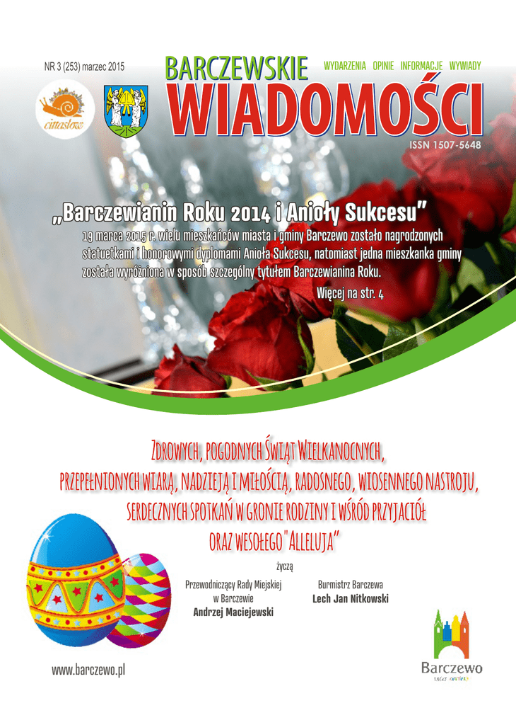 NR 3 (253) marzec 2015 życzą Przewodniczący Rady Miejskiej w Barczewie Andrzej Maciejewski Burmistrz Barczewa Lech Jan Nitkowski Szanowni Państwo, uprzejmie zawiadamiamy, że w dniu 24.04.2015 r. w Biurze Informacji Miasta i Gminy Barczewo odbędzie się dyżur konsultanta Mobilnego Punktu Informacji Funduszy Europejskich. Wszystkich zainteresowanych uzyskaniem informacji na temat dotacji unijnych zapraszamy w godzinach 9:00-13:00. Adres siedziby: Biuro Informacji Miasta i Gminy Barczewo ul. Mickiewicza 12 11-010 Barczewo Dodatkowe informacje można uzyskać w Głównym Punkcie Informacyjnym Funduszy Europejskich przy Urzędzie Marszałkowskim Województwa Warmińsko-Mazurskiego w Olsztynie, telefon: 89 521 94 83. Informujemy, że w Szkole Podstawowej w Bartołtach Wielkich w roku szkolnym 2014/2015 kontynuujemy realizację projektu „Zdolne dzieciaki!” współfinansowanego ze środków Unii Europejskiej w ramach Europejskiego Funduszu Społecznego, realizowanego z Programu Operacyjnego Kapitał Ludzki, Priorytet IX Rozwój wykształcenia i kompetencji w regionach, Działanie 9.1.2 Wyrównywanie szans edukacyjnych uczniów z grup o utrudnionym dostępie do edukacji oraz zmniejszanie różnic w jakości usług edukacyjnych. W ramach projektu uczniowie korzystają z dodatkowych zajęć edukacyjnych: Blok szóstoklasisty: Zajęcia humanistyczne Zajęcia matematyczne Zajęcia przyrodnicze Zajęcia komputerowe TIK Robotyka Zajęcia z języka angielskiego. W ramach projektu uczniowie mają zapewniony obiad oraz transport do domu. Biuro projektu Szkoła Podstawowa w Bartołtach Wielkich CZŁOWIEK – NAJLEPSZA INWESTYCJA Serdecznie zapraszamy. Projekt pt. „Zdolne dzieciaki!” współfinansowany ze środków Unii Europejskiej w ramach Europejskiego Funduszu Społecznego Radosnych chwil spędzonych w rodzinnym gronie, optymizmu i siły płynącej z odradzającego się życia z okazji Świąt Wielkiejnocy – mieszkańcom sołectw życzą Sołtysi gminy Barczewo WIADOMOŚCI BARCZEWSKIE Pięknych Świąt Wielkanocnych, obfitujących w rodzinne spotkania, pozytywne emocje i wiosenną radość życzą Redakcja „Wiadomości Barczewskich” oraz Dyrektor i pracownicy Centrum Kultury i Promocji Gminy w Barczewie Wydanie bieżące i numery archiwalne dostępne są w Biurze Informacji w Barczewie przy ul. Mickiewicza 12 oraz na www.wb.barczewo.pl Współpraca: M. Tomczak, A. Wojszel, A. Hodt, D. Kucińska, A. Markowicz, J. Pastuszenko, D. Gnatowska, A. Duda-Radziwon, BUKS, J. F. Krakowiak, B. Idzikowski, G. Białecki, Barczewo Biega, B. Barwińska. Redaktor naczelny Mariola Łukowska-Juckiewicz e-mail: [email protected] Redaktor Wojciech Zenderowski e-mail: [email protected] Redaktor Lidia Zelman Redaktor Magdalena Łowkiel-Klimek Redaktor, korekta Joanna Truszkowska Redaktor Bertrand Abramczyk 2 Skład DTP: Zbigniew Kozłowski e-mail: [email protected] Oprac. graf. okładki: Zbigniew Kozłowski Zdjęcie na okładce róże z aniołami - Zbigniew Kozłowski, pisanki - www.webdesignhot.com Wydawca: Centrum Kultury i Promocji Gminy Adres: Barczewo, ul. Słowackiego 5 Tel. / fax. 89 514 82 81 Druk: “Algraf” Tadeusz i Halina Matuszewicz 11-300 Biskupiec, ul. Harcerska 19, tel. 89 715 34 92 Redakcja nie ponosi odpowiedzialności za treść ogłoszeń i reklam, nie zwraca tekstów nie zamówionych oraz zastrzega sobie prawo skracania i opracowywania tekstów. Redakcja informuje o możliwości zamieszczenia reklam. GAZETA SAMORZĄDOWA 3 (253) marzec 2015 www.wb.barczewo.pl Z Urzędu Miejskiego w Barczewie Barczewo „na styku kultur” W dniach 13-15 marca 2015 r. w Łodzi odbyły się XXII Targi Turystyczne „Na Styku Kultur”, na które gmina Barczewo została zaproszona ze względu na członkostwo w Międzynarodowym Stowarzyszeniu Sieci Miast Cittaslow. Wspólnie z 14 miastami z województwa warmińsko–mazurskiego, należącymi także do sieci przygotowano stoisko wystawiennicze, ukazujące walory każdej z gmin. Gmina Barczewo zaprezentowała tradycyjny strój warmiński, namiastkę lokalnej twórczości, której autorką jest Anna Wojszel oraz regionalne przysmaki. Sieć Cittaslow przyciągnęła wielu zwiedzających, zarówno na stoisko jak i w efekcie do odwiedzenia Warmii i Mazur. Dla przypomnienia 9 listopada 2013 roku Barczewo stało się oficjalnie członkiem Międzynarodowego Stowarzyszenia Miast Cittaslow. Tak naprawdę większość naszych mieszkańców zastanawia się, czym jest Cittaslow? Co przynosi naszej społeczności uczestnictwo w tym międzynarodowym stowarzyszeniu? Co musimy jeszcze zrobić, a co zostało już zrobione w idei Slow City? Barczewo w ostatnich latach „wyszło z cienia” dosłownie i w przenośni. Jeszcze 8 lat temu nasze miasto było słabo oświetlone, niebezpieczne i ogólnie przygnębiające. I to jest fakt, z którym nikt nie będzie polemizował. A dziś? Jest o nas głośno i pozytywnie w lokalnych i krajowych mediach, mamy się czym pochwalić, mieszkańcy zaczęli dbać o swoje miasto, korzystając w pełni z jego uroków i oczywiście piętnując to czego jeszcze nie zrobiono, ale zauważyli też, że władze Barczewa chcą coś zrobić właśnie dla nich, a nie dla siebie. Jeżeli ten trend wspólnego działania na rzecz Barczewa utrzyma się, możemy być pewni, że Barczewo jeszcze bardziej zmieni swoje oblicze. Co konkretnie wydarzy się w najbliższej przyszłości w Barczewie i całej gminie? Mieszkańcy od wielu miesięcy sygnalizowali, aby w centrum miasta powstał duży plac zabaw, siłownia zewnętrzna, skatepark, czy nawet pumptruck. Teren przeznaczony na tego typu urządzenia rekreacyjne i sportowe znajduje się za amfiteatrem miejskim w kierunku basenów DPS. Jeżeli sytuacja prawna i finansowa gminy pozwoli (a w nowej perspektywie unijnej jest duża szansa pozyskania środków właśnie na ten cel), w przeciągu kilku lat wszystko to powinno powstać w naszym mieście. Utworzony zostanie również program estetyzacji Barczewa, w k