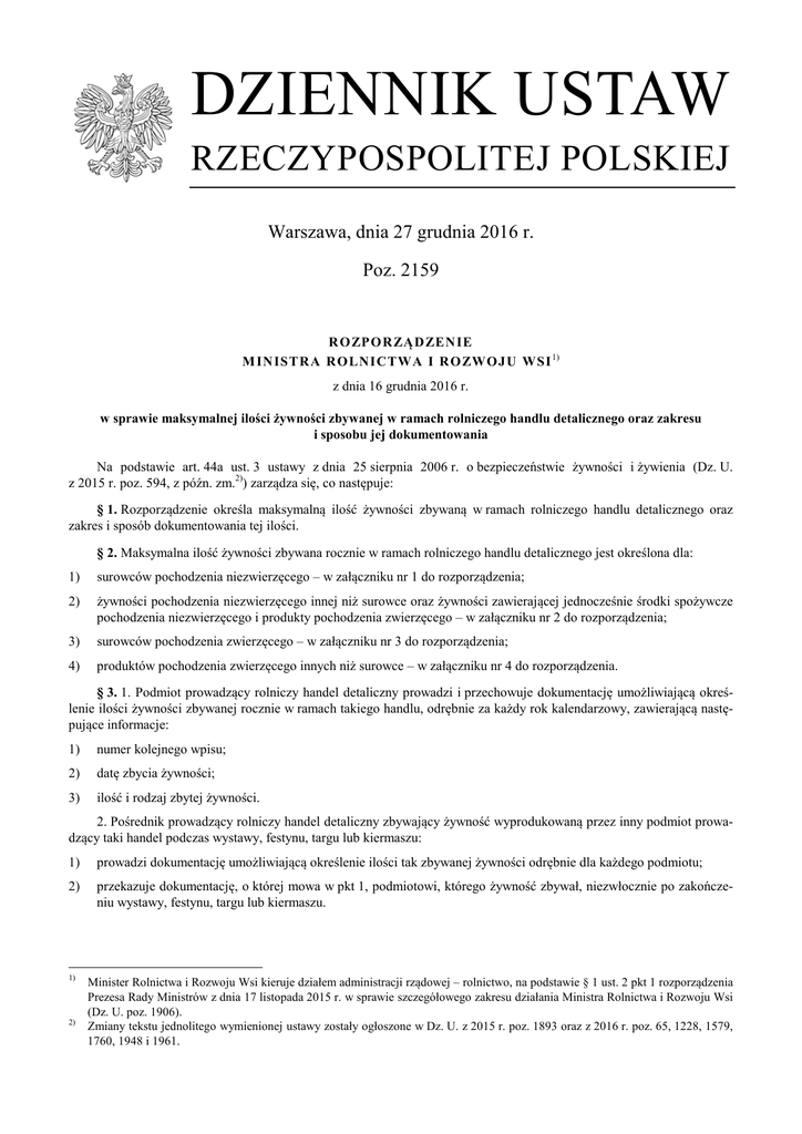 DZIENNIK USTAW RZECZYPOSPOLITEJ POLSKIEJ Warszawa, dnia 27 grudnia 2016 r. Poz. 2159 RO ZPO RZĄDZENIE M INISTRA RO LNICTWA I RO ZWO J U WSI 1) z dnia 16 grudnia 2016 r. w sprawie maksymalnej ilości żywności zbywanej w ramach rolniczego handlu detalicznego oraz zakresu i sposobu jej dokumentowania Na podstawie art. 44a ust. 3 ustawy z dnia 25 sierpnia 2006 r. o bezpieczeństwie żywności i żywienia (Dz. U. z 2015 r. poz. 594, z późn. zm.2)) zarządza się, co następuje: § 1. Rozporządzenie określa maksymalną ilość żywności zbywaną w ramach rolniczego handlu detalicznego oraz zakres i sposób dokumentowania tej ilości. § 2. Maksymalna ilość żywności zbywana rocznie w ramach rolniczego handlu detalicznego jest określona dla: 1) surowców pochodzenia niezwierzęcego – w załączniku nr 1 do rozporządzenia; 2) żywności pochodzenia niezwierzęcego innej niż surowce oraz żywności zawierającej jednocześnie środki spożywcze pochodzenia niezwierzęcego i produkty pochodzenia zwierzęcego – w załączniku nr 2 do rozporządzenia; 3) surowców pochodzenia zwierzęcego – w załączniku nr 3 do rozporządzenia; 4) produktów pochodzenia zwierzęcego innych niż surowce – w załączniku nr 4 do rozporządzenia. § 3. 1. Podmiot prowadzący rolniczy handel detaliczny prowadzi i przechowuje dokumentację umożliwiającą określenie ilości żywności zbywanej rocznie w ramach takiego handlu, odrębnie za każdy rok kalendarzowy, zawierającą następujące informacje: 1) numer kolejnego wpisu; 2) datę zbycia żywności; 3) ilość i rodzaj zbytej żywności. 2. Pośrednik prowadzący rolniczy handel detaliczny zbywający żywność wyprodukowaną przez inny podmiot prowadzący taki handel podczas wystawy, festynu, targu lub kiermaszu: 1) prowadzi dokumentację umożliwiającą określenie ilości tak zbywanej żywności odrębnie dla każdego podmiotu; 2) przekazuje dokumentację, o której mowa w pkt 1, podmiotowi, którego żywność zbywał, niezwłocznie po zakończeniu wystawy, festynu, targu lub kiermaszu. 1) 2) Minister Rolnictwa i Rozwoju Wsi kieruje działem administracji rządowej – rolnictwo, na podstawie § 1 ust. 2 pkt 1 rozporządzenia Prezesa Rady Ministrów z dnia 17 listopada 2015 r. w sprawie szczegółowego zakresu działania Ministra Rolnictwa i Rozwoju Wsi (Dz. U. poz. 1906). Zmiany tekstu jednolitego wymienionej ustawy zostały ogłoszone w Dz. U. z 2015 r. poz. 1893 oraz z 2016 r. poz. 65, 1228, 1579, 1760, 1948 i 1961. Dziennik Ustaw –2– Poz. 2159 3. Dokumentacja, o której mowa w ust. 2, zawiera: 1) informacje wymienione w ust. 1; 2) miejsce zbycia żywności; 3) imię, nazwisko oraz adres albo nazwę, siedzibę oraz adres pośrednika, który zbywał żywność podczas wystawy, festynu, targu lub kiermaszu. 4. Informacje, o których mowa w ust. 1 i 3, są umieszczane w dokumentacji, o której mowa w ust. 1 i 2, niezwłocznie po każdorazowym zbyciu żywności konsumentowi finalnemu. 5. Dokumentację, o której mowa w ust. 1 i 2, przechowuje się przez dwa lata, licząc od końca roku kalendarzowego, za który została sporządzona. § 4. Rozporządzenie wchodzi w życie z dniem 1 stycznia 2017 r. Minister Rolnictwa i Rozwoju Wsi: K. Jurgiel Dziennik Ustaw –3– Poz. 2159 Załączniki do rozporządzenia Ministra Rolnictwa i Rozwoju Wsi z dnia 16 grudnia 2016 r. (poz. 2159) Załącznik nr 1 MAKSYMALNA ILOŚĆ SUROWCÓW POCHODZENIA NIEZWIERZĘCEGO ZBYWANA ROCZNIE W RAMACH ROLNICZEGO HANDLU DETALICZNEGO Lp. 1) Maksymalna ilość w przeliczeniu na 1 ha uprawy1) Nazwa surowców pochodzenia niezwierzęcego Jednostka 1. Jęczmień jary 8 tona 2. Jęczmień ozimy 9 tona 3. Gryka 2,5 tona 4. Kukurydza – ziarno 11 tona 5. Mozga kanaryjska (kanar) 1,5 tona 6. Owies jary 7 tona 7. Proso 3,5 tona 8. Pszenica orkisz jara – ziarno 4 tona 9. Pszenica orkisz ozima – ziarno 4,5 tona 10. Pszenica twarda jara 6 tona 11. Pszenica twarda ozima 6 tona 12. Pszenica zwyczajna jara 8 tona 13. Pszenica zwyczajna ozima 9,5 tona 14. Pszenżyto jare 7 tona 15. Pszenżyto ozime 9 tona 16. Żyto ozime 8 tona 17. Gorczyca biała 2 tona 18. Gorczyca sarepska 1,5 tona 19. Kminek zwyczajny 2 tona 20. Len zwyczajny 2 tona 21. Mak 1,5 tona 22. Słonecznik 3,5 tona Maksymalna ilość w przeliczeniu na 1 ha uprawy nie dotyczy surowców wskazanych w lp. 63, 65, 70, 71, 121, 122 i 124. W tych lp. wskazano maksymalną ilość w przeliczeniu na kg/m2 albo w przeliczeniu na kg/m²/cykl, albo kg/m²/rzut. Dziennik Ustaw –4– Poz. 2159 23. Soja 2,5 tona 24. Brukiew 60 tona 25. Rzodkiew oleista 1,5 tona 26. Ziemniak 50 tona 27. Bób 12 tona 28. Brokuł 20 tona 29. Burak ćwikłowy 40 tona 30. Burak liściowy 65 tona 31. Chrzan pospolity 15 tona 32. Cebula siedmiolatka 40 tona 33. Cebula 50 tona 34. Cukinia 45 tona 35. Cykoria korzeniowa 35 tona 36. Cykoria liściowa i cykoria sałatowa 30 tona 37. Czosnek pospolity 7 tona 38. Dynia olbrzymia 55 tona 39. Dynia zwyczajna 50 tona 40. Endywia – endywia eskariola i endywia kędzierzawa 45 tona 41. Fasola wielokwiatowa 2 tona 42. Fasola zwykła karłowa 11 tona 43. Fasola zwykła tyczna 2 tona 44. Groch 8 tona 45. Jarmuż 27 tona 46. Kabaczek 50 tona 47. Kalafior 30 tona 48. Kalarepa 70 tona 49. Kapusta brukselska 7 tona 50. Kapusta głowiasta biała 75 tona 51. Kapusta głowiasta czerwona 50 tona 52. Kapusta pekińska 50 tona Dziennik Ustaw –5– Poz. 2159 53. Kapusta włoska 35 tona 54. Karczoch hiszpański (kard) i karczoch zwyczajny 11 tona 55. Kawon (arbuz) 40 tona 56. Koper włoski (fenkuł) 15 tona 57. Kukurydza cukrowa 13 tona 58. Kukurydza pękająca 6 tona 59. Marchew 70 tona 60. Melon 50 tona 61. Oberżyna 17 tona 62. Ogórek gruntowy 30 tona 63. Ogórek pod osłonami 35 kilogram na metr kwadratowy 64. Papryka słodka gruntowa 35 tona 65. Papryka słodka pod osłonami 50 kilogram na metr kwadratowy 66. Pasternak 40 tona 67. Patison 30 tona 68. Pietruszka zwyczajna 20 tona 69. Pomidor gruntowy 80 tona 70. Pom