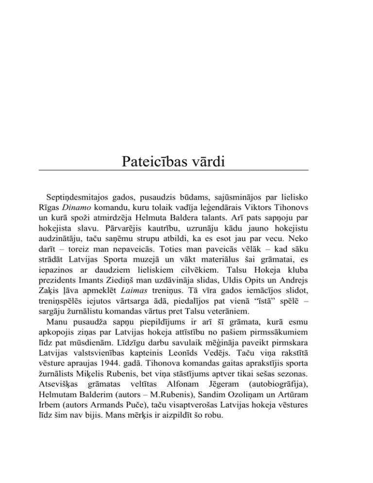 Pateicības vārdi Septiņdesmitajos gados, pusaudzis būdams, sajūsminājos par lielisko Rīgas Dinamo komandu, kuru tolaik vadīja leģendārais Viktors Tihonovs un kurā spoži atmirdzēja Helmuta Baldera talants. Arī pats sapņoju par hokejista slavu. Pārvarējis kautrību, uzrunāju kādu jauno hokejistu audzinātāju, taču saņēmu strupu atbildi, ka es esot jau par vecu. Neko darīt – toreiz man nepaveicās. Toties man paveicās vēlāk – kad sāku strādāt Latvijas Sporta muzejā un vākt materiālus šai grāmatai, es iepazinos ar daudziem lieliskiem cilvēkiem. Talsu Hokeja kluba prezidents Imants Ziediņš man uzdāvināja slidas, Uldis Opits un Andrejs Zaķis ļāva apmeklēt Laimas treniņus. Tā vīra gados iemācījos slidot, treniņspēlēs iejutos vārtsarga ādā, piedalījos pat vienā “īstā” spēlē – sargāju žurnālistu komandas vārtus pret Talsu veterāniem. Manu pusaudža sapņu piepildījums ir arī šī grāmata, kurā esmu apkopojis ziņas par Latvijas hokeja attīstību no pašiem pirmssākumiem līdz pat mūsdienām. Līdzīgu darbu savulaik mēģināja paveikt pirmskara Latvijas valstsvienības kapteinis Leonīds Vedējs. Taču viņa rakstītā vēsture apraujas 1944. gadā. Tihonova komandas gaitas aprakstījis sporta žurnālists Miķelis Rubenis, bet viņa stāstījums aptver tikai sešas sezonas. Atsevišķas grāmatas veltītas Alfonam Jēgeram (autobiogrāfija), Helmutam Balderim (autors – M.Rubenis), Sandim Ozoliņam un Artūram Irbem (autors Armands Puče), taču visaptverošas Latvijas hokeja vēstures līdz šim nav bijis. Mans mērķis ir aizpildīt šo robu. Pirms gadiem septiņiem, uzsākot darbu pie šīs grāmatas, mēģināju savākt visu iespējamo statistiku par Latvijas hokeju. Izrakos cauri neskaitāmiem avīžu kalniem, pētīju arhīvu materiālus, konsultējos ar statistiķiem un pašiem hokejistiem, līdz beidzot sapratu – lai apkopotu pilnīgu statistiku, ar manu mūžu nepietiks un diez vai tas vispār ir nepieciešams. Jau šobrīd pieejamās statistikas apjoms ir pieaudzis tiktāl, ka ar to vien varētu aizpildīt vairākus biezus sējumus. Un vai daudzi vēlētos lasīt tādu grāmatu? Protams, rūpīgam hokeja pētniekam skaitļi atklāj ļoti daudz interesanta, tomēr parasti līdzjutēju intereses nesniedzas tālāk par Latvijas izlases un tā dēvēto meistarkomandu spēlēm, savukārt vietējās sacensības, lai cik skumji tas nebūtu, nekad nav bijušas sevišķi populāras. Izņēmums varētu būt trīsdesmitie un sešdesmitie gadi. Tā mana sākotnējā iecere pamazām mainījās – statistikas īpatsvars grāmatā saruka, toties aizvien nozīmīgāku vietu ieņēma stāstījums par Latvijas hokejistu gaitām. Grāmata izveidota pēc sekojoša principa. Katrai sezonai veltīta atsevišķa nodaļa, kuru ievada svarīgāko notikumu izklāsts, savukārt nodaļas beigās sniegta svarīgākā statistika par aizvadīto sezonu. Uzreiz jābrīdina, ka šajos statistikas apskatos nav izdevies ievērot pilnīgu konsekvenci – daudzos gadījumos vienkārši trūkst nepieciešamās informācijas. Faktiski pastāv diezgan cieša sakarība starp pašu hokejistu un sporta žurnālistu attieksmi pret to vai citu notikumu un to, cik izsmeļoši tas atspoguļots šajā grāmatā. Grāmatas beigās sniegtas īsas biogrāfiskas ziņas par ievērojamākajiem cilvēkiem Latvijas hokejā. Šī nodaļa tapa visgrūtāk. Nebija viegli izlemt, kuri hokejisti pelnījuši, lai viņus iekļautu šādā sarakstā. Šo dilemmu centos atrisināt ar Latvijas Hokeja federācijas Veterānu komisijas palīdzību. Daudzas stundas pavadīju kopā ar hokeja vecmeistariem Elmāru Bauri, Gunāru Detlavu, Gunāru Krastiņu, Uldi Opitu, Edgaru Rozenbergu un Sergeju Zaharovu (paldies viņiem visiem par atsaucību un pacietību), dedzīgi diskutējot par viena vai otra hokejista ieguldījumu Latvijas hokeja vēsturē. Nodaļa “Ievērojamākās personības” ir mūsu kopīgā darba rezultāts. Visumā vairāk centāmies izcelt veterānu nopelnus, jo jaunajiem hokejistiem galu galā vēl ir laiks apliecināt sevi hokeja laukumā. Grāmatas tapšanā daudz palīdzēja arī citi – ar savām atmiņām, fotoattēliem, dažādām relikvijām (tagad tās glabājas Latvijas Sporta muzejā). Viņiem visiem esmu no sirds pateicīgs. Īpaši jāpiemin Aleksejs Auziņš, Helmuts Balderis, Alfons Jēgers, Valdis Līguts, Kārļa Muškes dēls Andris, Haralds Norītis, Edmunds Pivarūns, Pēteris Ramanis, Kārļa Roņa atraitne Imanta, Imants Spundiņš, Arnolds Stiba, Leonīds Vedējs, Rūdolfs Veide ar ģimeni, Andrejs Zaķis, Laimonis Zilpaušs. Liela pateicība pienākas arī Latvijas Sporta muzeja direktorei Inesei Baltvilkai, vēlāk – Dzintrai Grundmanei, kuras atbalstīja manu darbu. Daudz palīdzēja Starptautiskās Hokeja federācijas vēsturnieki Ernsts Martini un Toms Računas, sporta žurnālisti Vilnis Kozlovskis, Jānis Matulis, Māris Millers, Gints Narogs, Birgers Nordmarks (Zviedrija), Mārtiņš Pagodkins, Armands Puče, Mihals Trāvņičeks (Čehija), Māris Zembergs, statistiķis Aivars Bomis. Vislielākā atzinība pienākas hokeja vēsturniekam Jurim Baldunčikam, kurš jau pirms manis bija sācis vākt vēsturiskas liecības par hokeja attīstību Latvijā un labprāt nodeva savu pētījumu rezultātus man. J.Baldunčiks ir šajā grāmatā iekļauto nodaļu Terminoloģija un Hokeja pirmsākumi Latvijā autors. Īpaša pateicība firmām Hanza Kuģu aģentūra, Hanza Ekspedīcija un Liplat, kā arī personīgi Uģim Magonim un Kirovam Lipmanam par finansiālo atbalstu. Tomēr šo rindiņu autoram nācās uzklausīt arī citādu viedokli, proti – “hokeju esam nolaiduši līdz kliņķim, kāda vairs jēga rakstīt grāmatas?” (it kā rakstītāji būtu vainīgi sportisko rezultātu lejupslīdē). Daudzkārt nācies sastapties ar sacensību sekretariātu nevērīgo darbu. Vissāpīgākais jautājums bija sacensību protoko