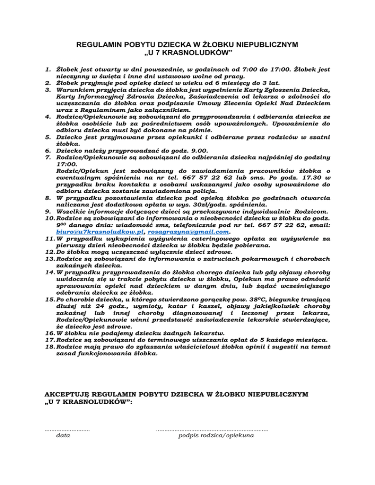 REGULAMIN POBYTU DZIECKA W ŻŁOBKU NIEPUBLICZNYM „U 7 KRASNOLUDKÓW” 1. Żłobek jest otwarty w dni powszednie, w godzinach od 7:00 do 17:00. Żłobek jest nieczynny w święta i inne dni ustawowo wolne od pracy. 2. Żłobek przyjmuje pod opiekę dzieci w wieku od 6 miesięcy do 3 lat. 3. Warunkiem przyjęcia dziecka do żłobka jest wypełnienie Karty Zgłoszenia Dziecka, Karty Informacyjnej Zdrowia Dziecka, Zaświadczenia od lekarza o zdolności do uczęszczania do żłobka oraz podpisanie Umowy Zlecenia Opieki Nad Dzieckiem wraz z Regulaminem jako załącznikiem. 4. Rodzice/Opiekunowie są zobowiązani do przyprowadzania i odbierania dziecka ze żłobka osobiście lub za pośrednictwem osób upoważnionych. Upoważnienie do odbioru dziecka musi być dokonane na piśmie. 5. Dziecko jest przyjmowane przez opiekunki i odbierane przez rodziców w szatni żłobka. 6. Dziecko należy przyprowadzać do godz. 9.00. 7. Rodzice/Opiekunowie są zobowiązani do odbierania dziecka najpóźniej do godziny 17:00. Rodzic/Opiekun jest zobowiązany do zawiadamiania pracowników żłobka o ewentualnym spóźnieniu na nr tel. 667 57 22 62 lub sms. Po godz. 17.30 w przypadku braku kontaktu z osobami wskazanymi jako osoby upoważnione do odbioru dziecka zostanie zawiadomiona policja. 8. W przypadku pozostawienia dziecka pod opieką żłobka po godzinach otwarcia naliczana jest dodatkowa opłata w wys. 30zł/godz. spóźnienia. 9. Wszelkie informacje dotyczące dzieci są przekazywane indywidualnie Rodzicom. 10. Rodzice są zobowiązani do informowania o nieobecności dziecka w żłobku do godz. 900 danego dnia: wiadomość sms, telefonicznie pod nr tel. 667 57 22 62, email: [email protected], [email protected]. 11. W przypadku wykupienia wyżywienia cateringowego opłata za wyżywienie za pierwszy dzień nieobecności dziecka w żłobku będzie pobierana. 12. Do żłobka mogą uczęszczać wyłącznie dzieci zdrowe. 13. Rodzice są zobowiązani do informowania o zatruciach pokarmowych i chorobach zakaźnych dziecka. 14. W przypadku przyprowadzenia do żłobka chorego dziecka lub gdy objawy choroby uwidocznią się w trakcie pobytu dziecka w żłobku, Opiekun ma prawo odmówić sprawowania opieki nad dzieckiem w danym dniu, lub żądać wcześniejszego odebrania dziecka ze żłobka. 15. Po chorobie dziecka, u którego stwierdzono gorączkę pow. 380C, biegunkę trwającą dłużej niż 24 godz., wymioty, katar i kaszel, objawy jakiejkolwiek choroby zakaźnej lub innej choroby diagnozowanej i leczonej przez lekarza, Rodzice/Opiekunowie winni przedstawić zaświadczenie lekarskie stwierdzające, że dziecko jest zdrowe. 16. W żłobku nie podajemy dziecku żadnych lekarstw. 17. Rodzice są zobowiązani do terminowego uiszczania opłat do 5 każdego miesiąca. 18. Rodzice mają prawo do zgłaszania właścicielowi żłobka opinii i sugestii na temat zasad funkcjonowania żłobka. AKCEPTUJĘ REGULAMIN POBYTU DZIECKA W ŻŁOBKU NIEPUBLICZNYM „U 7 KRASNOLUDKÓW”: ……………………… data ………………………………………………….……… podpis rodzica/opiekuna