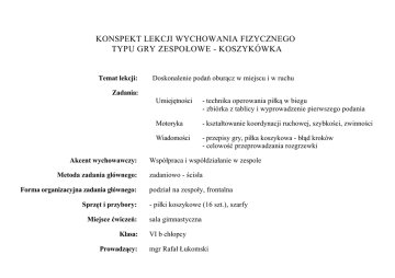 KONSPEKT LEKCJI WYCHOWANIA FIZYCZNEGO TYPU GRY ZESPOŁOWE - KOSZYKÓWKA Temat lekcji: Doskonalenie podań oburącz w miejscu i w ruchu Zadania: Akcent wychowawczy: Metoda zadania głównego: Forma organizacyjna zadania głównego: Sprzęt i przybory: Miejsce ćwiczeń: Klasa: Prowadzący: Umiejętności - technika operowania piłką w biegu - zbiórka z tablicy i wyprowadzenie pierwszego podania Motoryka - kształtowanie koordynacji ruchowej, szybkości, zwinności Wiadomości - przepisy gry, piłka koszykowa - błąd kroków - celowość przeprowadzania rozgrzewki Współpraca i współdziałanie w zespole zadaniowo - ścisła podział na zespoły, frontalna - piłki koszykowe (16 szt.), szarfy sala gimnastyczna VI b chłopcy mgr Rafał Łukomski Część lekcji Tok lekcji Zadania lekcji Środki dydaktyczne Metody Uwagi organizacyjno metodyczne 1 2 3 4 5 6 I 1. Zorganizowanie grupy 1. Zbiórka, powitanie 2. Sprawdzenie gotowości do zajęć 2. Motywacja do 1. Podanie tematu lekcji i sposobu jej organizacji uczestnictwa w zajęciach 2. Krótka informacja na temat celowości ćwiczeń rozgrzewających 3. Rozgrzewka psychomotoryczna 1. Zabawa "Berek kozłowany" 2. Zabawa "Berek czarodziej" 3. Toczenie piłki prawą i lewą ręką 4. Toczenie piłki prawą i lewą nogą 5. Toczenie piłki ósemką między nogami 6. W marszu przerzucanie piłki z ręki do ręki 7. W marszu przerzut piłki zza pleców przed siebie 8. W marszu przerzut piłki sprzed siebie - chwyt za plecami 9. Podania piłki w truchcie, jeden z ćwiczących porusza się przodem drugi tyłem 10. Ćwiczenia rozciągające (streching) w szeregu szarfy; piłki koszykowe; zabawowaklasyczna; zadaniowo ścisła; ćwiczący poruszają się tylko po liniach znajdujących się na boisku; ćwiczenia wykonywane indywidualnie wzdłuż sali jedna piłka na parę naśladowcza ścisła; luźna gromada 1 2 II 1. Kształtowanie umiejętności 2. Ćwiczenia taktyczne 3 4 5 6 1. Przypomnienie techniki wykonania podań oburącz sprzed klatki piersiowej, kozłem, znad głowy 2. Równoczesne podania dwoma piłkami, jeden z ćwiczących podaje oburącz górą, a drugi oburącz kozłem 3. Jeden z ćwiczących podrzuca piłkę w górę, w tym momencie otrzymuje podanie od partnera, oddaje piłkę, chwyta podrzuconą przez siebie piłkę 4. Pierwszy zaw. z rzędu A podaje do pierwszego zaw. z rzędu B i biegnie w kierunku zaw. D otrzymuje podanie, oddaje i biegnie na koniec rzędu B. Analogicznie postępuje rząd B 5. Podania piłki w biegu zakończone rzutem do kosza i zebraniem piłki z tablicy piłki koszykowe; zadaniowo ścisła; w parach naprzeciwko siebie jedna piłka na parę; piłki dla każdego; 1. Podania w dwójkach zakończone rzutem o tablice. Asystujący zbiera piłkę z tablicy i podaje do wybiegającego partnera. 2. 1A kozłuje piłkę do polowy boiska, podaje do 1B i ścina pod kosz, otrzymuje podanie od 1B i wykonuje rzut w biegu po dwutakcie. 1B zbiera piłkę i podaje do 2C. 1A idzie na koniec rzędu B, a 1B na koniec rzędu C. Równocześnie to samo wykonuje rząd C i D. 3. Gra uproszczona trzy piłki; piłka na parę; jedna piłka; dwie piłki; szarfy, piłka koszykowa, zabawowa klasyczna podział na dwa zespoły; 1 III 2 3 1. Uspokojenie organizmu 1. Marsz dookoła sali 2. Zwis tyłem dla drabinkach 2. Podsumowanie zajęć 1. Omówienie i podsumowanie lekcji 2. Ocena uczniów aktywnie uczestniczących w zajęciach 3. Pożegnanie 4 5 6 na obwodzie koła w szeregu;