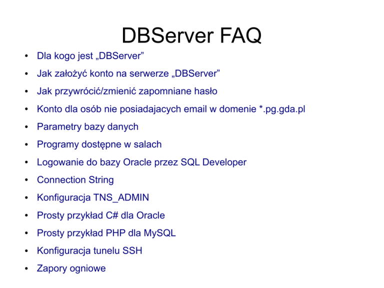 Destination: np. dbserver.mif.pg.gda.pl:1521 Nazwa serwera do którego chcemy się łączyć