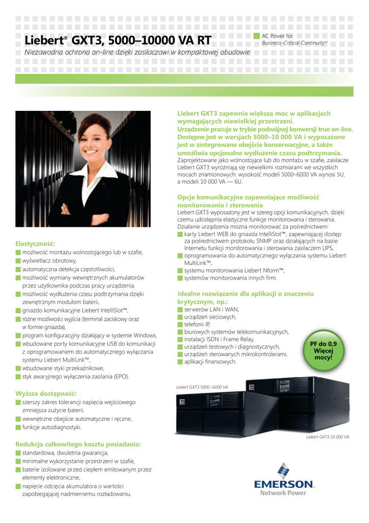Liebert® GXT3, 5000–10000 VA RT AC Power for Business-Critical ContinuityTM Niezawodna ochrona on-line dzięki zasilaczowi w kompaktowej obudowie Liebert GXT3 zapewnia większą moc w aplikacjach wymagających niewielkiej przestrzeni. Urządzenie pracuje w trybie podwójnej konwersji true on-line. Dostępne jest w wersjach 5000–10 000 VA i wyposażone jest w zintegrowane obejście konserwacyjne, a także umożliwia opcjonalne wydłużenie czasu podtrzymania. Zaprojektowane jako wolnostojące lub do montażu w szafie, zasilacze Liebert GXT3 wyróżniają się niewielkimi rozmiarami we wszystkich mocach znamionowych: wysokość modeli 5000–6000 VA wynosi 5U, a modeli 10 000 VA — 6U. Opcje komunikacyjne zapewniające możliwość monitorowania i sterowania Elastyczność: Q możliwość montażu wolnostojącego lub w szafie, Q wyświetlacz obrotowy, Q automatyczna detekcja częstotliwości, Q możliwość wymiany wewnętrznych akumulatorów przez użytkownika podczas pracy urządzenia, Q możliwość wydłużenia czasu podtrzymania dzięki zewnętrznym modułom baterii, Q gniazdo komunikacyjne Liebert IntelliSlot™, Q różne możliwości wyjścia (terminal zaciskowy oraz w formie gniazda), Q program konfiguracyjny działający w systemie Windows, Q wbudowane porty komunikacyjne USB do komunikacji z oprogramowaniem do automatycznego wyłączania systemu Liebert MultiLink™, Q wbudowane styki przekaźnikowe, Q styk awaryjnego wyłączenia zasilania (EPO). Wyższa dostępność: Liebert GXT3 wyposażony jest w szereg opcji komunikacyjnych, dzięki czemu udostępnia elastyczne funkcje monitorowania i sterowania. Działanie urządzenia można monitorować za pośrednictwem: Q karty Liebert WEB do gniazda IntelliSlot™, zapewniającej dostęp za pośrednictwem protokołu SNMP oraz działających na bazie Internetu funkcji monitorowania i sterowania zasilaczem UPS, Q oprogramowania do automatycznego wyłączania systemu Liebert MultiLink™, Q systemu monitorowania Liebert Nform™, Q systemów monitorowania innych firm. Idealne rozwiązanie dla aplikacji o znaczeniu krytycznym, np.: Q serwerów LAN i WAN, Q urządzeń sieciowych, Q telefonii IP, Q biurowych systemów telekomunikacyjnych, Q instalacji ISDN i Frame Relay, Q urządzeń testowych i diagnostycznych, Q urządzeń sterowanych mikrokontrolerami, Q aplikacji finansowych. PF do 0,9 Więcej mocy! Liebert GXT3 5000 i 6000 VA Q szerszy zakres tolerancji napięcia wejściowego zmniejsza zużycie baterii, Q wewnętrzne obejście automatyczne i ręczne, Q funkcje autodiagnostyki. Redukcja całkowitego kosztu posiadania: Q standardowa, dwuletnia gwarancja, Q minimalne wykorzystanie przestrzeni w szafie, Q baterie izolowane przed ciepłem emitowanym przez elementy elektroniczne, Q napięcie odcięcia akumulatora o wartości zapobiegającej nadmiernemu rozładowaniu. Liebert GXT3 10 000 VA Liebert® GXT3, 5000–10000 VA RT Specyfikacja Numer modelu Moc znamionowa GXT3-5000RT230 5000 VA/4000 W Wymiary, szer. x gł. x wys. (mm) GXT3-6000RT230 6000 VA/4800 W GXT3-10000RT230 10000 VA/9000 W Jednostka/w opakowaniu 430 x 574 x 217 / 530 x 745 x 516 430 x 581 x 261 / 530 x 745 x 563 Jednostka/w opakowaniu 60 / 71 70 / 92 Waga (kg) Parametry wejściowe Napięcie znamionowe Zakres częstotliwości 220/230/240 V AC (możliwość wyboru przy użyciu dołączonego programu konfiguracyjnego) 40–70 Hz Podłączenie stałe w standardowej Podłączenie stałe w standardowej skrzynce dystrybucyjnej skrzynce dystrybucyjnej PD2-CE10HDWRDMBS PD2-CE10HDWRDMBS 4 x IEC C13 + 4 x IEC C19 + 6 x IEC C13 + 2 x IEC C19 + podłączenie stałe podłączenie stałe w standardowej w standardowej skrzynce dystrybucyjnej skrzynce dystrybucyjnej PD2-CE10HDWRDMBS PD2-CE10HDWRDMBS Podłączenie wejścia Gniazda wyjściowe Zakres napięcia bez rozładowania baterii Kształt napięcia wyjściowego 176–280 V AC Sinusoida Parametry baterii Typ Ilość x napięcie x pojemność Czas ładowania Kwasowo-ołowiowe z regulowanymi zaworami, bezobsługowe 20 x 12 V x 5 Ah 20 x 12 V x 9 Ah 3 godz. do 90% pojemności po pełnym rozładowaniu przy 100% obciążeniu Warunki środowiskowe Temperatura pracy Od 0ºC do +40ºC Temperatura przechowywania Od -15ºC do +50ºC Wilgotność względna Od 0% do 95%, bez kondensacji Wysokość, na jakiej może pracować urządzenie Do 1000 m w temperaturze 30ºC Poziom hałasu <55 dBA w odległości 1 metra od tylnej części urządzenia <50 dBA w odległości 1 metra od przodu i boków urządzenia Normy i certyfikaty Bezpieczeństwo EMI/EMC/C-Tick EMC Odporność na wyładowania elektrostatyczne Odporność na zakłócenia radiowe Odporność na szybkozmienne stany przejściowe Odporność na udary Transport Zgodność z dyrektywami IEC 62040-1:2008 IEC/EN/AS 62040-2 Edycja 2 (kat. 2, tabela 6) EN 61000-4-2, poziom 4, kryterium A EN 61000-4-3, poziom 3, kryterium A EN 61000-4-4, poziom 4, kryterium A EN 61000-4-5, poziom 3, kryterium A Procedura ISTA 1A CE, RoHS GXT3-240VBATTCE GXT3-5000RT230 GXT3-6000RT230 GXT3-240RTVBATT Jednostka/w opakowaniu 430 X 574 X 130 / 530 X 745 X 407 430 X 581 X 173 / 530 X 745 X 475 Jednostka/w opakowaniu 43 / 54 65 / 76 Typ Ilość łańcuchów x ilość bloków x napięcie Kwasowo-ołowiowe z regulowanymi zaworami, bezobsługowe 1 x 20 x 12 V Dla zasilacza UPS Wymiary, szer. x gł. x wys. (mm) Waga (kg) Parametry baterii Warunki środowiskowe Temperatura pracy/przechowywania Wilgotność względna Wysokość, na jakiej może pracować urządzenie GXT3-10000RT230 Do 1000 m w temperaturze 40ºC Bezpieczeństwo/poziom emisji Transport [email protected] Via Fornace, 30 40023 Castel Guelfo (BO) Włochy Tel.: +39 0542 632 111 Fax: +39 0542 632 120 [email protected] USA 1050 Dearborn Drive P.O. Box 29186 Columbus, OH 43229 Tel.: +1 614 8880246 Polska Ul. Szturmowa 2A 02-678 Warszawa Tel.: +48 22 458 92 60 Fax: +48 22 458 92 61 [email protected] Dokładamy wszelkich starań, aby informacje zawarte w niniejszym dokumenc
