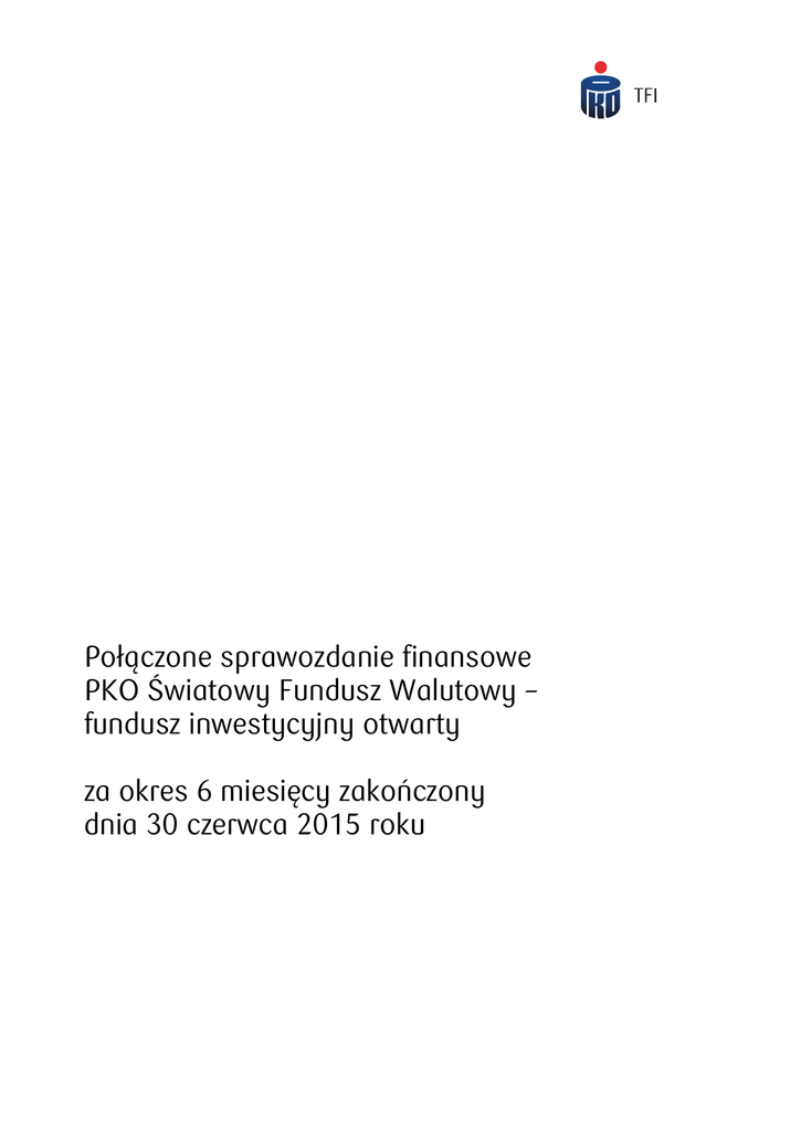 Połączone sprawozdanie finansowe PKO Światowy Fundusz Walutowy – fundusz inwestycyjny otwarty za okres 6 miesięcy zakończony dnia 30 czerwca 2015 roku LIST DO UCZESTNIKÓW Szanowni Państwo, Przedstawiamy Państwu Sprawozdanie finansowe funduszy inwestycyjnych otwartych zarządzanych przez PKO Towarzystwo Funduszy Inwestycyjnych SA za okres sprawozdawczy od 1 stycznia do 30 czerwca 2015 r. Sprawozdanie zawiera szczegółowe informacje o strukturze portfela inwestycyjnego oraz opis polityki inwestycyjnej poszczególnych subfunduszy. Do sprawozdania finansowego dołączono raport z przeglądu sprawozdania finansowego przeprowadzonego przez biegłego rewidenta oraz oświadczenie banku depozytariusza. Wartość aktywów netto funduszy zarządzanych przez PKO TFI wynosiła na koniec czerwca 2015 roku 18,55 mld zł, co oznacza wzrost aktywów o 9,42% w stosunku do stanu na koniec grudnia 2014 roku. Wzrost ten związany był przede wszystkim z wynikami z tytułu zarządzania aktywami oraz z wysokim dodatnim saldem sprzedaży netto. Udział PKO TFI w rynku funduszy inwestycyjnych na koniec czerwca 2015 roku wyniósł 8,1%, co uplasowało Towarzystwo na 3 miejscu pod względem wielkości zarządzanych aktywów netto. W grupie funduszy detalicznych PKO TFI utrzymało 1 pozycję z udziałem 14,02%. Według stanu na 30 czerwca 2015 roku PKO TFI SA zarządzało 48 funduszami i subfunduszami inwestycyjnymi. W pierwszym półroczu Towarzystwo wprowadziło do oferty następujące produkty inwestycyjne: - „PKO Akcjomat” - Wyspecjalizowany Program Inwestycyjny dystrybuowany w sieci placówek PKO Banku Polskiego S.A od 1 kwietnia 2015 r. - Subfundusz PKO Akcji Rynku Europejskiego, wydzielony w ramach PKO Parasolowy – funduszu inwestycyjnego otwartego. W dystrybucji w sieci placówek PKO Banku Polskiego S.A.; DM PKO BP S.A.; PKO BP Finat, DM BOŚ S.A., Bank Pocztowy S.A.; RDM Wealth Management S.A. od 1 czerwca 2015 r. 26 czerwca 2015 r. nastąpiło również połączenie wybranych subfunduszy wydzielonych w ramach PKO Parasolowy – - subfunduszu PKO Zrównoważony z subfunduszem PKO Zrównoważony Plus, - subfunduszu PKO Stabilnego Wzrostu z subfunduszem PKO Stabilnego Wzrostu Plus, - subfunduszu PKO Akcji Małych i Średnich Spółek z subfunduszem PKO Akcji Małych i Średnich Spółek Plus. Rynek Obligacji: Pierwsze półrocze 2015 roku było okresem słabszego zachowania subfunduszy dłużnych. Powodem takiej sytuacji był wzrost rentowności polskich obligacji skarbowych. Wraz z poprawą perspektyw makroekonomicznych na świecie nastąpił wzrost rentowności amerykańskich i niemieckich obligacji skarbowych, co również przełożyło się na wycenę polskich papierów dłużnych. Dodatkowym czynnikiem wpływającym na zmienność wycen obligacji w pierwszym półroczu było zamieszanie wokół sytuacji w Grecji i dyskusje nad dalszymi losami tego kraju w strukturach strefy euro. W pierwszym kwartale 2015 r. byliśmy świadkami kontynuacji trendu spadkowego na rentownościach obligacji w strefie euro, którego powodem były zapowiedzi Prezesa EBC, dotyczące uruchomienia programu luzowania ilościowego, a następnie faktyczne uruchomienie programu w marcu br. Na koniec marca rentowności 10-letnich niemieckich obligacji skarbowych kształtowały się na poziomie 0,18%. Duży wpływ na zachowanie obligacji w pierwszych trzech miesiącach tego roku miała również zmiana tonu wypowiedzi przedstawicieli Rezerwy Federalnej USA na temat zapowiadanej normalizacji polityki pieniężnej czyli podwyżek stóp procentowych. Powodem przesunięcia terminu pierwszej podwyżki stóp procentowych, z czerwca na wrzesień, były sygnały spowolnienia wzrostu gospodarczego w USA, spowodowane m.in. efektami szybkiego umocnienia się dolara. Otoczenie rynkowe w pierwszym kwartale było dodatkowo komplikowane dużą zmiennością na rynku walutowym. Od początku roku do połowy marca obserwowaliśmy silne umocnienie dolara amerykańskiego w stosunku do wszystkich walut (w stosunku do euro dolar umocnił się o prawie 14%), a następnie byliśmy świadkami ponad 5% korekty tego ruchu. Drugi kwartał 2015 roku przyniósł istotny wzrost rentowności na rynku polskich obligacji skarbowych. Jednym z głównych czynników wzrostu rentowności była przecena obligacji na rynkach bazowych (amerykańskim i niemieckim). Taka sytuacja była spowodowana realizacją zysków przez posiadaczy obligacji skupowanych przez EBC w programie luzowania ilościowego oraz oczekiwaniami co do poprawy sytuacji ekonomicznej w USA w drugim kwartale. Wzrost rentowności na głównych rynkach obligacji (USA i Niemiec) miał również wpływ na rynek obligacji krajów peryferii Europy i obligacji korporacyjnych, gdzie odnotowaliśmy wzrost premii za ryzyko kredytowe. Dodatkowym czynnikiem, który miał istotny wpływ na wzrost awersji do ryzyka w drugim kwartale była potencjalna niewypłacalność Grecji. W bieżącym otoczeniu rynkowym, w którym mamy niskie stopy procentowe (w Polsce 1,5%, najniżej w historii) i niskie oprocentowania depozytów, potencjał stóp zwrotu funduszy dłużnych jest niższy od obserwowanego w przeszłości. Subfundusze PKO TFI są aktywnie zarządzane, a struktura portfeli jest odpowiednio dostosowywana do zmieniających się warunków rynkowych. Ze względu na fakt, iż większość instrumentów w portfelach subfunduszy zarządzanych przez PKO TFI jest płynna i jest wyceniana rynkowo, jakiekolwiek zmiany w wycenach poszczególnych papierów są bezpośrednio odzwierciedlone w wycenach jednostek. Rynek Akcji: Pierwsze półrocze było okresem udanym dla większości rynków akcji. Choć po pierwszym, wyjątkowo dobrym kwartale tego roku, w drugim nastąpiła korekta, to zdecydowana większość funduszy akcyjnych PKO TFI zakończyła pierwsze sześć miesięcy z dodatnią stopą zwrotu. Szeroki indeks rynków rozwiniętych MSCI World (USD), zyskał w pierwszym półroczu +2,6%. Najlepszym wśród rynk