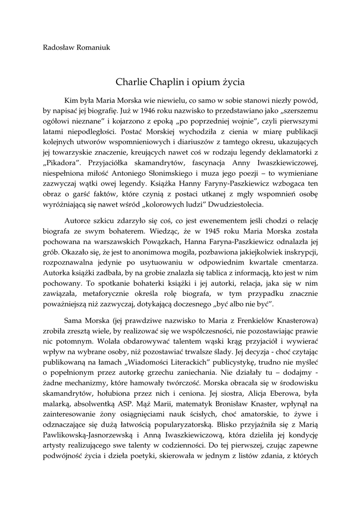 Radosław Romaniuk Charlie Chaplin i opium życia Kim była Maria Morska wie niewielu, co samo w sobie stanowi niezły powód, by napisać jej biografię. Już w 1946 roku nazwisko to przedstawiano jako „szerszemu ogółowi nieznane” i kojarzono z epoką „po poprzedniej wojnie”, czyli pierwszymi latami niepodległości. Postać Morskiej wychodziła z cienia w miarę publikacji kolejnych utworów wspomnieniowych i diariuszów z tamtego okresu, ukazujących jej towarzyskie znaczenie, kreujących nawet coś w rodzaju legendy deklamatorki z „Pikadora”. Przyjaciółka skamandrytów, fascynacja Anny Iwaszkiewiczowej, niespełniona miłość Antoniego Słonimskiego i muza jego poezji – to wymieniane zazwyczaj wątki owej legendy. Książka Hanny Faryny-Paszkiewicz wzbogaca ten obraz o garść faktów, które czynią z postaci utkanej z mgły wspomnień osobę wyróżniającą się nawet wśród „kolorowych ludzi” Dwudziestolecia. Autorce szkicu zdarzyło się coś, co jest ewenementem jeśli chodzi o relację biografa ze swym bohaterem. Wiedząc, że w 1945 roku Maria Morska została pochowana na warszawskich Powązkach, Hanna Faryna-Paszkiewicz odnalazła jej grób. Okazało się, że jest to anonimowa mogiła, pozbawiona jakiejkolwiek inskrypcji, rozpoznawalna jedynie po usytuowaniu w odpowiednim kwartale cmentarza. Autorka książki zadbała, by na grobie znalazła się tablica z informacją, kto jest w nim pochowany. To spotkanie bohaterki książki i jej autorki, relacja, jaka się w nim zawiązała, metaforycznie określa rolę biografa, w tym przypadku znacznie poważniejszą niż zazwyczaj, dotykającą doczesnego „być albo nie być”. Sama Morska (jej prawdziwe nazwisko to Maria z Frenkielów Knasterowa) zrobiła zresztą wiele, by realizować się we współczesności, nie pozostawiając prawie nic potomnym. Wolała obdarowywać talentem wąski krąg przyjaciół i wywierać wpływ na wybrane osoby, niż pozostawiać trwalsze ślady. Jej decyzja - choć czytając publikowaną na łamach „Wiadomości Literackich” publicystykę, trudno nie myśleć o popełnionym przez autorkę grzechu zaniechania. Nie działały tu – dodajmy żadne mechanizmy, które hamowały twórczość. Morska obracała się w środowisku skamandrytów, hołubiona przez nich i ceniona. Jej siostra, Alicja Eberowa, była malarką, absolwentką ASP. Mąż Marii, matematyk Bronisław Knaster, wpłynął na zainteresowanie żony osiągnięciami nauk ścisłych, choć amatorskie, to żywe i odznaczające się dużą łatwością popularyzatorską. Blisko przyjaźniła się z Marią Pawlikowską-Jasnorzewską i Anną Iwaszkiewiczową, która dzieliła jej kondycję artysty realizującego swe talenty w codzienności. Do tej pierwszej, czując zapewne podwójność życia i dzieła poetyki, skierowała w jednym z listów zdania, z których zaczerpnięto formułę tytułową omawianej książki: „Nie żałuj snów. Pal opium życia”. Wypowiedź w poetyce Jasnorzewskiej, nie namawiająca jednak artystki do pisania – wręcz przeciwnie, do „śnienia życia”, życia poezją i w poezji, jakie (domyślamy się) skutecznie uprawiała przyjaciółka poetki. Wykształcona w angielskim Broadstairs Morska uczyła przyjaciółskamandrytów języka angielskiego i wpłynęła na legendarną anglomanię Słonimskiego. Teatralna i wykreowana w codziennym życiu, nie zagrzała miejsca w żadnym z zawodowych aktorskich zespołów. Ten rodzaj jej aktywności zapisał się jedynie dzięki wierszom deklamowanym w pierwszej w wyzwolonej Warszawie kawiarni poetów „Pod Pikadorem”. Uważna obserwatorka i krytyk wydarzeń kulturalnych, która – jak mówi legenda – godzinami omawiała je z Antonim Słonimskim, co znajdowało potem swój wyraz w słynnych Kronikach tygodniowych pisarza, za własną publicystyczną twórczość wzięła się późno. W latach 1933-39 opublikowała około trzydziestu artykułów publicystycznych i reportaży, opatrzonych męskim pseudonimem Mariusz Dawn. Przedrukowane w aneksie biografii, zaskakują intelektem, humorem, żywym językiem. Morska miała wszystkie zalety pisarki: oryginalność, talent, uwagę i pasję. Nie miała wad, które pozwoliłyby jej stać się artystką: egoizmu, elementu rywalizacji, pragnienia akceptacji i poklasku czytającej publiczności. Spełniła się w twórczości per procura, ofiarowując inspirację i przyjaźń Słonimskiemu, Pawlikowskiej-Jasnorzewskiej, stając się bohaterką niezwykle emocjonalnych stronic Dzienników Anny Iwaszkiewiczowej. W końcu okupacyjny epizod jej życia dostarczył fabuły jednemu z opowiadań Ireny Krzywickiej. W ten sposób postać i los Morskiej znowu pojawiły się jako inspiracja wykorzystana przez twórcę. Po raz ostatni, aż do omawianej biografii. Książka Faryny-Paszkiewicz dość nieoczekiwanie prezentuje Morską jako postać tragiczną. O ile skomplikowane życie osobiste oraz relacje miłosne nie dawały jej chyba poczucia rozdarcia, o tyle odczuwała katastroficzny niemal niepokój związany z losem, jaki gotuje historia, porównywalny z lękiem przypisywanym Witkacemu. Nawet fascynacja Morskiej radiem sprowadza się do uczynienia z odbiornika radiowego narzędzia męki – „radioamatorka” łowi propagandę wschodnich i zachodnich rozgłośni, nie ma w jej stosunku do ebonitowego pudełka nic z rozrywki. I właśnie niepokój każe jej przerwać milczenie. Pierwszy felieton, opublikowany w 1933 roku, poświęcony jest paleniu książek w hitlerowskich Niemczech. W jej tekstach obsesyjnie pojawia się motyw wykorzenienia i ucieczki oraz obojętności europejskich społeczeństw na los krzywdzonych. Sama autorka brała prawdopodobnie udział w jednej z wypraw żydowskich przesiedleńców do Ameryki Południowej. Przygotowywała dla siebie zawczasu miejsce wśród outsiderów kończącej się epoki. „Sądzę, że warto popracować nad sobą – pisała – by nie zadomowić się zbytnio w sw