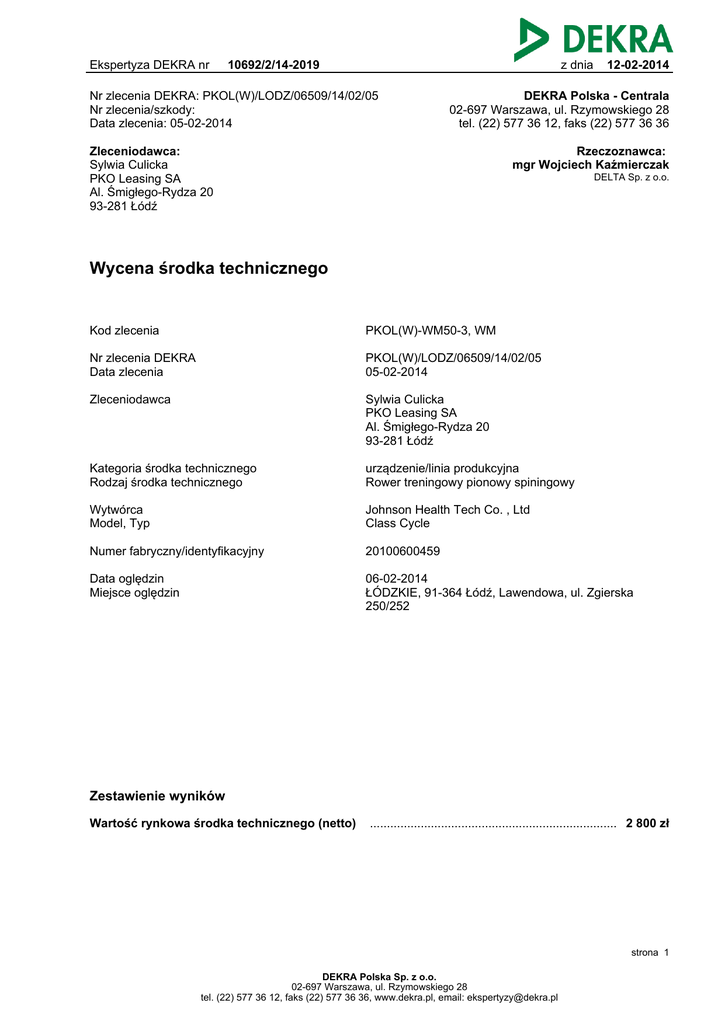 Ekspertyza DEKRA nr 10692/2/14-2019 z dnia Nr zlecenia DEKRA: PKOL(W)/LODZ/06509/14/02/05 Nr zlecenia/szkody: Data zlecenia: 05-02-2014 12-02-2014 DEKRA Polska - Centrala 02-697 Warszawa, ul. Rzymowskiego 28 tel. (22) 577 36 12, faks (22) 577 36 36 Zleceniodawca: Sylwia Culicka PKO Leasing SA Al. Śmigłego-Rydza 20 93-281 Łódź Rzeczoznawca: mgr Wojciech Kaźmierczak DELTA Sp. z o.o. Wycena środka technicznego Kod zlecenia PKOL(W)-WM50-3, WM Nr zlecenia DEKRA Data zlecenia PKOL(W)/LODZ/06509/14/02/05 05-02-2014 Zleceniodawca Sylwia Culicka PKO Leasing SA Al. Śmigłego-Rydza 20 93-281 Łódź Kategoria środka technicznego Rodzaj środka technicznego urządzenie/linia produkcyjna Rower treningowy pionowy spiningowy Wytwórca Model, Typ Johnson Health Tech Co. , Ltd Class Cycle Numer fabryczny/identyfikacyjny 20100600459 Data oględzin Miejsce oględzin 06-02-2014 ŁÓDZKIE, 91-364 Łódź, Lawendowa, ul. Zgierska 250/252 Zestawienie wyników Wartość rynkowa środka technicznego (netto) ......................................................................... 2 800 zł strona 1 DEKRA Polska Sp. z o.o. 02-697 Warszawa, ul. Rzymowskiego 28 tel. (22) 577 36 12, faks (22) 577 36 36, www.dekra.pl, email: [email protected] Ekspertyza DEKRA nr 10692/2/14-2019 z dnia 12-02-2014 Dane środka technicznego Dane ogólne Kategoria środka technicznego Rodzaj środka technicznego urządzenie/linia produkcyjna Rower treningowy pionowy spiningowy Wytwórca Model, Typ Johnson Health Tech Co. , Ltd Class Cycle Numer fabryczny/identyfikacyjny 20100600459 Rok produkcji 2010 Parametry techniczne Max waga użytkowania 159 kg Wyposażenie - stabilna konstrukcja, - wygodne siedzisko z regulacją wysokości, odległości, - kierownica regulowana, wysokość, kąt nachylenia, - pedały antypoślizgowe z paskami stabilizującymi, - system oporu (mechaniczny). Opis działania, przeznaczenie środka technicznego Rower treningowy jest urządzeniem fitness przeznaczony jest do treningu mięśni nóg w klubach sportowych, w klubach fitness. Wykorzystywany również może być do treningu domowego. Stan techniczny obiektu W dniu oględzin rower kompletny. Sprawdzono działanie, praca bez uwag. Ślady użytkowania. Podstawa metodologiczna wyceny Aby spełnić zadanie wyceny określone potrzebą zleceniodawcy oszacowana zostanie wartość rynkowa środka technicznego, zdefiniowana w następujący sposób. Wartość rynkowa - jest to racjonalnie określona ilość pieniędzy, którą kupujący będzie skłonny zaoferować chętnemu sprzedającemu w zamian za przedmiot transakcji, przy założeniu równości stron, bez istnienia żadnego przymusu wpływającego na decyzję o zakupie i sprzedaży, przy pełnej znajomości przedmiotu i okoliczności transakcji oraz przy zachowaniu odpowiednio długiego czasu wyeksponowania przedmiotu sprzedaży na wolnym rynku. strona 2 DEKRA Polska Sp. z o.o. 02-697 Warszawa, ul. Rzymowskiego 28 tel. (22) 577 36 12, faks (22) 577 36 36, www.dekra.pl, email: [email protected] Ekspertyza DEKRA nr 10692/2/14-2019 z dnia 12-02-2014 Powyższa wartość uwzględnia m.in. wytwórcę, rodzaj i zastosowanie maszyny, jej konstrukcję, kompletność, stan techniczny, wiek środka technicznego, okres i sposób eksploatacji, pozostały do dyspozycji przewidywany okres i sposób eksploatacji. Podstawą działań w wyżej wymienionym celu jest: - szczegółowa identyfikacja przedmiotu wyceny, - ustalenia dotyczące kompletności i sprawności technicznej, - ustalenia dotyczące eksploatacji (warunki, czas), - ustalenia dotyczące rynku pierwotnego Informacje o rynku i cenach Na rynku brak jest ofert maszyn/urządzeń o zbliżonych parametrach Na rynku wtórnym nie znaleziono oferty sprzedaży używanych rowerów tego typu. Z informacji uzyskanej od przedstawiciela handlowego firmy Johnson Health Tech, Poland Sp. z o. o. wyceniany model nie jest już produkowany. W wycenie przyjęto wartość bazową roweru nowszego typu. Koszt zastąpienia środkiem technicznym nowym Cena środka technicznego nowego Cena bazowa środka technicznego oferowanego jako nowy (netto) .............................................. 6 499 zł Ubytek wartości środka technicznego nowego z przyczyn fizycznych Uwagi ogólne Ubytek wartości z przyczyn fizycznych wynika z efektywnego czasu eksploatacji urządzenia w relacji do średniej jego żywotności. Ma on związek z fizycznym zużyciem oraz starzeniem się elemetów środka technicznego. Ubytek wartości Szacowana średnia żywotność urządzeń przedmiotowego typu ........................................................ 10 lat Okres eksploatacji urządzenia ............................................................................................................ 4 lata Ubytek wartości z przyczyn fizycznych 4/10 * 100% = 40% Ubytek wartości środka technicznego nowego z przyczyn funkcjonalnych Uwagi ogólne Ubytek wartości z przyczyn funkcjonalnych odnosi się do poziomu nowoczesności środka technicznego, strona 3 DEKRA Polska Sp. z o.o. 02-697 Warszawa, ul. Rzymowskiego 28 tel. (22) 577 36 12, faks (22) 577 36 36, www.dekra.pl, email: [email protected] Ekspertyza DEKRA nr 10692/2/14-2019 z dnia 12-02-2014 tzn. m.in. wynika z różnicy rozwiązań konstrukcyjnych wynikających z postępu technicznego w produkcji urządzeń takich jak wyceniany obiekt. Rower tego typu nie jest już produkowany. Ubytek wartości Ubytek wartości przedmiotowego środka technicznego z przyczyn funkcjonalnych określa się na 10% Ubytek wartości środka technicznego nowego z przyczyn ekonomicznych Uwagi ogólne Ubytek wartości z przyczyn ekonomicznych odnosie się do otoczenia rynkowego w segmencie danego rodzaju środków technicznych, tzn. wynika z konkurencyjności urządzeń danego typu innych producentów. Ubytek wartości Ubytek wartości przedmiotowego środka technicznego z przyczyn ekonomicznych określa się na 20% Wartość rynkowa środka technicznego Wartość przedmiotowe