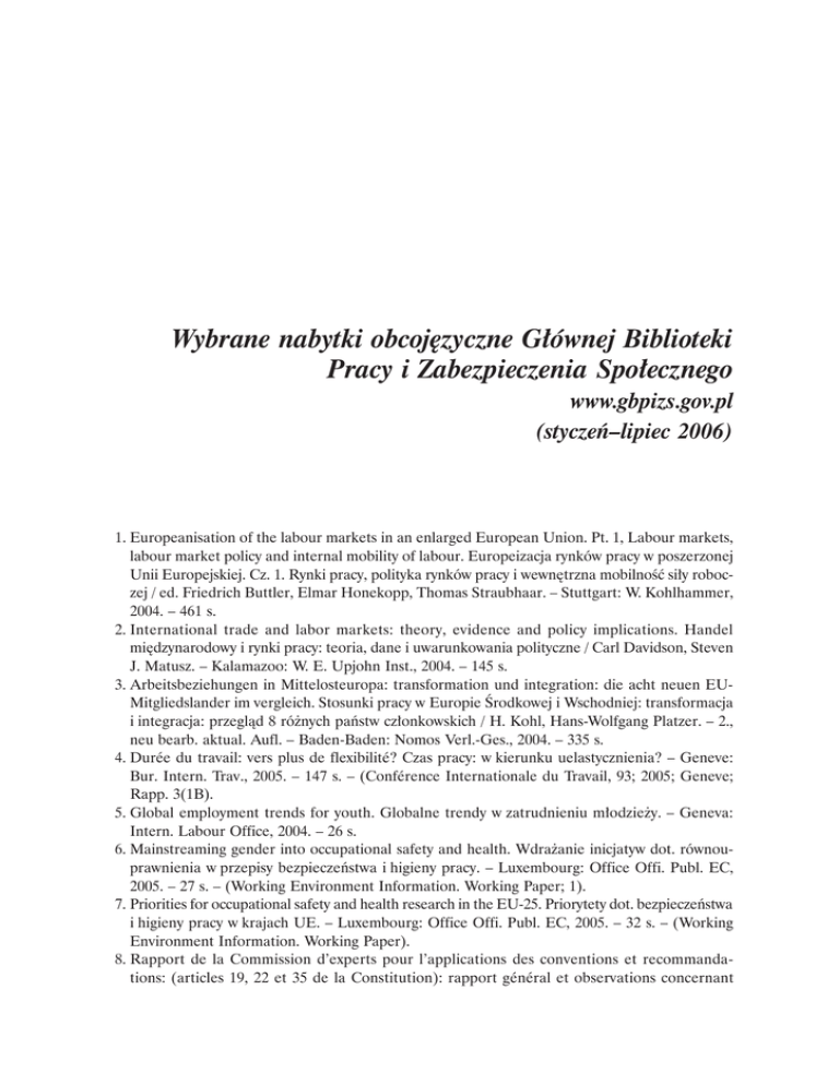 Wybrane nabytki obcojęzyczne Głównej Biblioteki Pracy i Zabezpieczenia Społecznego www.gbpizs.gov.pl (styczeń–lipiec 2006) 1. Europeanisation of the labour markets in an enlarged European Union. Pt. 1, Labour markets, labour market policy and internal mobility of labour. Europeizacja rynków pracy w poszerzonej Unii Europejskiej. Cz. 1. Rynki pracy, polityka rynków pracy i wewnętrzna mobilność siły roboczej / ed. Friedrich Buttler, Elmar Honekopp, Thomas Straubhaar. – Stuttgart: W. Kohlhammer, 2004. – 461 s. 2. International trade and labor markets: theory, evidence and policy implications. Handel międzynarodowy i rynki pracy: teoria, dane i uwarunkowania polityczne / Carl Davidson, Steven J. Matusz. – Kalamazoo: W. E. Upjohn Inst., 2004. – 145 s. 3. Arbeitsbeziehungen in Mittelosteuropa: transformation und integration: die acht neuen EUMitgliedslander im vergleich. Stosunki pracy w Europie Środkowej i Wschodniej: transformacja i integracja: przegląd 8 różnych państw członkowskich / H. Kohl, Hans-Wolfgang Platzer. – 2., neu bearb. aktual. Aufl. – Baden-Baden: Nomos Verl.-Ges., 2004. – 335 s. 4. Durée du travail: vers plus de flexibilité? Czas pracy: w kierunku uelastycznienia? – Geneve: Bur. Intern. Trav., 2005. – 147 s. – (Conférence Internationale du Travail, 93; 2005; Geneve; Rapp. 3(1B). 5. Global employment trends for youth. Globalne trendy w zatrudnieniu młodzieży. – Geneva: Intern. Labour Office, 2004. – 26 s. 6. Mainstreaming gender into occupational safety and health. Wdrażanie inicjatyw dot. równouprawnienia w przepisy bezpieczeństwa i higieny pracy. – Luxembourg: Office Offi. Publ. EC, 2005. – 27 s. – (Working Environment Information. Working Paper; 1). 7. Priorities for occupational safety and health research in the EU-25. Priorytety dot. bezpieczeństwa i higieny pracy w krajach UE. – Luxembourg: Office Offi. Publ. EC, 2005. – 32 s. – (Working Environment Information. Working Paper). 8. Rapport de la Commission d’experts pour l’applications des conventions et recommandations: (articles 19, 22 et 35 de la Constitution): rapport général et observations concernant Wybrane nabytki obcojęzyczne Głównej Biblioteki Pracy i Zabezpieczenia Społecznego 231 certains pays. Raport komisji ekspertów dot. wdrażania konwencji i zaleceń MOP. – Geneve: Bur. Intern. Trav., 2005. – 577 s. – (Conférence Internationale du Travail, 93; 2005; Geneve; Rapp. 3(1A)). 9. Action against HIV/AIDS in Africa: an initiative in the context of the world of work. Działania przeciw HIV/AIDS w Afryce: inicjatywa w kontekście świata pracy. – Geneva: Intern. Labour Office, 2000. – 89 s. 10. Aussenhandel und Arbeitslosigkeit. Handel zagraniczny i bezrobocie / A. Brenken. – Frankfurt am Main, 2003. – 182 s. – (Europäische Hochschulschriften. R. 5. Volks- und Betriebswirtschaft). 11. The changing face of european labour law and social policy. Zmiany w europejskim prawie pracy i polityce społecznej / ed. A. C. Neal. – The Hague: Kluwer Law Intern., 2004. – 169 s. – (Studies in Employment and Social Policy; 28). 12. Collective bargaining, discrimination, social security and European integration: papers nad proceedings of the VIIth European Regional Congress of the International Society for Labour Law and Social Security Law, Stockholm 2002. Rokowania zbiorowe, dyskryminacja, zabezpieczenie społeczne a integracja europejska: materiały VII Europejskiego Kongresu Towarzystwa Prawa Pracy i Zabezpieczenia Społecznego / ed. R. Blanpain. – The Hague: Kluwer Law Intern., 2003. – 484 s. – (Bulletin of Comparative Labour Relations ; 48). 13. Corporate social responsibility and safety and health at work. Społeczna odpowiedzialność biznesu oraz bezpieczeństwo i zdrowie w pracy. – Luxembourg: Office Offi. Publ. EC, 2004. – 125 s. 14. Decent work in Asia: ILO activities in the region: report of the Director-General ; annex: list of ILO activities in the Asian Region 1997–2000. Przyzwoita praca w Azji: regionalne działania MOP: raport dyrektora generalnego ; aneks: lista działań MOP w Azji 1997–2000. – Geneva: Intern. Labour Office, 2001. – 99 s. – (Asian Regional Meeting; 13; 2001; Bangkok). 15. Drug and alcohol testing in the workplace: report of the Interregional Tripartite Experts Meeting Held from 10 to 14 May 1993 in Oslo (Honefoss), Norway. Badanie na obecność narkotyków i alkoholu na stanowisku pracy: raport z Trójstronnego Międzynarodowego Spotkania Ekspertów 10–14 maja 1993 r. w Oslo (Honefoss), Norwegia. – Geneva: Intern. Labour Office, 1994. – 140 s. 16. Handbook of U.S. labor statistics, employment, earnings, prices, productivity and other labor data. Podręcznik statystyki pracy, zatrudnienia, płac, cen, wydajności i innych danych dotyczących pracy w USA / ed. E.E. Jacobs, M.M. Ryan. – 8 ed. – Lanham: Bernan Press, 2005. – 484 s. 17. Handbook on employee involvement in Europe. Podręcznik nt. zaangażowania pracowników w Europie / M. Weiss, M. Seweryński. – The Hague: Kluwer Law Intern., 2005. – 752 s. 18. The International Labour Organization and the promotion of full, productive and freely chosen employment: International Consultation concerning Follow-up to the World Summit for Social Development (1999; Geneva). Międzynarodowa Organizacja Pracy a promowanie pełnego, wydajnego i dostępnego zatrudnienia: Międzynarodowe Konsultacje dot. kontynuacji Światowego Szczytu w sprawie Rozwoju Społecznego. – Geneva: Intern. Labour Office, 1999. – 63 s. 19. Investing in every child: an economic study of the costs and benefits of eliminating child labour. Inwestowanie w każde dziecko: studium ekonomiczne kosztów i korzyści eliminowania pracy dzieci. – Geneva: Intern. Labour Office, 2004. – 133 s. 20. La liberté syndicale: recueil de décisions et de principes du Comité de la liberté syndicale du Conseil d’administration du BIT. Wolność związkowa: z