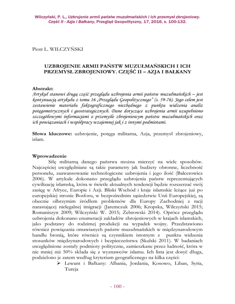 Wilczyński, P. L., Uzbrojenie armii państw muzułmańskich i ich przemysł zbrojeniowy. Część II - Azja i Bałkany, Przegląd Geopolityczny, 17, 2016, s. 100-132. Piotr L. WILCZYŃSKI UZBROJENIE ARMII PAŃSTW MUZUŁMAŃSKICH I ICH PRZEMYSŁ ZBROJENIOWY. CZĘŚĆ II – AZJA I BAŁKANY Abstrakt: Artykuł stanowi drugą część przeglądu uzbrojenia armii państw muzułmańskich – jest kontynuacją artykułu z tomu 16 „Przeglądu Geopolitycznego” (s. 59-76). Jego celem jest zestawienie materiału faktograficznego niezbędnego z punktu widzenia analiz potęgometrycznych i geostrategicznych. Dane dotyczące uzbrojenia armii uzupełniono szczegółowymi informacjami o przemyśle zbrojeniowym państw muzułmańskich oraz ich powiązaniach i współpracy wzajemnej jak i z innymi podmiotami. Słowa kluczowe: uzbrojenie, potęga militarna, Azja, przemysł zbrojeniowy, islam. Wprowadzenie Siłę militarną danego państwa można mierzyć na wiele sposobów. Najczęściej uwzględniane są takie parametry jak budżety obronne, liczebność personelu, zaawansowanie technologiczne uzbrojenia i jego ilość (Balcerowicz 2006). W artykule dokonano przeglądu uzbrojenia państw reprezentujących cywilizację islamską, która w świetle aktualnych tendencji będzie rozszerzać swój zasięg w Afryce, Europie i Azji. Bliski Wschód i kraje islamskie leżące już po europejskiej stronie Bosforu, w bezpośrednim sąsiedztwie Unii Europejskiej, są obecnie olbrzymim źródłem problemów dla Europy Zachodniej z racji narastającej nielegalnej imigracji (Jaremczuk 2006; Kropska, Wilczyński 2015; Romaniszyn 2009; Wilczyński W. 2015; Żebrowski 2014). Oprócz przeglądu uzbrojenia dokonano enumeracji zakładów zbrojeniowych w krajach islamskich, jako podstawy do rodzimej produkcji na wypadek wojny. Przedstawiono również powiązania omawianych państw muzułmańskich w międzynarodowym handlu bronią, które również są czynnikiem istotnym z punktu widzenia stosunków międzynarodowych i bezpieczeństwa (Skulski 2011). W badaniach uwzględnione zostały podmioty polityczne, zamieszkane przez ludność, która w nie mniej niż 50% składa się z wyznawców islamu. Ich lista jest dosyć długa, podzielono je zatem według kryterium geograficznego na kilka części: Lewant i Bałkany: Albania, Jordania, Kosowo, Liban, Syria, Turcja - 100 - Wilczyński, P. L., Uzbrojenie armii państw muzułmańskich i ich przemysł zbrojeniowy. Część II - Azja i Bałkany, Przegląd Geopolityczny, 17, 2016, s. 100-132. Arabia: Arabia Saudyjska, Bahrajn, Jemen, Katar, Kuwejt, Oman, ZEA Turkiestan: Azerbejdżan, Kazachstan, Kirgizja, Tadżykistan, Turkmenia, Uzbekistan Azja Południowo-Zachodnia: Afganistan, Irak, Iran, Pakistan Azja Południowo-Wschodnia: Bangladesz, Brunei, Indonezja, Malediwy, Malezja.1 Obliczenia i analizy oparto na bazach danych dostępnych w sieci Internet. O ile nie podano innych źródeł, były to bazy danych SIPRI (Sztokholmskiego Instytutu Badań nad Pokojem).2 Wyposażenie wojsk pancernych Broń pancerna stanowi najważniejszy komponent wojsk lądowych. Funkcje i zadania wojsk pancernych to głównie misje ofensywne (Magier 2012). Wyposażenie wojsk państw muzułmańskich jest bardzo zróżnicowane pod względem posiadanego sprzętu (tab. 1) i jego pochodzenia (Miller 2001). W obszarze lewantyńsko-bałkańskim, muzułmańskie państwa posiadają dość dobrze zorganizowane armie, z których najsilniejszą jest armia turecka. Silne są również armie Jordanii i Syrii. Wojska pancerne stanowią dla nich podstawę uzbrojenia na lądzie. Główny trzon jordańskich sił pancernych stanowią zmodyfikowane w Jordanii czołgi Challenger 1, o nazwie Al-Hussein. Ponadto Jordania posiada znaczną liczbę czołgów M60 Phoenix, czyli jordańskiej modyfikowanej wersji M60 Patton (Hunnicut 1984), oraz czołgi AlKhalid, będące jordańską wersją czołgów Chieftain FV4030/2. Oprócz tego w armii Król. Jordanii znajdują się starsze czołgi jak M60 A1 Patton i czołgi Tariq (jordańska wersja brytyjskich czołgów Centurion) (Dunstan 2003). Z kolei Syria posiada znaczny arsenał ale głównie czołgów przestarzałych pochodzenia sowieckiego. Ich dokładna liczba trudna jest do oszacowania ze względu na trwający w Syrii konflikt z rebeliantami. W tab. 1 podano dane szacunkowe dla syryjskich T-72M, T-62M/K i T-55MV. Sąsiedni Liban, który też pogrążony jest od kilku lat w walkach zbrojnych, posiada również przestarzały sprzęt. Są to głównie radzieckie T-54/55 oraz amerykańskie M48 A5 Patton z dziesięcioma nieco nowszymi M60 A3 Patton. Belgia ostatnio zaoferowała sprzedaż Libanowi część swoich czołgów Leopard 1/A5, a Rosja obiecała zaopatrzyć ten kraj w czołgi T-90. Status obu tych transakcji jest nie pewny, gdyż miały one być już zrealizowane, a nadal Liban tych czołgów nie otrzymał.3 Albania nie zakupiła w ostatnich dekadach żadnych czołgów. Posiada jednak dość pokaźny arsenał radzieckich T-54/55 i chińskich Type-59. Sąsiednie Kosowo, jako jedno z Źródło: Pew Research Center, Washington DC, Religious Composition by Country (December 2012) dostęp: czerwiec 2014 2 SIPRI Data Base, www.sipri.org/databases/armstransfers, dostęp: lipiec 2015. 3 Steady Steps Forward of Lebanese Armed Forces: www.lebarmy.gov.lb/en/news/?32139, dostęp: kwiecień 2015. 1 - 101 - Wilczyński, P. L., Uzbrojenie armii państw muzułmańskich i ich przemysł zbrojeniowy. Część II - Azja i Bałkany, Przegląd Geopolityczny, 17, 2016, s. 100-132. młodszych państw, jeszcze nie utworzyło prawdziwej armii. Siły bezpieczeństwa tego kraju nie posiadają wojsk pancernych. Kraje Półwyspu Arabskiego, jako zasobne w ropę naftową, posiadają nowoczesne wojsko. Świadczą o tym najnowsze czołgi na stanie krajów naftowych tego obszaru. Arabia Saudyjska posiada nowoczesne amerykańskie czołgi Abrams M1A2SEP. Do tego wiele starszych M60 A3 Patton i francuskie AMX-30. Zupe