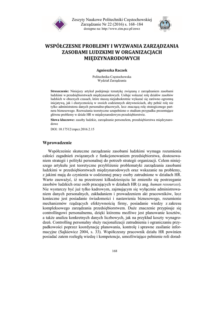 Zeszyty NaukoweAgnieszka Politechniki Raczek Częstochowskiej Zarządzanie Nr 22 (2016) s. 168–184 dostępne na: http://www.zim.pcz.pl/znwz WSPÓŁCZESNE PROBLEMY I WYZWANIA ZARZĄDZANIA ZASOBAMI LUDZKIMI W ORGANIZACJACH MIĘDZYNARODOWYCH Agnieszka Raczek Politechnika Częstochowska Wydział Zarządzania Streszczenie: Niniejszy artykuł podejmuje tematykę związaną z zarządzaniem zasobami ludzkimi w przedsiębiorstwach międzynarodowych. Usiłuje wskazać rolę działów zasobów ludzkich w obecnych czasach, które muszą niejednokrotnie wykazać się zarówno ogromną inicjatywą, jak i elastycznością w swoich codziennych aktywnościach, aby pełnić rolę nie tylko administratora danych personalno-płacowych, lecz znaczącą rolę strategicznego partnera biznesowego. Rozważania teoretyczne uzupełniono o studium przypadku prezentujące główne problemy w dziale HR w międzynarodowym przedsiębiorstwie. Słowa kluczowe: zasoby ludzkie, zarządzanie personelem, przedsiębiorstwa międzynarodowe DOI: 10.17512/znpcz.2016.2.15 Wprowadzenie Współcześnie skuteczne zarządzanie zasobami ludzkimi wymaga rozumienia całości zagadnień związanych z funkcjonowaniem przedsiębiorstwa, dostosowaniem strategii i polityki personalnej do potrzeb strategii organizacji. Celem niniejszego artykułu jest teoretyczne przybliżenie problematyki zarządzania zasobami ludzkimi w przedsiębiorstwach międzynarodowych oraz wskazanie na problemy, z jakimi mają do czynienia w codziennej pracy osoby zatrudnione w działach HR. Warto zauważyć, iż na przestrzeni kilkudziesięciu lat zmieniło się postrzeganie zasobów ludzkich oraz osób pracujących w działach HR (z ang. human resources). Nie wystarczy być już tylko kadrowym, zajmującym się wyłącznie administrowaniem danych personalnych, zakładaniem i prowadzeniem akt pracowników, lecz konieczne jest posiadanie świadomości i nastawienia biznesowego, rozumienie mechanizmów rządzących efektywnością firmy, posiadanie wiedzy z zakresu kompleksowego zarządzania przedsiębiorstwem. Duże znaczenie przypisuje się controllingowi personalnemu, dzięki któremu możliwe jest planowanie kosztów, a także analiza konkretnych danych liczbowych, jak na przykład koszty wynagrodzeń. Controlling personalny służy racjonalizacji zatrudnienia i ograniczaniu przypadkowości poprzez koordynację planowania, kontrolę i sprawne zasilanie informacyjne (Sajkiewicz 2004, s. 33). Współczesny pracownik działu HR powinien posiadać zatem rozległą wiedzę i kompetencje, umożliwiające pełnienie roli dorad- 168 Współczesne problemy i wyzwania zarządzania zasobami ludzkimi … czo-wspierającej dla zarządów przy podejmowaniu strategicznych decyzji mających wpływ na globalne funkcjonowanie firmy. Rola ta jest z całą pewnością trudniejsza w przypadku przedsiębiorstw międzynarodowych, w których oprócz znajomości rozmaitych narzędzi i procesów HR należy wykazać się znajomością także kultury danego kraju, otoczenia rynkowego oraz mentalności pracowników. Miejsce i rola funkcji zarządzania zasobami ludzkimi w przedsiębiorstwach międzynarodowych Należy podkreślić, iż w obecnych czasach zasoby ludzkie mają ogromne znaczenie dla skutecznego, przynoszącego wymierne efekty funkcjonowania każdej organizacji. Jak zauważa R.W. Griffin: „Zarządzanie zasobami ludzkimi (albo – jak się je niekiedy nazywa – zarządzanie personelem) w wielu organizacjach zaliczano kiedyś do zadań drugorzędnych, ale w ciągu ostatnich dwóch dziesięcioleci jego znaczenie ogromnie wzrosło. Wynika to z rosnącej złożoności materii prawnej, z uznania, że zasoby ludzkie są cennym środkiem poprawy wydajności, i z uświadomienia sobie kosztów związanych z niewłaściwym zarządzaniem nimi” (Griffin 2013, s. 441). Można zatem przyjąć, iż współczesne zarządzanie zasobami ludzkimi odgrywa rolę strategiczną. Zdaniem A. Pocztowskiego strategiczne zarządzanie zasobami ludzkimi ma swoje źródła w założeniach koncepcji zarządzania zasobami ludzkimi powstałej w Stanach Zjednoczonych w latach osiemdziesiątych XX wieku. Podejście to zakładało wówczas zupełnie odmienny jak na tamte czasy sposób postrzegania pracowników, mianowicie nie tylko w kategorii źródła kosztów, lecz także jako zasobu wiedzy, umiejętności oraz zdolności, pozwalających na uzyskanie przewagi konkurencyjnej (Pocztowski 2002, s. 37). A. Pocztowski wskazuje ponadto, że w dzisiejszych czasach takie podejście jest czymś oczywistym w definiowaniu ról pełnionych w ramach nowocześnie sprawowanej funkcji personalnej. Wśród nich należy wymienić rolę partnera strategicznego, rolę wewnętrznego dostawcy usług dla szeroko rozumianych klientów oraz rolę wewnętrznego konsultanta (Pocztowski 2002, s. 37). W kwestii pełnienia roli partnera strategicznego należy podkreślić fakt, iż często w zarządach firm międzynarodowych zasiada osoba HR menedżerów / dyrektora personalnego1, a jeśli taka sytuacja nie ma miejsca, to i tak pozycja w strukturach organizacyjnych tychże stanowisk jest bardzo wysoka, tzn. osoby te raportują zwykle bezpośrednio do prezesów zarządu. Biorą udział w spotkaniach kadry kierowniczej wyższego szczebla (w skład której również wchodzą), podejmując decyzje w tak ważnych sprawach jak wielkość i struktura zatrudnienia danej firmy, czy też poziom wynagrodzenia na poszczególnych stanowiskach. To od nich w dużej mierze zależą istniejące w firmie, bądź nie, systemy motywacyjne, czy też jakość i stopień realizacji polityki personalnej w firmach. Należy jednak pamiętać, że oprócz HR menedżerów / dyrektorów personalnych na jakość podejmowanych działań i sposób postrzegania firmy w kontekście mniej lub bardziej atrakcyjnego pracodawcy mają wpływ wszyscy pracownicy działów zasobów ludzHR menedżer / dyrektor personalny – to najczęściej występujące w firmach (zwłaszcza z k