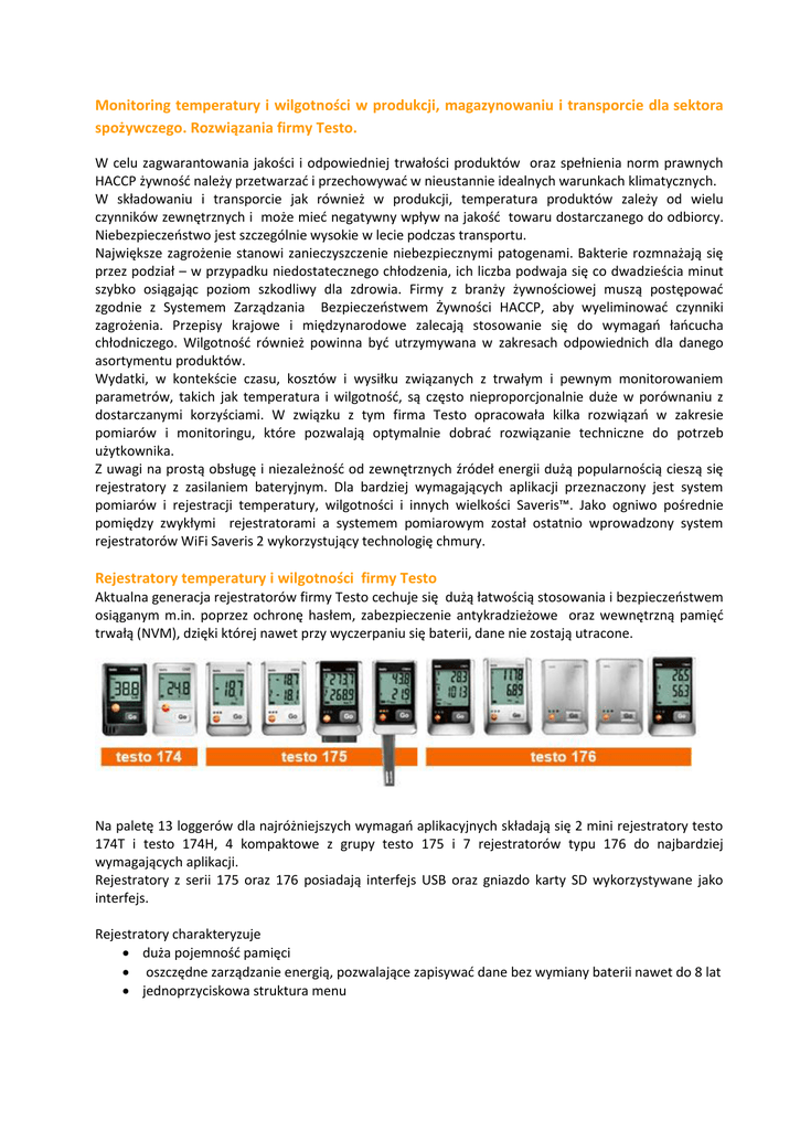 Monitoring temperatury i wilgotności w produkcji, magazynowaniu i transporcie dla sektora spożywczego. Rozwiązania firmy Testo. W celu zagwarantowania jakości i odpowiedniej trwałości produktów oraz spełnienia norm prawnych HACCP żywność należy przetwarzać i przechowywać w nieustannie idealnych warunkach klimatycznych. W składowaniu i transporcie jak również w produkcji, temperatura produktów zależy od wielu czynników zewnętrznych i może mieć negatywny wpływ na jakość towaru dostarczanego do odbiorcy. Niebezpieczeństwo jest szczególnie wysokie w lecie podczas transportu. Największe zagrożenie stanowi zanieczyszczenie niebezpiecznymi patogenami. Bakterie rozmnażają się przez podział – w przypadku niedostatecznego chłodzenia, ich liczba podwaja się co dwadzieścia minut szybko osiągając poziom szkodliwy dla zdrowia. Firmy z branży żywnościowej muszą postępować zgodnie z Systemem Zarządzania Bezpieczeństwem Żywności HACCP, aby wyeliminować czynniki zagrożenia. Przepisy krajowe i międzynarodowe zalecają stosowanie się do wymagań łańcucha chłodniczego. Wilgotność również powinna być utrzymywana w zakresach odpowiednich dla danego asortymentu produktów. Wydatki, w kontekście czasu, kosztów i wysiłku związanych z trwałym i pewnym monitorowaniem parametrów, takich jak temperatura i wilgotność, są często nieproporcjonalnie duże w porównaniu z dostarczanymi korzyściami. W związku z tym firma Testo opracowała kilka rozwiązań w zakresie pomiarów i monitoringu, które pozwalają optymalnie dobrać rozwiązanie techniczne do potrzeb użytkownika. Z uwagi na prostą obsługę i niezależność od zewnętrznych źródeł energii dużą popularnością cieszą się rejestratory z zasilaniem bateryjnym. Dla bardziej wymagających aplikacji przeznaczony jest system pomiarów i rejestracji temperatury, wilgotności i innych wielkości Saveris™. Jako ogniwo pośrednie pomiędzy zwykłymi rejestratorami a systemem pomiarowym został ostatnio wprowadzony system rejestratorów WiFi Saveris 2 wykorzystujący technologię chmury. Rejestratory temperatury i wilgotności firmy Testo Aktualna generacja rejestratorów firmy Testo cechuje się dużą łatwością stosowania i bezpieczeństwem osiąganym m.in. poprzez ochronę hasłem, zabezpieczenie antykradzieżowe oraz wewnętrzną pamięć trwałą (NVM), dzięki której nawet przy wyczerpaniu się baterii, dane nie zostają utracone. Na paletę 13 loggerów dla najróżniejszych wymagań aplikacyjnych składają się 2 mini rejestratory testo 174T i testo 174H, 4 kompaktowe z grupy testo 175 i 7 rejestratorów typu 176 do najbardziej wymagających aplikacji. Rejestratory z serii 175 oraz 176 posiadają interfejs USB oraz gniazdo karty SD wykorzystywane jako interfejs. Rejestratory charakteryzuje duża pojemność pamięci oszczędne zarządzanie energią, pozwalające zapisywać dane bez wymiany baterii nawet do 8 lat jednoprzyciskowa struktura menu Odrębną najnowszą rodzinę rejestratorów stanowią loggery testo 184 charakteryzujące się integralnym wtykiem USB i możliwością programowania oraz automatycznego otrzymywania raportów w plikach PDF, czyli bez specjalistycznego oprogramowania. Odczytu danych można również dokonać smartfonem wykorzystując technologię NFC. W najbogatszej wersji testo 184 G1 możliwa jest rejestracja temperatury, wilgotności i wstrząsów. Rejestratory testo 184 są zgodne ze wszystkimi najważniejszymi przepisami i normami ( w tym HACCP i CFR). Obok bezpłatnej wersji oprogramowania ComSoft Basic 5 firma Testo oferuje również oprogramowanie w wersjach Professional 4 i CFR. Każdy rejestrator posiada fabryczny protokół kalibracji. Na życzenie są także wykonywane wzorcowania w laboratoriach akredytowanych. System pomiarów i archiwizacji temperatury i wilgotności testo Saveris W odróżnieniu od pracujących samodzielnie rejestratorów poszczególne sondy Saveris tworzą jeden system umożlwiający dodatkowo m.in. Oszczędność czasu dzięki automatycznemu zapisywaniu danych pomiarowych w komputerze Alarmowanie o przekroczeniach wartości granicznych przez email lub SMS (opcja) Szerokie możliwości wyboru ustawień alarmowania (np. sposób i kolejność zawiadamiania o alarmach, opóźnienia alarmów itp.) Automatyczne tworzenie raportów w komputerze Dzięki radiowym i ew. ethernetowym połączeniom i bateryjnemu zasilaniu wielu typów sond zachowana jest elastyczność w wyborze miejsc pomiarowych. System rejestratorów danych testo Saveris 2 Rejestratory pracujące w tym systemie łączą się poprzez sieć WiFi użytkownika z Chmurą Testo, w której przechowywane i obrabiane są dane i przez którą następuje programowanie rejestratorów. System jest bardzo prosty w obsłudze, a najprostsza licencja Basic na wykorzystanie chmury jest bezpłatna. Inne zalety sytemu Saveris 2 to m.in. Elastyczny dostęp danych z poziomu komputera PC, smartfonu i tabletu. Brak konieczności instalowania oprogramowania: wystarczy dysponować połączeniem internetowym, bezprzewodową siecią LAN i aktualną przeglądarką internetową. Bardzo wysoki poziom bezpieczeństwa: podwójny zapis danych. Szczegółowe informacje i odpowiedzi na wszystkie pytania dotyczące powyższych produktów można uzyskać pod adresem www.testo.com.pl lub telefonicznie +48 22 292 76 80/81/82/83.