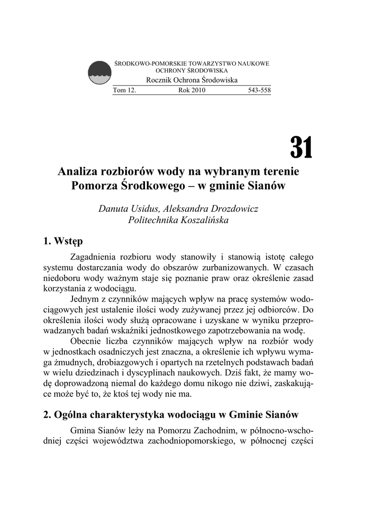 ŚRODKOWO-POMORSKIE TOWARZYSTWO NAUKOWE OCHRONY ŚRODOWISKA Rocznik Ochrona Środowiska Tom 12. Rok 2010 543-558 31 Analiza rozbiorów wody na wybranym terenie Pomorza Środkowego – w gminie Sianów Danuta Usidus, Aleksandra Drozdowicz Politechnika Koszalińska 1. Wstęp Zagadnienia rozbioru wody stanowiły i stanowią istotę całego systemu dostarczania wody do obszarów zurbanizowanych. W czasach niedoboru wody ważnym staje się poznanie praw oraz określenie zasad korzystania z wodociągu. Jednym z czynników mających wpływ na pracę systemów wodociągowych jest ustalenie ilości wody zużywanej przez jej odbiorców. Do określenia ilości wody służą opracowane i uzyskane w wyniku przeprowadzanych badań wskaźniki jednostkowego zapotrzebowania na wodę. Obecnie liczba czynników mających wpływ na rozbiór wody w jednostkach osadniczych jest znaczna, a określenie ich wpływu wymaga żmudnych, drobiazgowych i opartych na rzetelnych podstawach badań w wielu dziedzinach i dyscyplinach naukowych. Dziś fakt, że mamy wodę doprowadzoną niemal do każdego domu nikogo nie dziwi, zaskakujące może być to, że ktoś tej wody nie ma. 2. Ogólna charakterystyka wodociągu w Gminie Sianów Gmina Sianów leży na Pomorzu Zachodnim, w północno-wschodniej części województwa zachodniopomorskiego, w północnej części 544 Danuta Usidus, Aleksandra Drozdowicz powiatu koszalińskiego. Sama miejscowość Sianów położona jest w odległości około 7 km na północny wschód od Koszalina, przy trasie kolejowej i drogowej Koszalin – Słupsk. Leży nad strugą Polnicą. Na południe od miasta płynie rzeka Unieść oraz Struga Sianowska. Sianów spełnia głównie funkcję mieszkaniową i administracyjną, wokoło znajdują się tzw. miejscowości satelitarne, są to niewielkie miejscowości wiejskie o charakterze rolniczym, w sezonie letnim także wypoczynkowym (Skwierzynka, Kędzierzyn, Gorzebądź, Skibno, Sucha Koszalińska, Kleszcze, Osieki, Rzepkowo, Iwięcino, Bielkowo, Wierciszewo, Dąbrowa, Grabówko, Trawica, Karnieszewice, Sieciemin, Sowno, Sierakowo Sławieńskie, Szczeglino, Mokre, Węgorzewo). W mieście przez długie lata (od 1845 roku) funkcjonowała fabryka zapałek, lecz w 2004 roku została zamknięta. Obecnie jest ośrodkiem usługowym (tartak, drobny przemysł spożywczy, handel) oraz działają tu trzy zakłady przemysłowe: firma i fabryka „Dega” – wyroby garmażeryjne w Karnieszewicach, palarnia kawy „MK Cafe” w Skibnie, gospodarstwo rybackie „Dadoń”. Stan istniejący gospodarki wodno-ściekowej Miasto Sianów zaopatrywane jest w wodę z wodociągu miejskiego opartego na trzech studniach wierconych z 1961, 1982 i 2000 r. Osiedle „Piastów”, na którym znajduje się teren ujęcia wody, zlokalizowane jest we wschodniej części miasta. Studnie wyznaczają wierzchołki trójkąta prostokątnego usytuowanego w międzyrzeczu rzeki Unieść i jej dopływu Polnicy, która przepływa wzdłuż północnej granicy osiedla. Wodociąg, o którym mowa stanowi własność Gminy Sianów i jest eksploatowany przez Gminne Wodociągi w Sianowie [11]. Woda uzdatniona tłoczona jest za pomocą pompowni II stopnia do zbiorników hydroforowych, z których po opomiarowaniu kierowana jest do sieci miejskiej. W mieście nie ma pośrednich przepompowni wody, ani studni redukcyjnych. Ścieki z miasta odprowadzane są do mechaniczno-biologicznej oczyszczalni ścieków, a po oczyszczeniu trafiają do „Strugi Sianowskiej” poprzez rów otwarty o długości 40 m skąd wpływają do odbiornika, którym jest rzeka Unista. Analiza rozbiorów wody na wybranym terenie Pomorza Środkowego… 545 Poziom zwodociągowania i skanalizowania w obszarze gminy Sianów to: 92,0% ludności korzystających z wodociągów publicznych oraz 58,5% korzystających z publicznej kanalizacji sanitarnej. Analizując bardziej szczegółowo, otrzymujemy: 96,4% ludności miasta korzystających z wodociągu publicznego, 94,7% ludności miasta korzystających z publicznej kanalizacji sanitarnej, 88,5% ludności wiejskiej korzystających z wodociągów publicznych, 22,8% ludności wiejskiej korzystających z publicznej kanalizacji sanitarnej. Pozostali mieszkańcy i podmioty gospodarcze z omawianego obszaru pobierają wodę na swoje potrzeby z ujęć własnych (studnie wiercone), a ścieki odprowadzają do zbiorników bezodpływowych. Według stanu na koniec roku 2006 [4], z sieci wodociągowej korzystało 86,3% ogółu ludności kraju. Pozbawione takiej możliwości było 5% mieszkańców miast i 27% ludności wiejskiej. W województwie zachodniopomorskim ogółem korzystających z wodociągu było 93,1% mieszkańców, w miastach 96,8%, a na wsi 84,6%. Na podstawie tych danych statystycznych można stwierdzić, iż zarówno gmina traktowana jako całość, jak i miasto Sianów oraz jednostki satelitarne, nie odbiegają od przeciętnych, w skali kraju norm, a nawet o kilka procent je przekraczają. Porównując z innymi województwami [4] cała gmina Sianów plasuje się w ścisłej czołówce, co należy przyjąć za pozytywny objaw. W samym Sianowie jest ok. 14 000 mb rur wodociągowych o przekroju 50÷250 mm z różnych materiałów (przeważa stal i PE). Występują liczne przeciski pod drogą krajową, drogami powiatowymi i osiedlowymi (214 szt.) oraz pięć przejść ponad korytem rzeki Polnicy. Stan techniczny istniejącej sieci wodociągowej jest dobry, tym lepszy, im nowsze jest osiedle. Stare miasto i część osiedla „Piastów” funkcjonowały do lat 90-tych dzięki punktowym hydroforniom i studniom wierconym niskiej wydajności, zaopatrującym co najwyżej kilka budynków. Podobnie funkcjonowało osiedle mieszkalne Kombinatu Państwowych Gospodarstw Ogrodniczych – tzw. Osiedle Karnieszewickie. Po uruchomieniu stacji wodociągowej i stacji uzdatniania wody na początku lat 90-tych, zaczęto sukcesywnie sieciować miasto. Danuta Usidus, Aleksandra Drozdowicz 546 Na podstawie zebra