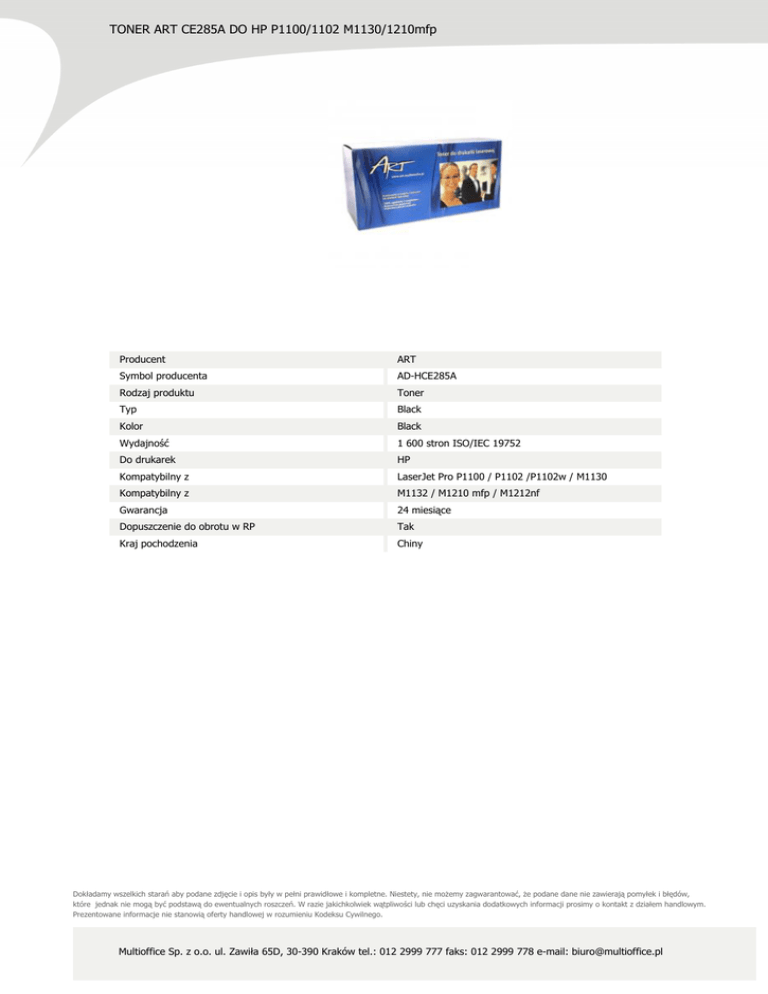 TONER ART CE285A DO HP P1100/1102 M1130/1210mfp Producent ART Symbol producenta AD-HCE285A Rodzaj produktu Toner Typ Black Kolor Black Wydajność 1 600 stron ISO/IEC 19752 Do drukarek HP Kompatybilny z LaserJet Pro P1100 / P1102 /P1102w / M1130 Kompatybilny z M1132 / M1210 mfp / M1212nf Gwarancja 24 miesiące Dopuszczenie do obrotu w RP Tak Kraj pochodzenia Chiny Dokładamy wszelkich starań aby podane zdjęcie i opis były w pełni prawidłowe i kompletne. Niestety, nie możemy zagwarantować, że podane dane nie zawierają pomyłek i błędów, które jednak nie mogą być podstawą do ewentualnych roszczeń. W razie jakichkolwiek wątpliwości lub chęci uzyskania dodatkowych informacji prosimy o kontakt z działem handlowym. Prezentowane informacje nie stanowią oferty handlowej w rozumieniu Kodeksu Cywilnego. Multioffice Sp. z o.o. ul. Zawiła 65D, 30-390 Kraków tel.: 012 2999 777 faks: 012 2999 778 e-mail: [email protected]