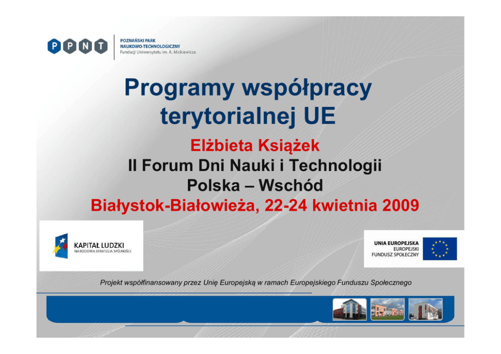 Programy współpracy terytorialnej UE Elżbieta Książek II Forum Dni Nauki i Technologii Polska – Wschód Białystok-Białowieża, 22-24 kwietnia 2009 Projekt współfinansowany przez Unię Europejską w ramach Europejskiego Funduszu Społecznego Budżet UE (2007-2013) Budżet 7PR 3.6 B EUR Konkurencyjność dla rozwoju i zatrudnienia – 8 % Fundusze Struktur alne 53 B EUR Spójność dla rozwoju i zatrudnienia – 35.6 % 280 B EUR Zachowanie i zarządzanie zasobami naturalnymi – 42.7 % Wybrane programy CIP Fundusze Strukturalne (2007-2013) Cele Fundusze i instrumenty Konwergencja EFRR EFS Regionalna Konkurencyjność i Zatrudnienie EFRR EFS Europejska Współpraca Terytorialna EFRR Infrastruktura, innowacje, inwestycje itd. Szkolenia zawodowe, wsparcie zatrudnienia itp. Wszystkie kraje członkowskie Fundusz Spółności Infrastruktura transportu, środowiska, energii odnawialnej Kraje o PKB/capita poniżej 90% Alokacja funduszy strukturalnych (2007-13) Suma: €347.4 billion Konwergencja: €199.3 bn. Fundusz Spójności: €69.6 bn. Faza wyjścia: €13.9 bn. Faza przejściowa: €11.4 bn. Konkurencyjność: €4.5 bn. Współpraca: €7.8 bn. Zarządzanie programem - podział ról • Poziom UE (Rada, PE, KE) – Alokacje finansowe – Akty prawne (Ogólne regulacje, regulacje dla każdego funduszu i regulacje wdrażania) oraz strategiczne wskazówki – Zatwierdzanie programów operacyjnych oraz udział w monitoringu i ewaluacji • Kraje członkowskie (poziom kraju i regionu) – Programowanie, wdrażania, monitoring, ocena Współpraca Międzyregionalna INTERREG • Współpraca przygraniczna (INTERREG IVA) ~70% funduszy, € 5.4 miliardów • 52 programy (infrastruktura, zarządzanie zasobami naturalnymi, przedsiębiorczość i współpraca biznesowa) • Współpraca transnarodowa (INTERREG IVB) ~25% funduszy, € 1.8 miliardów • 13 programów, zagadnienia ważne dla strefy (korytarze komunikacyjne, zasoby naturalne, innowacje) • Współpraca interregionalna (INTERREG IVC, INTERACT, URBACT II, ESPON) ~5% funduszy, € 445 millionów • Wymiana doświadczeń, współpraca sieciowa Strefy INTERREG IVA INTERREG A – Współpraca przygraniczna Polska• Budżet 71,6 mln euro, • Polska alokacja – 41,7 mln euro. Litwa Priorytet 1. Wzrost konkurencyjności i wydajności w regionie przygranicznym poprzez rozwój infrastruktury transgranicznej i współpracy gospodarczej • modernizacja sieci i obiektów infrastrukturalnych, • promocja współpracy gospodarczej i przedsiębiorczości, • rozwój zrównoważonej turystyki transgranicznej. Priorytet 2. Wzmocnienie spójności transgranicznej i poprawa standardów życia • rozwój nowych i wzmocnienie istniejących sieci współpracy w obszarach edukacji, pracy, opieki społecznej, ochrony zdrowia, kultury i sportu, • poprawie warunków życia, • zachowaniu regionalnej tożsamości kulturowej i historycznej. INTERREG IVB 13 Programów • • • • • • • • • • • • Northern Periphery Baltic Sea North West Europe North Sea Atlantic Coast Alpine Space East Central Europe South West Europe Mediterranean South East Europe Caribbean Area Açores-Madeira-Canarias (Macaronesia) • Indian Ocean Area INTERREG IVB Baltic Sea Region 3 Fundusze: • Europejski Fundusz Rozwoju Regionalnego (208,0 MEUR) • Europejski Instrument Sąsiedztwa i Partnerstwa (22,6 MEUR) • Wkład Norwegii (6,0 MEUR) INTERREG IVB Baltic Sea Region • Priorytet 1. WSPIERANIE INNOWACYJNOŚCI • Priorytet 2. ZEWNĘTRZNA I WEWNĘTRZNA DOSTĘPNOŚĆI • Priorytet 3. MORZE BAŁTYCKIE JAKO WSPÓLNY ZASÓB • Priorytet 4. PROMOWANIE ATRAKCYJNOŚCI I KONKURENCYJNOŚCI MIAST I REGIONÓW INTERREG IVB Baltic Sea Region • Poziom do-finansowania –EFRR DE, DK, FI, SE do 75 % EE, LT, LV, PL do 85 % –Norwegia do 50 % – EISP- Białoruś do 90 % INTERREG IVB Central Europe Budżet Central Europe PRIORYTETY EFRR W EURO % PRIORYTET 1 49 202 215 20% 63 962 879 26% 63 962 879 26% 54 122 436 22% 246 011 073 100% INNOWACYJNOŚĆ PRIORYTET 2 DOSTĘPNOŚĆ PRIORYTET 3 ŚRODOWISKO PRIORYTET 4 KONKURENCYJNOŚĆ ŁĄCZNIE INTERREG IVB Central Europe Priorytet 1 -Wspieranie innowacyjności na obszarze Europy Środkowej 1.1 Poprawa ramowych warunków dla innowacji 1.2 Tworzenie możliwości dla rozprzestrzeniania i stosowania innowacji 1.3 Wspieranie rozwoju wiedzy INTERREG IVB Central Europe Priorytet 2 –Poprawa zewnętrznej i wewnętrznej dostępności obszaru Europy Środkowejrodkowej 2.1 Poprawa wewnętrznych połączeń w obszarze Europy Środkowej 2.2 Rozwój współpracy w dziedzinie multimodalnej logistyki 2.3 Promowanie mobilności bezpiecznej i zgodnej z zasadami zrównoważonego rozwoju 2.4 Technologie informatyczno-komunikacyjne i rozwiązania alternatywne dla zwiększenia dostępu obszaru INTERREG IVB Central Europe Priorytet 3 –Odpowiedzialne korzystanie ze środowiska 3.1 Rozwój wysokiej jakości środowiska poprzez zarządzanie zasobami naturalnymi i dziedzictwem oraz ich ochroną 3.2 Redukcja ryzyka oraz skutków zagrożeńnaturalnych i wywołanych działalnościączłowieka 3.3 Wspieranie wykorzystywania źródełenergii odnawialnej i zwiększania efektywności energetycznej 3.4 Wspieranie ekologicznych, przyjaznych środowisku technologii i działań INTERREG IVB Central Europe Priorytet 4 -Podniesienie konkurencyjności oraz atrakcyjności miast i regionów 4.1 Rozwój policentrycznych struktur osadniczych oraz współpracy terytorialnej 4.2 Uwzględnienie terytorialnych skutków zmian demograficzno-społecznych w rozwoju miast i regionów 4.3 Wykorzystanie zasobów kulturowych dla uatrakcyjnienia miast i regionów Projekty IVB • Transnarodowy charakter • Nie tylko minimum partnerstwa • Temat, działanie i rezultat związany z obszarem • Projektu nie da się sfinansować w żadnym innym programie • Pro-wdrożeniowe nastawienie (strategie, narzędzia, pilotażowe działania, w tym drobne inwestycje i lub projektowa