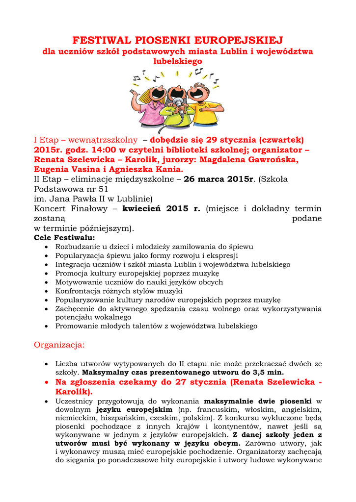 FESTIWAL PIOSENKI EUROPEJSKIEJ dla uczniów szkół podstawowych miasta Lublin i województwa lubelskiego I Etap – wewnątrzszkolny – dobędzie się 29 stycznia (czwartek) 2015r. godz. 14:00 w czytelni biblioteki szkolnej; organizator – Renata Szelewicka – Karolik, jurorzy: Magdalena Gawrońska, Eugenia Vasina i Agnieszka Kania. II Etap – eliminacje międzyszkolne – 26 marca 2015r. (Szkoła Podstawowa nr 51 im. Jana Pawła II w Lublinie) Koncert Finałowy – kwiecień 2015 r. (miejsce i dokładny termin zostaną podane w terminie późniejszym). Cele Festiwalu:          Rozbudzanie u dzieci i młodzieży zamiłowania do śpiewu Popularyzacja śpiewu jako formy rozwoju i ekspresji Integracja uczniów i szkół miasta Lublin i województwa lubelskiego Promocja kultury europejskiej poprzez muzykę Motywowanie uczniów do nauki języków obcych Konfrontacja różnych stylów muzyki Popularyzowanie kultury narodów europejskich poprzez muzykę Zachęcenie do aktywnego spędzania czasu wolnego oraz wykorzystywania potencjału wokalnego Promowanie młodych talentów z województwa lubelskiego Organizacja:  Liczba utworów wytypowanych do II etapu nie może przekraczać dwóch ze szkoły. Maksymalny czas prezentowanego utworu do 3,5 min.  Na zgłoszenia czekamy do 27 stycznia (Renata Szelewicka Karolik).  Uczestnicy przygotowują do wykonania maksymalnie dwie piosenki w dowolnym języku europejskim (np. francuskim, włoskim, angielskim, niemieckim, hiszpańskim, czeskim, polskim). Z konkursu wykluczone będą piosenki pochodzące z innych krajów i kontynentów, nawet jeśli są wykonywane w jednym z języków europejskich. Z danej szkoły jeden z utworów musi być wykonany w języku obcym. Zarówno utwory, jak i wykonawcy muszą mieć europejskie pochodzenie. Organizatorzy zachęcają do sięgania po ponadczasowe hity europejskie i utwory ludowe wykonywane    w innych językach niż język angielski. Repertuar powinien być dobrany zarówno do wieku, jak i możliwości wokalno-artystycznych młodego wykonawcy. Organizatorzy zastrzegają sobie prawo niezakwalifikowania do II etapu utworów, które nie spełniają ww. kryteriów. Uczestnicy mogą śpiewać z akompaniamentem własnym, osobą akompaniującą, podkładem muzycznym z płyty lub a’cappella. Organizatorzy zapewniają sprzęt nagłaśniający i mikrofony. Organizatorzy do konkursu zapraszają wykonawców-amatorów: solistów, duety, zespoły wokalno-taneczne i chóry.  Jury będzie oceniało:      Wrażenie artystyczne Oryginalność i trafność doboru repertuaru Interpretację i poprawność językową Umiejętności wokalne wykonawcyów Oprawę choreograficzną SERDECZNIE ZAPRASZAMY :)