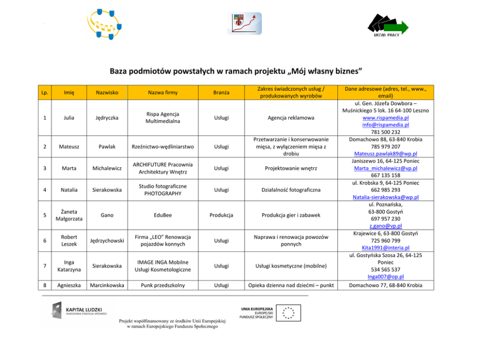 Baza podmiotów powstałych w ramach projektu „Mój własny biznes” Lp. Imię Nazwisko Nazwa firmy Branża Zakres świadczonych usług / produkowanych wyrobów 1 Julia Jędryczka Rispa Agencja Multimedialna Usługi Agencja reklamowa 2 Mateusz Pawlak Rzeźnictwo-wędliniarstwo Usługi Przetwarzanie i konserwowanie mięsa, z wyłączeniem mięsa z drobiu 3 Marta Michalewicz ARCHIFUTURE Pracownia Architektury Wnętrz Usługi Projektowanie wnętrz 4 Natalia Sierakowska Studio fotograficzne PHOTOGRAPHY Usługi Działalność fotograficzna 5 Żaneta Małgorzata Gano EduBee Produkcja Produkcja gier i zabawek 6 Robert Leszek Jędrzychowski Firma „LEO” Renowacja pojazdów konnych Usługi Naprawa i renowacja powozów ponnych 7 Inga Katarzyna Sierakowska IMAGE INGA Mobilne Usługi Kosmetologiczne Usługi Usługi kosmetyczne (mobilne) 8 Agnieszka Marcinkowska Punk przedszkolny Usługi Opieka dzienna nad dziećmi – punkt Projekt współfinansowany ze środków Unii Europejskiej w ramach Europejskiego Funduszu Społecznego Dane adresowe (adres, tel., www., email) ul. Gen. Józefa Dowbora – Muśnickiego 5 lok. 16 64-100 Leszno www.rispamedia.pl [email protected] 781 500 232 Domachowo 88, 63-840 Krobia 785 979 207 [email protected] Janiszewo 16, 64-125 Poniec [email protected] 667 135 158 ul. Krobska 9, 64-125 Poniec 662 985 293 [email protected] ul. Poznańska, 63-800 Gostyń 697 957 230 [email protected] Krajewice 6, 63-800 Gostyń 725 960 799 [email protected] ul. Gostyńska Szosa 26, 64-125 Poniec 534 565 537 [email protected] Domachowo 77, 68-840 Krobia „Michałek” przedszkolny 9 Przemysław Giernalczyk AUTO SERWIS Usługi Mechanika pojazdów osobowych 10 Bogdan Laskowski Firma rowerowa Bo-e-ro Handel/usługi Sprzedaż i naprawa rowerów 11 Dariusz Tomczak SILVER GYM Usługi Działalność obiektów służących poprawie kondycji fizycznej 12 Anna Teresa Kasińska PPHU ANIKA Usługi Produkcja odzieży roboczej – pogotowie krawieckie 13 Weronika Aneta Sękowska Ogrody z pasją Usługi Zagospodarowanie terenów zielonych 14 Leszek Maciej Szymkowiak Stolarstwo Szymkowiak Produkcja Stolarstwo 15 Marcin Walczewski Dante Music Usługi Opraw muzyczna imprez okoliczniościowych 16 Roman Krzysztof Giera AUTO DIAGNOSTIC Usługi Mechanika pojazdowa 17 Marek Radoła OZONMARK Usługi Usługi ozonowania 18 Erwin Garbarczyk Fucco Design Produckja/usługi Wydruk 3d Projekt współfinansowany ze środków Unii Europejskiej w ramach Europejskiego Funduszu Społecznego 508 031 114 [email protected] ul. Leszczyńska 1b, 63-842 Pudliszki 781 469 017 [email protected] Głuchów 18, 63-860 Pogorzela 607 136 112 [email protected] ul. Nad Kanią 119A, 63-800 Gostyń 667 483 891 [email protected] ul. Wojska Polskiego 2, 63-800 Gostyń 661 562 692 [email protected] ul. Brzechwy 21/3, 63-100 Śrem 692 550 088 [email protected] Stara Krobia 28, 63-840 Krobia 692 497 160 [email protected] Gola 32, 63-800 Gostyń 604 658 176 [email protected] ul. Hutnika 3a/10, 63-800 Gostyń 721 527 017 [email protected] ul. Polna 61a, 63-800 Gostyń 601 167 471 [email protected] ul. Drożdżyńskiego 15, 64-125 Poniec 726 571 918 [email protected] 19 Marlena Bezwierzchna URWIS Handel Sprzedaż detaliczna odzieży dziecięcej 20 Ewelina Pospieszyńska Fish SPA Usługi Usługi kosmetyczne, zabiegi fish 21 Magdalena Jarożek Biuro tłumaczeniowo – reklamowe OGHAM Usługi Agencja reklamowa i tłumaczenia 22 Daria Marta Seiffert Niepowtarzajka Handel Sprzedaż internetowa herbatek i rękodzieła 23 Piotr Andrzejczak Pogotowie stolarskie Usługi Stolarstwo – pogotowie ststolarskie 24 Radosław Piętak Firma budowlana Usługi Firma ogólnobudowlana, usługi koparką 25 Magdalena Stańczak KUFEREK Z IGIELKA Usługi Krawiectwo 26 Stefan Klepacki ORGANMISTRZOSTWO Usługi Produkcja i naprawa instrumentów muzycznych 27 Piotr Marcin Kasprzak DREAM HOUSE Piotr Kasprzak Usługi Usługi ogólnobudowlane 28 Witold Sierszulski REKU Witold Sierszulski Usługi 29 Mateusz Kaźmierczak Eywa Mateusz Kaźmierczak Usługi Projekt współfinansowany ze środków Unii Europejskiej w ramach Europejskiego Funduszu Społecznego Usługi instalacji wodnokanalizacyjnych, cieplnych, gazowych i klimatyzacyjnych Usługi zagospodarowaniem terenów zieleni, aborystyka Rynek 25, 63-840 Krobia 693 545 604 [email protected] ul. Nad Kanią 113, 63-800 Gostyń 665 246 671 [email protected] ul. K.Arciszewskiego 35a/9, 60-271 Poznań 665 312 277 [email protected] ul. Czereśniowa 5, 63-800 Gostyń 783 483 888 [email protected] Osiedle Marysin 24, 63-820 Piaski 609 388 886 [email protected] Ostrowo 15, 63-800 Gostyń 691 680 194 [email protected] ul.Warszawska 1, 63-820 Piaski 510 298 962 [email protected] ul. M.Orlonia, 63-830 Pępowo 607 303 850 [email protected] Zalesie 13 lok. 5, 63-810 Borek Wielkopolski 697 796 621 [email protected] [email protected] ul. Wałowa 2, 63-860 Pogorzela 663 742 920 ul. Stanisławy Nadstawek 17 lok. 3, 63-830 Pępowo 30 Oktawia Banaszek Usługi BHP-SZKOLENIA Oktawia Banaszek Usługi Pozostałe pozaszkolne formy edukacji, gdzie indziej niesklasyfikowane, usługi BHP 31 Mateusz Andrzejewski PPHU KOLOR Handel Sprzedaż farb i materiałów budowlanych 32 Kamil Leśniak Active Body Kamil Leśniak Usługi Działalność obiektów służących poprawie kondycji fizycznej 33 Piotr Hasiński FIZJOCARE Piotr Hasiński Usługi Działalność fizjoterapeutyczna Usługi Roboty budowlane związane ze wznoszeniem budynków mieszkalnych i niemieszkalnych, głównie murarstwo 34 Sylwester Frąckowiak ZAKŁAD MURARSKI SYLWESTER FRĄCKOWIAK 35 Kinga Chuda KINGA CHUDA FRYZJERSTWO NA KÓŁKACH "KINGA" Usługi Fryzjerstwo i pozostałe zabiegi kosmetyczne (usugi mbilne) 36 Agnieszka Bartkowiak Agnieszka Bartkowiak KAWIARNIA HOT BLACK CAFFEE Handel Restauracje i inne stałe placówki gastronomiczne 37 Katarzyna Magdalena Pietrzak Pracownia Zmysł Katarzyna Pietrzak Usługi Działalność w zakresie specjalistycznego projektowania 38 Adam Marek Leszkowicz A