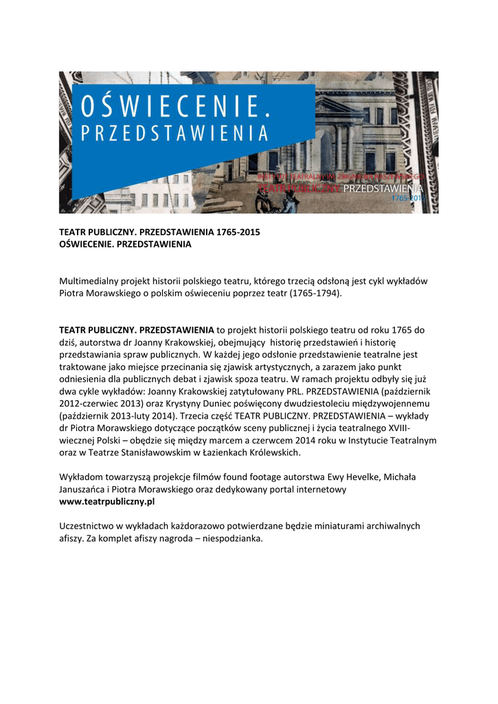 TEATR PUBLICZNY. PRZEDSTAWIENIA 1765-2015 OŚWIECENIE. PRZEDSTAWIENIA Multimedialny projekt historii polskiego teatru, którego trzecią odsłoną jest cykl wykładów Piotra Morawskiego o polskim oświeceniu poprzez teatr (1765-1794). TEATR PUBLICZNY. PRZEDSTAWIENIA to projekt historii polskiego teatru od roku 1765 do dziś, autorstwa dr Joanny Krakowskiej, obejmujący historię przedstawień i historię przedstawiania spraw publicznych. W każdej jego odsłonie przedstawienie teatralne jest traktowane jako miejsce przecinania się zjawisk artystycznych, a zarazem jako punkt odniesienia dla publicznych debat i zjawisk spoza teatru. W ramach projektu odbyły się już dwa cykle wykładów: Joanny Krakowskiej zatytułowany PRL. PRZEDSTAWIENIA (październik 2012-czerwiec 2013) oraz Krystyny Duniec poświęcony dwudziestoleciu międzywojennemu (październik 2013-luty 2014). Trzecia część TEATR PUBLICZNY. PRZEDSTAWIENIA – wykłady dr Piotra Morawskiego dotyczące początków sceny publicznej i życia teatralnego XVIIIwiecznej Polski – obędzie się między marcem a czerwcem 2014 roku w Instytucie Teatralnym oraz w Teatrze Stanisławowskim w Łazienkach Królewskich. Wykładom towarzyszą projekcje filmów found footage autorstwa Ewy Hevelke, Michała Januszańca i Piotra Morawskiego oraz dedykowany portal internetowy www.teatrpubliczny.pl Uczestnictwo w wykładach każdorazowo potwierdzane będzie miniaturami archiwalnych afiszy. Za komplet afiszy nagroda – niespodzianka. OŚWIECENIE. PRZEDSTAWIENIA Teatr publiczny w Polsce od początku był medium mocno ingerującym w życie społeczne, generującym konflikt polityczny i skutecznie nim sterującym. Sojusz sceny i prasy drukarskiej w misji modernizacyjnej pozwala zobaczyć w teatrze polskim doby XVIII wieku główne obok „Monitora” miejsce debaty na temat spraw publicznych. Teatr stał się wreszcie – jak pokazuje przykład „Krakowiaków i górali” czy „Szkoły obmowy” – kluczową instytucją życia społecznego zdolną kreować bieg wypadków czy realnie uczestniczącą w działalności charytatywnej. W 1765 roku teatr publiczny rozpoczął debatę, która właściwie trwa do dziś. Wówczas chodziło przecież też nie tylko o obyczaje – stawką była polska nowoczesność. Zmieniały się kostiumy, lecz główna oś konfliktu miedzy nowoczesnością a jej zaprzeczeniem pozostawała cały czas ta sama. Warto zatem spojrzeć na oświeceniowy projekt teatru publicznego z dzisiejszej perspektywy; dostrzec jego potencjał krytyczny i zaangażowanie w życie społeczne. Zaangażowanie, jakiego w polskim teatrze nigdy wcześniej nie było, a i później nie tak znowu częstego. Zobaczyć w nim nie spetryfikowany kanon szeleszczących papierem lektur, lecz niepokojąco skutecznie działające narzędzie społecznej zmiany. Piotr Morawski Program wykładów i projekcji: 11.03.2014 NATRĘCI, czyli obyczaje 25.03.2014 PANNA NA WYDANIU, czyli wychowanie 15.04.2014 AUTOR KOMEDII, czyli klasycyzm 29.04. 2014 CZYNSZ, czyli chłopi 13.05.2014 WIELKIE RZECZY I CÓŻ MI TO WADZI, czyli Targowica 27.05.2014 SZKOŁA OBMOWY, czyli nędza 10.06.2014 KRAKOWIACY I GÓRALE, czyli insurekcja 24.06.2014 TACZKA OCCIARZA, czyli mieszczaństwo godz. 18.00 wykłady: 11.03, 25.03, 29.04, 27.05, 10.06 odbędą się w Instytucie Teatralnym, ul. Jazdów 1 wykłady: 15.04, 13.05, 24.06 odbędą się w Teatrze Stanisławowskim (Stara Pomarańczarnia), Muzeum Łazienki Królewskie, ul. Agrykola 1 dr Piotr Morawski – kulturoznawca, ukończył studia w Instytucie Kultury Polskiej na Uniwersytecie Warszawskim, studiował też historię na tym samym uniwersytecie. Pracuje w redakcji „Dialogu” i w IKP UW; współpracuje z Instytutem Teatralnym im. Zbigniewa Raszewskiego przy tworzeniu internetowej encyklopedii teatru polskiego, współtworzył także projekt Theatre Architecture in Central Europe. Zajmuje się kulturową historią widowisk przede wszystkim w czasach przednowoczesnych. Razem z Ewą Partygą wydał tom zbiorowy Niebezpieczne związki. Dramat, teatr i kultura popularna (2010), a z Dorotą Buchwald i Moniką Jarzyną Architektura teatralna w Polsce (2011). W tym roku ukaże się jego autorska książka Ustanawianie świętości. Kulturowa historia angielskich widowisk religijnych w XVI wieku na tle europejskim. Jest sekretarzem Polskiego Towarzystwa Badań Teatralnych. Program: 11.03.2014 NATRĘCI, czyli obyczaje Przedstawienie to nie tylko zainaugurowało działalność sceny publicznej w Polsce, lecz także podsumowywało pierwszy etap jej działalności. Między prapremierą 19 listopada 1765 roku a ostatnim przedstawieniem „Natrętów” z 10 marca 1767 roku, zamykającym pierwszy okres działalności Teatru Narodowego, na scenie w Operalni Saskiej grane były spektakle, których twórcy stawiali sobie za cel zmianę obyczajów Polaków – piętnując pijaństwo, zabobony, hulaszcze życie, modnisiostwo, wreszcie – sarmackie wartości. Owo „teatrum polskich wad i błędów” wraz z kampanią publicystyczną prowadzoną równolegle w „Monitorze” miało uczynić z Polaków oświecony naród. Z czego się biorą paradoksy polskiej nowoczesności i na czym polega ambiwalencja misji cywilizacyjnej prowadzonej za pośrednictwem teatru i prasy? Dlaczego ten projekt cywilizacyjny poniósł klęskę? 25.03.2014 PANNA NA WYDANIU, czyli wychowanie „Panna na wydaniu” Adama Kazimierza Czartoryskiego grana była po raz pierwszy na scenie Korpusu Kadetów. To właśnie postać Czartoryskiego stanie w centrum namysłu nad wychowaniem. Czartoryski, jako autor „Katechizmu moralnego dla uczniów Korpusu Kadetów”, komendant Szkoły Rycerskiej, a także członek Komisji Edukacji Narodowej jest jednym z fundatorów instytucji odpowiedzialnych za wychowanie. Za sprawą „Panny na wydaniu” – komedii o perypetiach związanych z wychowaniem – instytucją kształtującą młodzież staje się też teatr, w tym przypadku scena Korp
