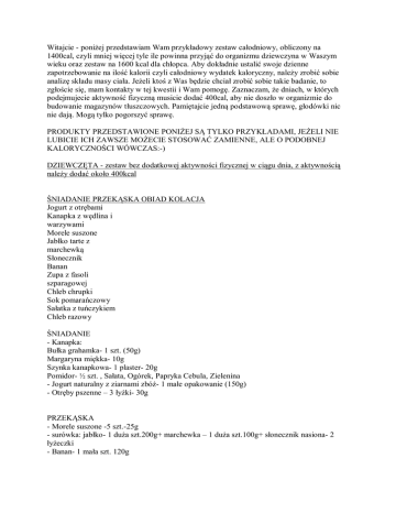 Witajcie - poniżej przedstawiam Wam przykładowy zestaw całodniowy, obliczony na 1400cal, czyli mniej więcej tyle ile powinna przyjąć do organizmu dziewczyna w Waszym wieku oraz zestaw na 1600 kcal dla chłopca. Aby dokładnie ustalić swoje dzienne zapotrzebowanie na ilość kalorii czyli całodniowy wydatek kaloryczny, należy zrobić sobie analizę składu masy ciała. Jeżeli ktoś z Was będzie chciał zrobić sobie takie badanie, to zgłoście się, mam kontakty w tej kwestii i Wam pomogę. Zaznaczam, że dniach, w których podejmujecie aktywność fizyczną musicie dodać 400cal, aby nie doszło w organizmie do budowanie magazynów tłuszczowych. Pamiętajcie jedną podstawową sprawę, głodówki nic nie dają. Mogą tylko pogorszyć sprawę. PRODUKTY PRZEDSTAWIONE PONIŻEJ SĄ TYLKO PRZYKŁADAMI, JEŻELI NIE LUBICIE ICH ZAWSZE MOŻECIE STOSOWAĆ ZAMIENNE, ALE O PODOBNEJ KALORYCZNOŚCI WÓWCZAS:-) DZIEWCZĘTA - zestaw bez dodatkowej aktywności fizycznej w ciągu dnia, z aktywnością należy dodać około 400kcal ŚNIADANIE PRZEKĄSKA OBIAD KOLACJA Jogurt z otrębami Kanapka z wędlina i warzywami Morele suszone Jabłko tarte z marchewką Słonecznik Banan Zupa z fasoli szparagowej Chleb chrupki Sok pomarańczowy Sałatka z tuńczykiem Chleb razowy ŚNIADANIE - Kanapka: Bułka grahamka- 1 szt. (50g) Margaryna miękka- 10g Szynka kanapkowa- 1 plaster- 20g Pomidor- ½ szt. , Sałata, Ogórek, Papryka Cebula, Zielenina - Jogurt naturalny z ziarnami zbóż- 1 małe opakowanie (150g) - Otręby pszenne – 3 łyżki- 30g PRZEKĄSKA - Morele suszone -5 szt.-25g - surówka: jabłko- 1 duża szt.200g+ marchewka – 1 duża szt.100g+ słonecznik nasiona- 2 łyżeczki - Banan- 1 mała szt. 120g OBIAD - Zupa z fasoli szparagowej – 2 szklanki ( z dużą ilością warzyw) – 600ml - Chleb chrupki- 2 szt. - Sok z czarnej porzeczki lub pomarańczowy bez cukru 100% – 1 szklanka- 250ml KOLACJA - Sałatka z tuńczykiem Tuńczyk w sosie własnym- ½ małej puszki (50g) Mieszanka meksykańska bonduelle- 1/2 małej puszki (175g) Majonez- 1 łyżeczka, przyprawy do smaku wg uznania - Chleb razowy – 1 kromka może być posmarowana margaryną lub majonezem CHŁOPCY - zestaw bez dodatkowej aktywności fizycznej w ciągu dnia, z aktywnością należy dodać około 400kcal ŚNIADANIE PRZEKĄSKA 1 OBIAD PRZEKĄSKA 2 KOLACJA Kanapka z serem i warzywami Kefir naturalny Ciasteczka z pełnego ziarna Sałatka z jabłka i marchewki Gołąbki z mięsem i ryżem Sok z czarnej porzeczki Bułka z wędliną i warzywami Koktajl z truskawkami Tosty ŚNIADANIE -Kanapka: Chleb pełnoziarnisty lub zwykły- 2 kromki- 80g Margaryna miękka- 2 łyżeczki- 10g, Papryka- 50g , sałata- 3 liscie, Pomidor- 1 szt.- 150g Ser żółty Gouda- 2 plasterki- 30g - Kefir 2% tł. – 1 mała szt. 150g PRZEKĄSKA 1 - Sałatka: Jabłko- 1 szt. średnia- 150g, Marchew- 1 duża szt.-100g - Ciasteczka belvita – 2 szt OBIAD - Gołąbki z mięsem i ryżem w sosie pomidorowym – 2 szt.- 250g - Sok z czarnej porzeczki- 1 szklanka- 250 ml PRZEKĄSKA 2 - Kanapka: Bułka grahamka- 1 szt.- 50g Margaryna miękka- 2 łyżeczki- 10g Szynka kanapkowa- 2 plasterki- 30g Papryka-50g, Ogórek- 100g, sałata- 3 -4liście KOLACJA - Koktajl truskawkowy: Truskawki mrożone- 1 szklanka- 300g, Jogurt naturalny- 1 opakowanie- 150g, cukier – 1 łyżeczka-5g, mleko – 1,5% SMACZNEGO:-) Katarzyna Staśkiewicz
