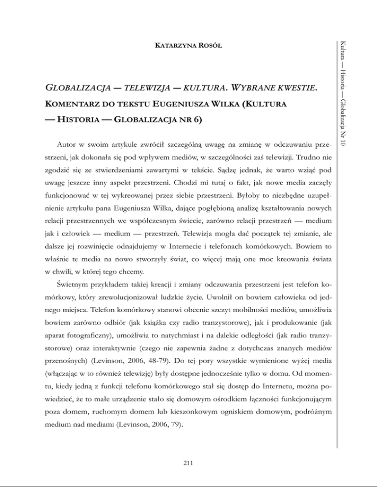 GLOBALIZACJA — TELEWIZJA — KULTURA. WYBRANE KWESTIE. KOMENTARZ DO TEKSTU EUGENIUSZA WILKA (KULTURA — HISTORIA — GLOBALIZACJA NR 6) Autor w swoim artykule zwrócił szczególną uwagę na zmianę w odczuwaniu przestrzeni, jak dokonała się pod wpływem mediów, w szczególności zaś telewizji. Trudno nie zgodzić się ze stwierdzeniami zawartymi w tekście. Sądzę jednak, że warto wziąć pod uwagę jeszcze inny aspekt przestrzeni. Chodzi mi tutaj o fakt, jak nowe media zaczęły funkcjonować w tej wykreowanej przez siebie przestrzeni. Byłoby to niezbędne uzupełnienie artykułu pana Eugeniusza Wilka, dające pogłębioną analizę kształtowania nowych relacji przestrzennych we współczesnym świecie, zarówno relacji przestrzeń — medium jak i człowiek — medium — przestrzeń. Telewizja mogła dać początek tej zmianie, ale dalsze jej rozwinięcie odnajdujemy w Internecie i telefonach komórkowych. Bowiem to właśnie te media na nowo stworzyły świat, co więcej mają one moc kreowania świata w chwili, w której tego chcemy. Świetnym przykładem takiej kreacji i zmiany odczuwania przestrzeni jest telefon komórkowy, który zrewolucjonizował ludzkie życie. Uwolnił on bowiem człowieka od jednego miejsca. Telefon komórkowy stanowi obecnie szczyt mobilności mediów, umożliwia bowiem zarówno odbiór (jak książka czy radio tranzystorowe), jak i produkowanie (jak aparat fotograficzny), umożliwia to natychmiast i na dalekie odległości (jak radio tranzystorowe) oraz interaktywnie (czego nie zapewnia żadne z dotychczas znanych mediów przenośnych) (Levinson, 2006, 48-79). Do tej pory wszystkie wymienione wyżej media (włączając w to również telewizję) były dostępne jednocześnie tylko w domu. Od momentu, kiedy jedną z funkcji telefonu komórkowego stał się dostęp do Internetu, można powiedzieć, że to małe urządzenie stało się domowym ośrodkiem łączności funkcjonującym poza domem, ruchomym domem lub kieszonkowym ogniskiem domowym, podróżnym medium nad mediami (Levinson, 2006, 79). 211 Kultura — Historia — Globalizacja Nr 10 KATARZYNA ROSÓŁ Komentarze Człowiek, do tej pory zakorzeniony w pewnej określonej przestrzeni, został z niej niemal wyrugowany za pośrednictwem nowych mediów. Doprowadziło to również do swoistej parcelacji jednostki, którą wymogła mobilność wymienionych przeze mnie mediów. Człowiek «samowystarczalny» jest całością martwą. Zaczyna żyć o tyle, o ile ma odwagę rozpoznać się w części. Albo jest fragmentem albo nie ma go wcale. Jako fragment wciąż wybiera strategię współbycia wraz z innymi fragmentami — z innymi ludźmi oraz tym wszystkim, czym, wraz z nim żyje (Kubicki, 1991, 31). Jako całość jest martwy, ponieważ odcina się od komunikacji z innymi ludźmi, której przecież w obecnych czasach tak bardzo potrzebuje i jest nią poniekąd bombardowany i na nią skazany zarówno za pomocą Internetu jak i telefonu komórkowego. Literatura: Levinson, P.; 2006, Telefon komórkowy. Jak zmienił świat najbardziej mobilny ze środków komunikacji, tłum. H. Jankowska, Warszawa Kubicki, R.; 1999, Wolność pośród rzeczy, w: S. Wysłouch, B. Kaniewska (red), Człowiek i rzecz. O problemach reifikacji w literaturze, filozofii i sztuce, Poznań 212