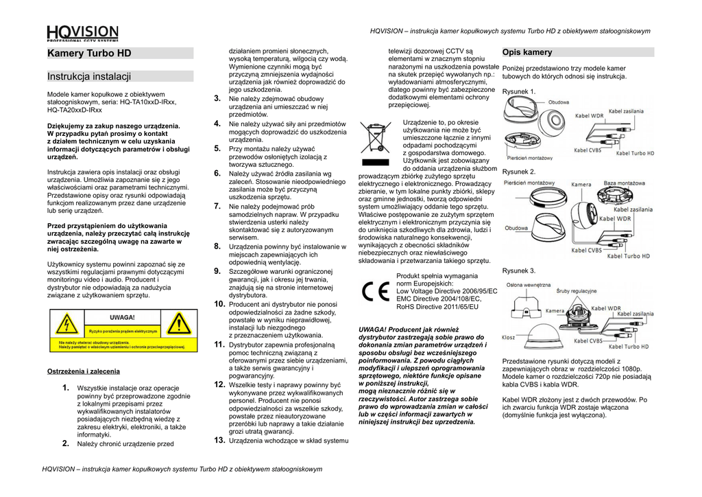 HQVISION – instrukcja kamer kopułkowych systemu Turbo HD z obiektywem stałoogniskowym Kamery Turbo HD Instrukcja instalacji Modele kamer kopułkowe z obiektywem stałoogniskowym, seria: HQ-TA10xxD-IRxx, HQ-TA20xxD-IRxx Dziękujemy za zakup naszego urządzenia. W przypadku pytań prosimy o kontakt z działem technicznym w celu uzyskania informacji dotyczących parametrów i obsługi urządzeń. Instrukcja zawiera opis instalacji oraz obsługi urządzenia. Umożliwia zapoznanie się z jego właściwościami oraz parametrami technicznymi. Przedstawione opisy oraz rysunki odpowiadają funkcjom realizowanym przez dane urządzenie lub serię urządzeń. Przed przystąpieniem do użytkowania urządzenia, należy przeczytać całą instrukcję zwracając szczególną uwagę na zawarte w niej ostrzeżenia. Użytkownicy systemu powinni zapoznać się ze wszystkimi regulacjami prawnymi dotyczącymi monitoringu video i audio. Producent i dystrybutor nie odpowiadają za nadużycia związane z użytkowaniem sprzętu. 3. 4. 5. 6. 7. 8. 9. 10. 11. Ostrzeżenia i zalecenia 1. 2. Wszystkie instalacje oraz operacje powinny być przeprowadzone zgodnie z lokalnymi przepisami przez wykwalifikowanych instalatorów posiadających niezbędną wiedzę z zakresu elektryki, elektroniki, a także informatyki. Należy chronić urządzenie przed 12. 13. działaniem promieni słonecznych, wysoką temperaturą, wilgocią czy wodą. Wymienione czynniki mogą być przyczyną zmniejszenia wydajności urządzenia jak również doprowadzić do jego uszkodzenia. Nie należy zdejmować obudowy urządzenia ani umieszczać w niej przedmiotów. Nie należy używać siły ani przedmiotów mogących doprowadzić do uszkodzenia urządzenia. Przy montażu należy używać przewodów osłoniętych izolacją z tworzywa sztucznego. Należy używać źródła zasilania wg zaleceń. Stosowanie nieodpowiedniego zasilania może być przyczyną uszkodzenia sprzętu. Nie należy podejmować prób samodzielnych napraw. W przypadku stwierdzenia usterki należy skontaktować się z autoryzowanym serwisem. Urządzenia powinny być instalowanie w miejscach zapewniających ich odpowiednią wentylację. Szczegółowe warunki ograniczonej gwarancji, jak i okresu jej trwania, znajdują się na stronie internetowej dystrybutora. Producent ani dystrybutor nie ponosi odpowiedzialności za żadne szkody, powstałe w wyniku nieprawidłowej, instalacji lub niezgodnego z przeznaczeniem użytkowania. Dystrybutor zapewnia profesjonalną pomoc techniczną związaną z oferowanymi przez siebie urządzeniami, a także serwis gwarancyjny i pogwarancyjny. Wszelkie testy i naprawy powinny być wykonywane przez wykwalifikowanych personel. Producent nie ponosi odpowiedzialności za wszelkie szkody, powstałe przez nieautoryzowane przeróbki lub naprawy a takie działanie grozi utratą gwarancji. Urządzenia wchodzące w skład systemu HQVISION – instrukcja kamer kopułkowych systemu Turbo HD z obiektywem stałoogniskowym telewizji dozorowej CCTV są Opis kamery elementami w znacznym stopniu narażonymi na uszkodzenia powstałe Poniżej przedstawiono trzy modele kamer na skutek przepięć wywołanych np.: tubowych do których odnosi się instrukcja. wyładowaniami atmosferycznymi, dlatego powinny być zabezpieczone Rysunek 1. dodatkowymi elementami ochrony przepięciowej. Urządzenie to, po okresie użytkowania nie może być umieszczone łącznie z innymi odpadami pochodzącymi z gospodarstwa domowego. Użytkownik jest zobowiązany do oddania urządzenia służbom Rysunek 2. prowadzącym zbiórkę zużytego sprzętu elektrycznego i elektronicznego. Prowadzący zbieranie, w tym lokalne punkty zbiórki, sklepy oraz gminne jednostki, tworzą odpowiedni system umożliwiający oddanie tego sprzętu. Właściwe postępowanie ze zużytym sprzętem elektrycznym i elektronicznym przyczynia się do uniknięcia szkodliwych dla zdrowia, ludzi i środowiska naturalnego konsekwencji, wynikających z obecności składników niebezpiecznych oraz niewłaściwego składowania i przetwarzania takiego sprzętu. Produkt spełnia wymagania norm Europejskich: Low Voltage Directive 2006/95/EC EMC Directive 2004/108/EC, RoHS Directive 2011/65/EU UWAGA! Producent jak również dystrybutor zastrzegają sobie prawo do dokonania zmian parametrów urządzeń i sposobu obsługi bez wcześniejszego poinformowania. Z powodu ciągłych modyfikacji i ulepszeń oprogramowania sprzętowego, niektóre funkcje opisane w poniższej instrukcji, mogą nieznacznie różnić się w rzeczywistości. Autor zastrzega sobie prawo do wprowadzania zmian w całości lub w części informacji zawartych w niniejszej instrukcji bez uprzedzenia. Rysunek 3. Przedstawione rysunki dotyczą modeli z zapewniających obraz w rozdzielczości 1080p. Modele kamer o rozdzielczości 720p nie posiadają kabla CVBS i kabla WDR. Kabel WDR złożony jest z dwóch przewodów. Po ich zwarciu funkcja WDR zostaje włączona (domyślnie funkcja jest wyłączona). HQVISION – instrukcja kamer kopułkowych systemu Turbo HD z obiektywem stałoogniskowym EXPOSURE: SHUTTER – szybkość migawki: AUTO, 1/25, 1/50, FLK, 1/200, 1/400, 1,1k, 1/2k, 1/5k, 1/10k, 1/50k, x2, x4, x6, x8, x10, x15 AGC – automatyczna regulacja wzmocnienia: poziom od 0 do 15. SENS-UP – podniesienie jakości obrazu przy słabym oświetleniu: OFF, AUTO. BRIGHTNESS – ustawienia jasności. Poziom od 0 do 100. D-WDR – cyfrowa funkcja regulacji zakresu dynamiki oświetlenia. DEFOG – funkcja poprawy jakości wideo przy zamgleniu i słabej widoczności. Instalacja kamery Zalecana procedura montażu: 1. Wywiercić otwory na kołki mocujące. Zaleca się użycie szablonu dołączonego do zestawu. 2. Przepuścić kable zasilające i sygnałowe przez przygotowane uprzednio otwory. 3. Przykręcić kamerę do powierzchni D-EFFECT: FREEZE – zamrażanie obrazu. MIRROR – obrócenie obrazu, odbicie lustrzane. D-ZOOM – zoom cyfrowy. Możliwy jest wybór obszaru który m